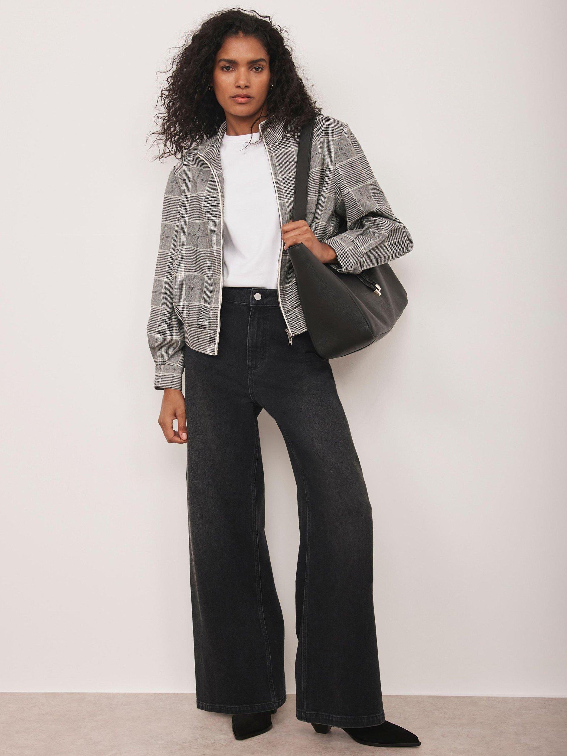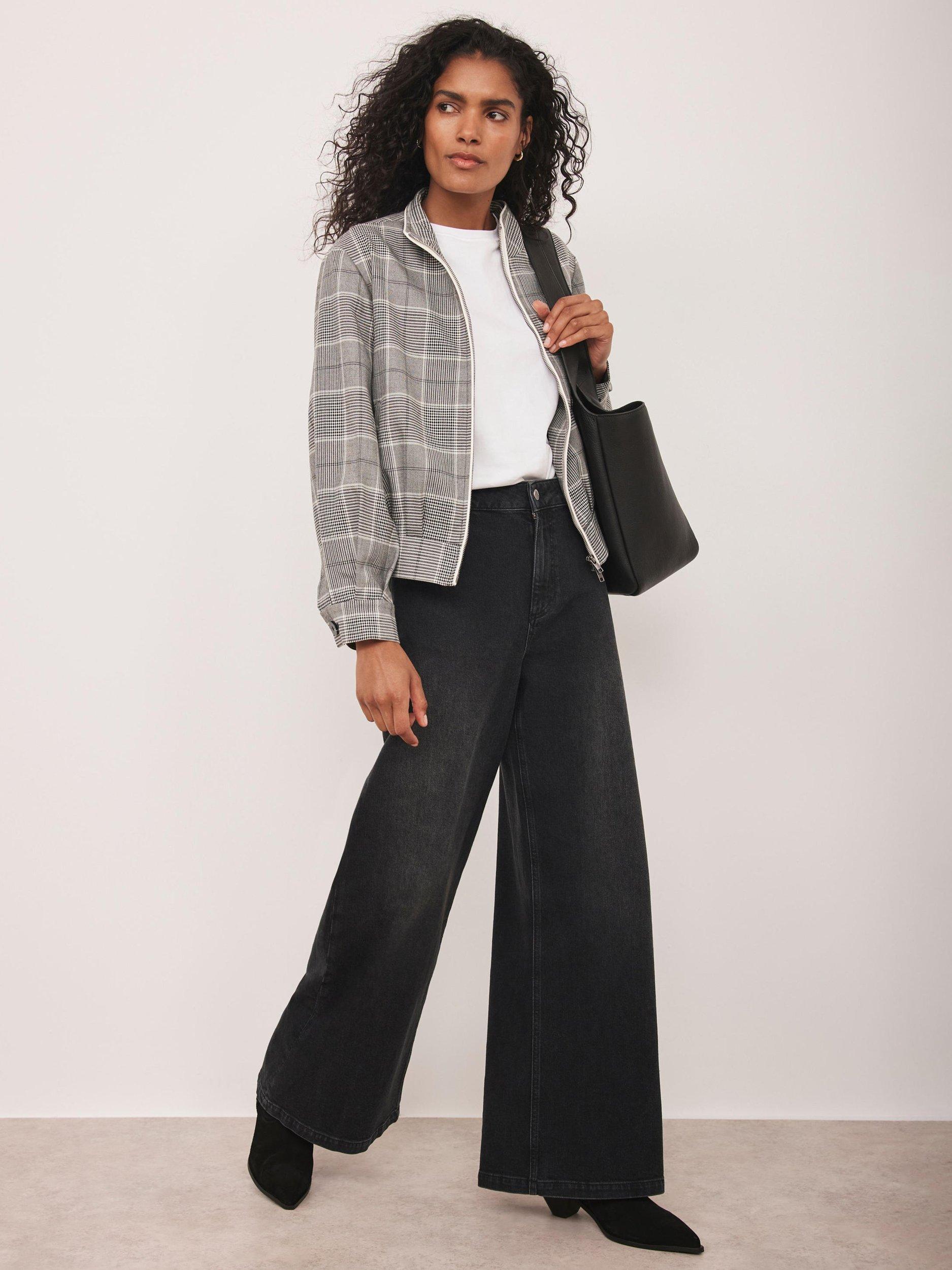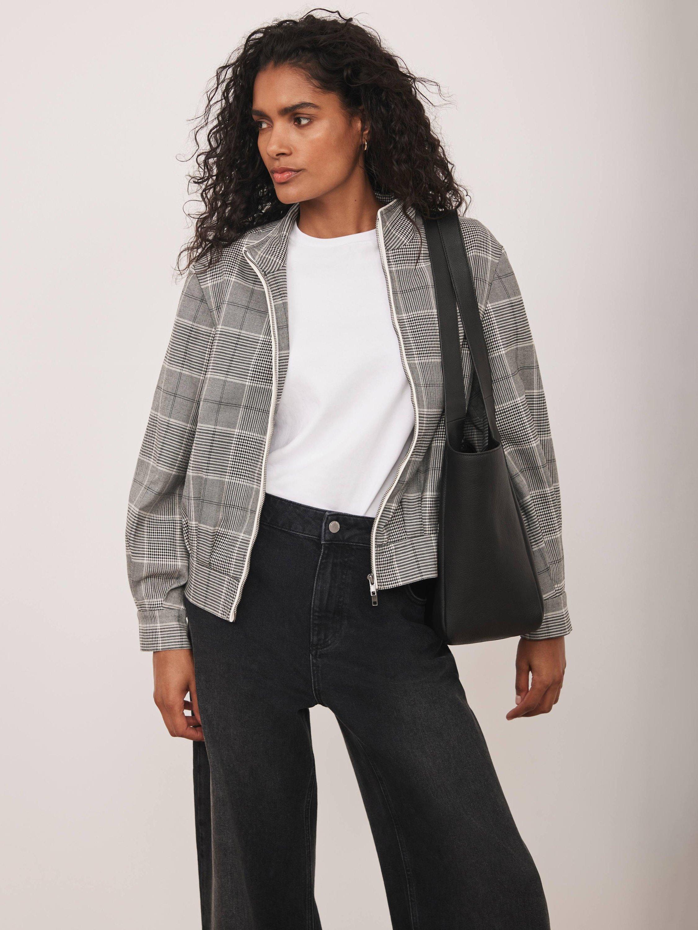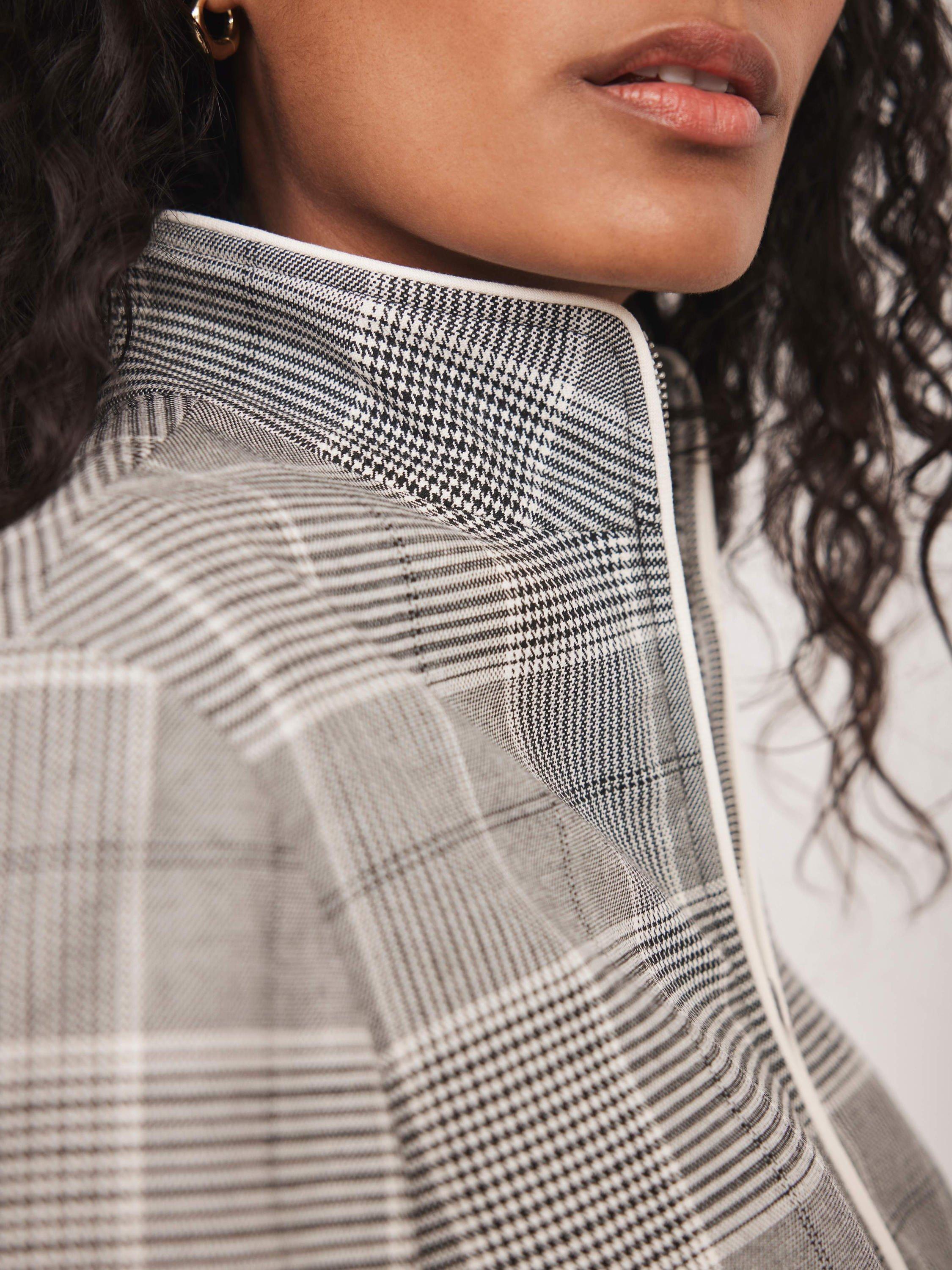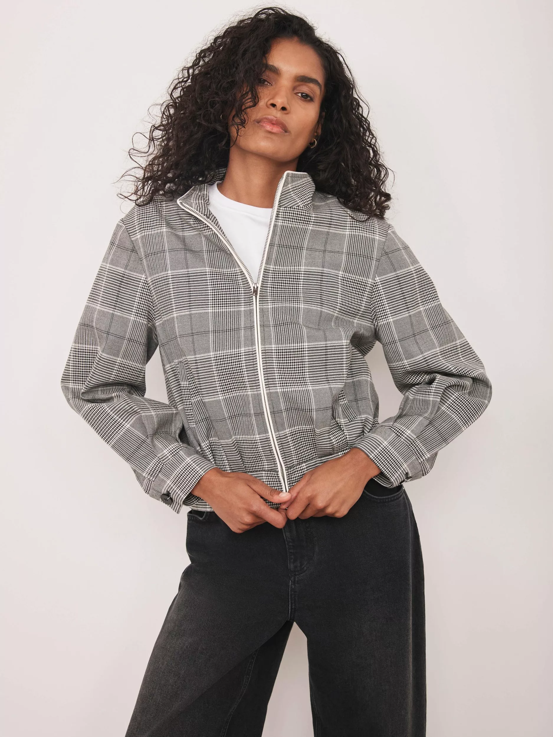 A checked jacket featuring a high neckline, long sleeves, buttoned cuffs, welt pockets, gathered back, contrast trim with a zip fastening through the front.