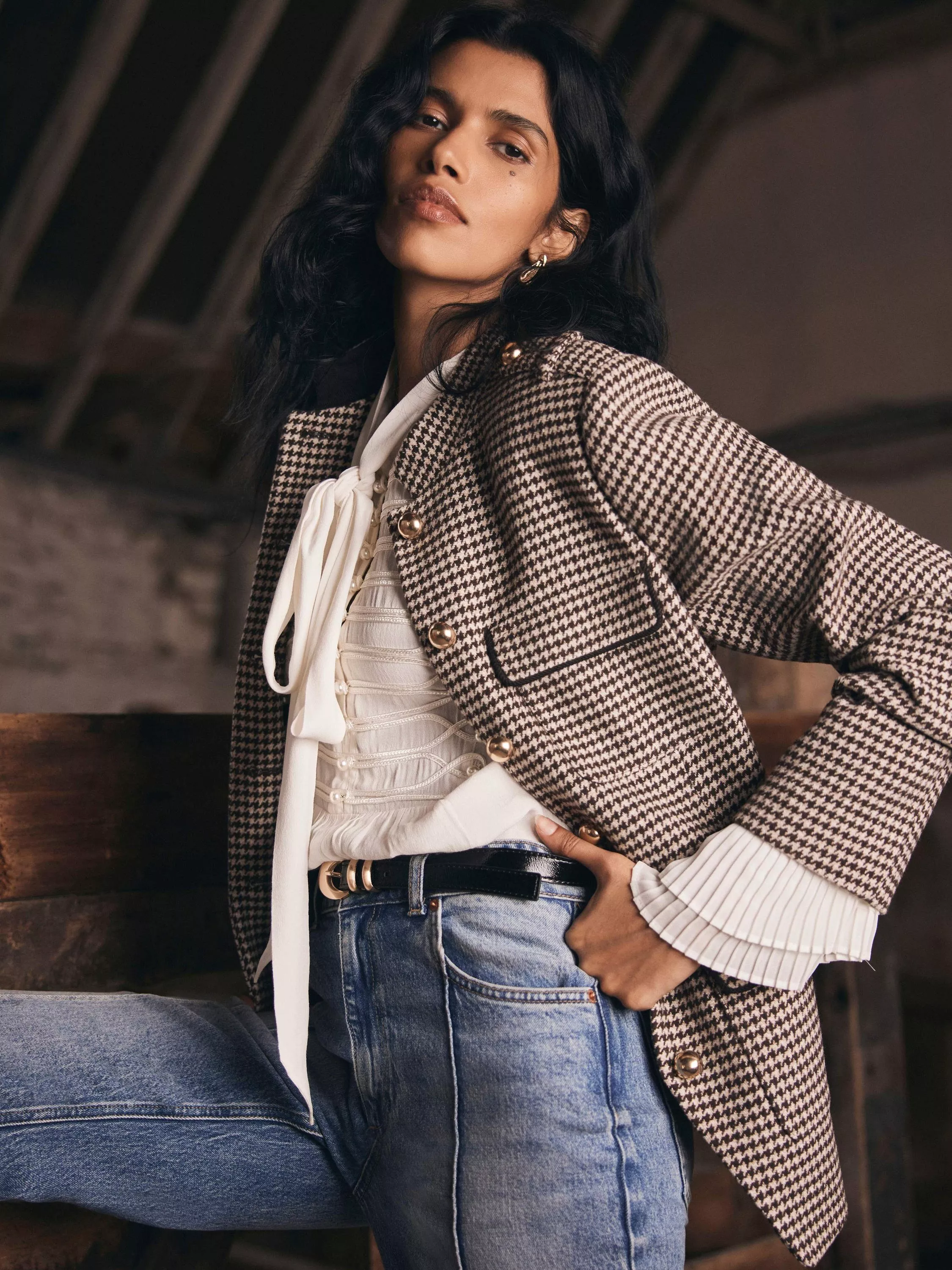 A checked military style jacket featuring a high neckline, button-down epaulettes, flap pockets, long sleeves and metallic-tone button fastenings through the front.