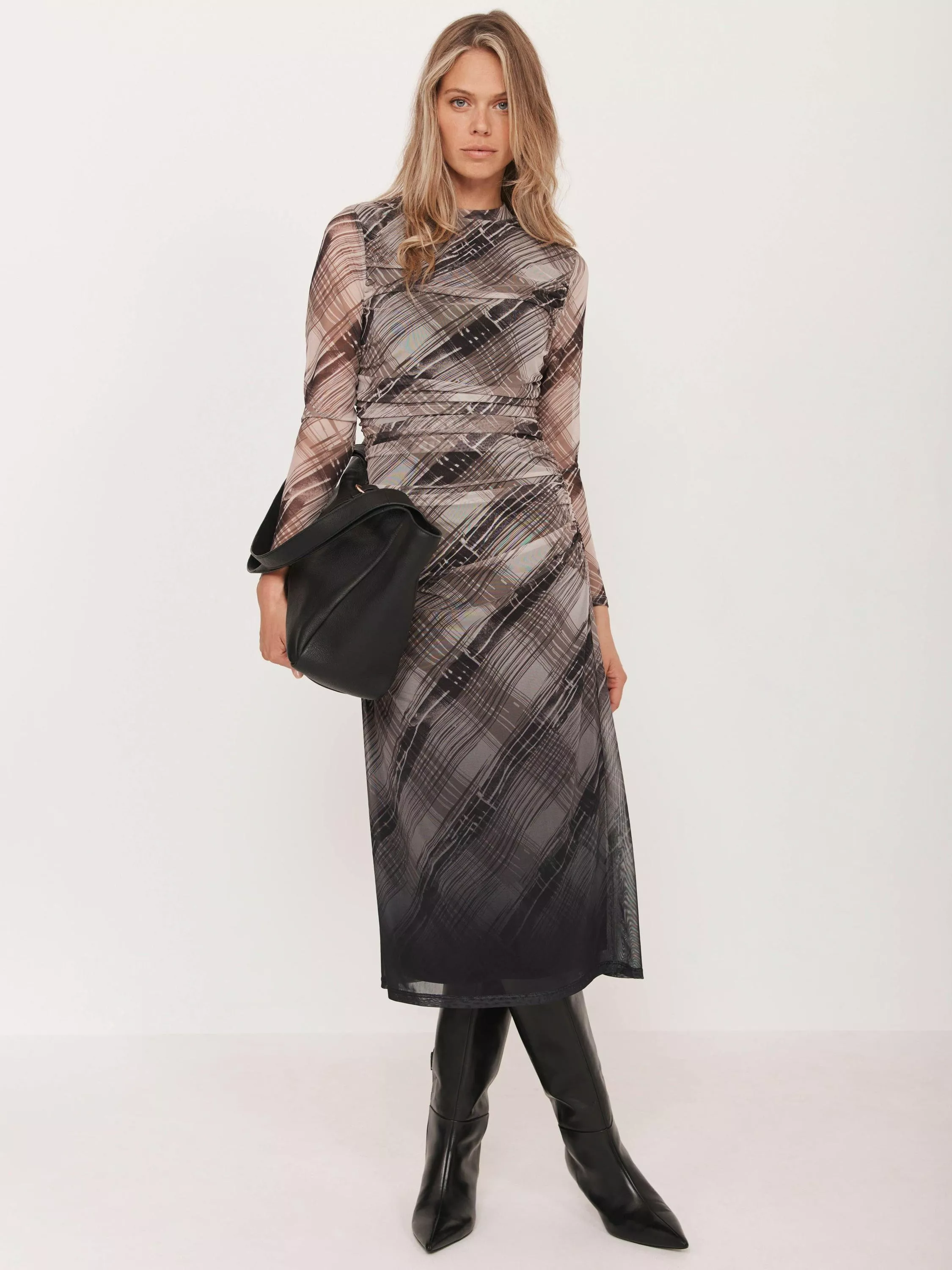 A checked mesh dress in a midi silhouette featuring a crew neckline, long sleeves, ruched detailing and ombre hemline.