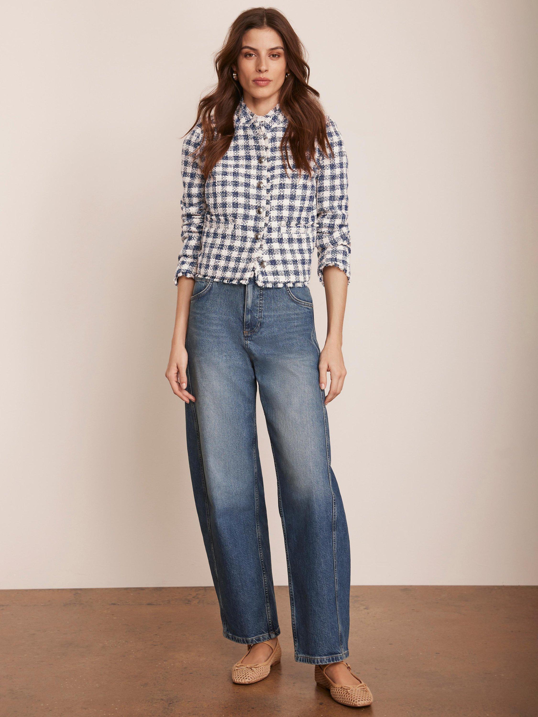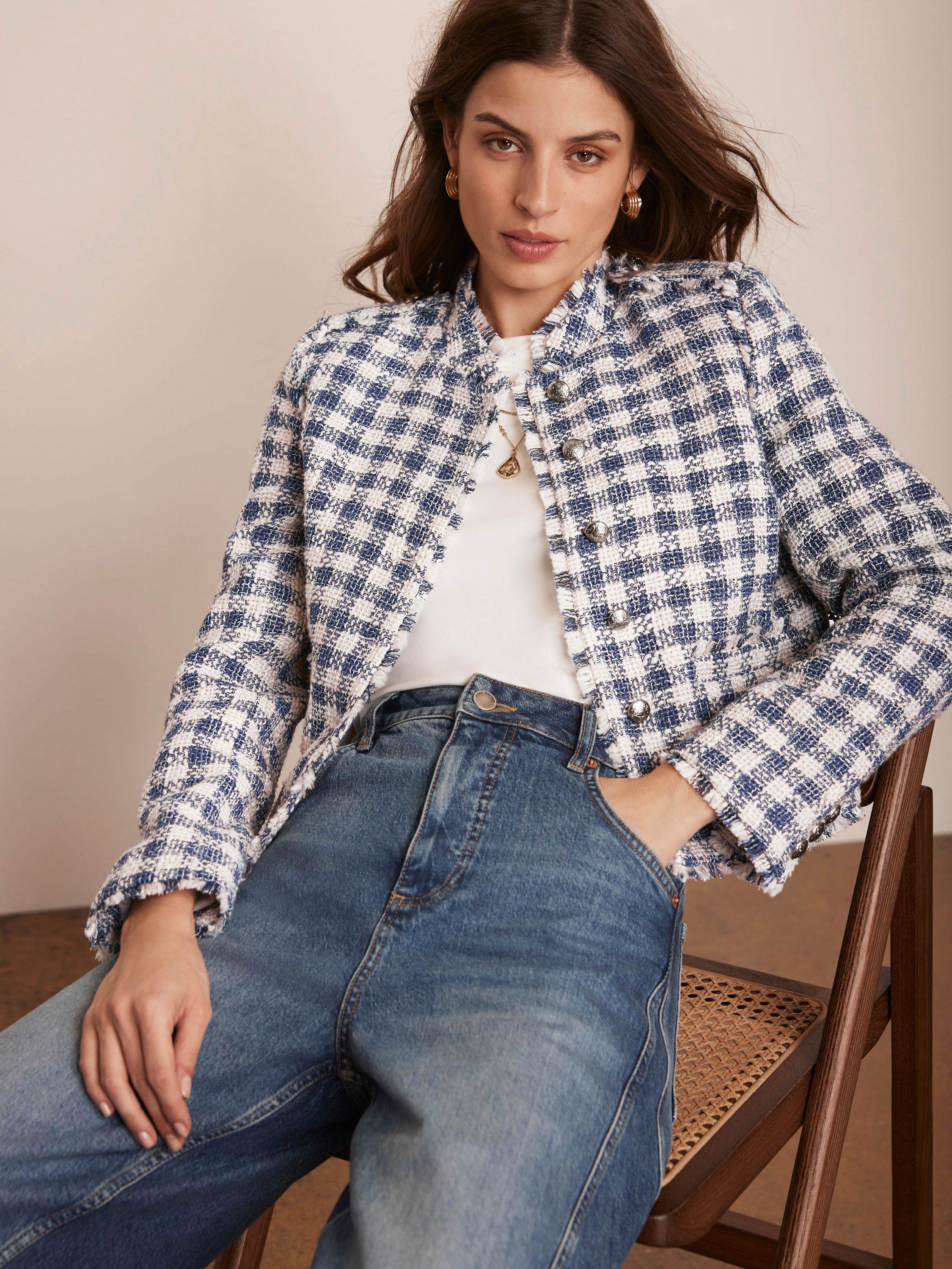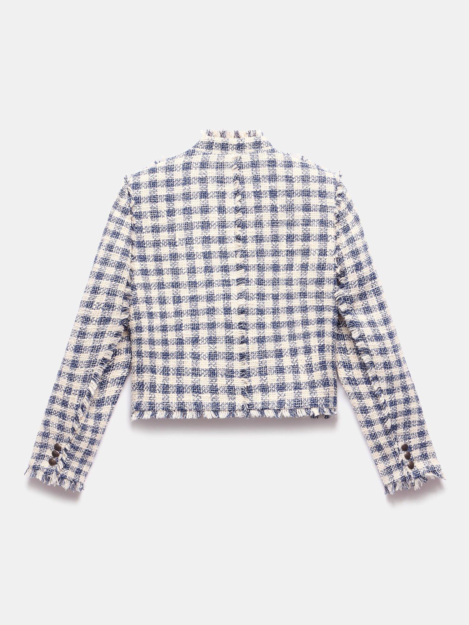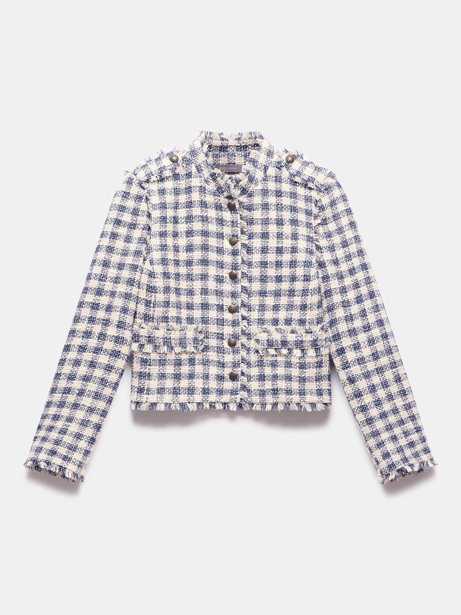 A checked, raw edge boucle jacket with a nehru collar, epaulettes, long sleeves, buttoned cuffs, welt pockets and military-inspired buttons fastening through the front.