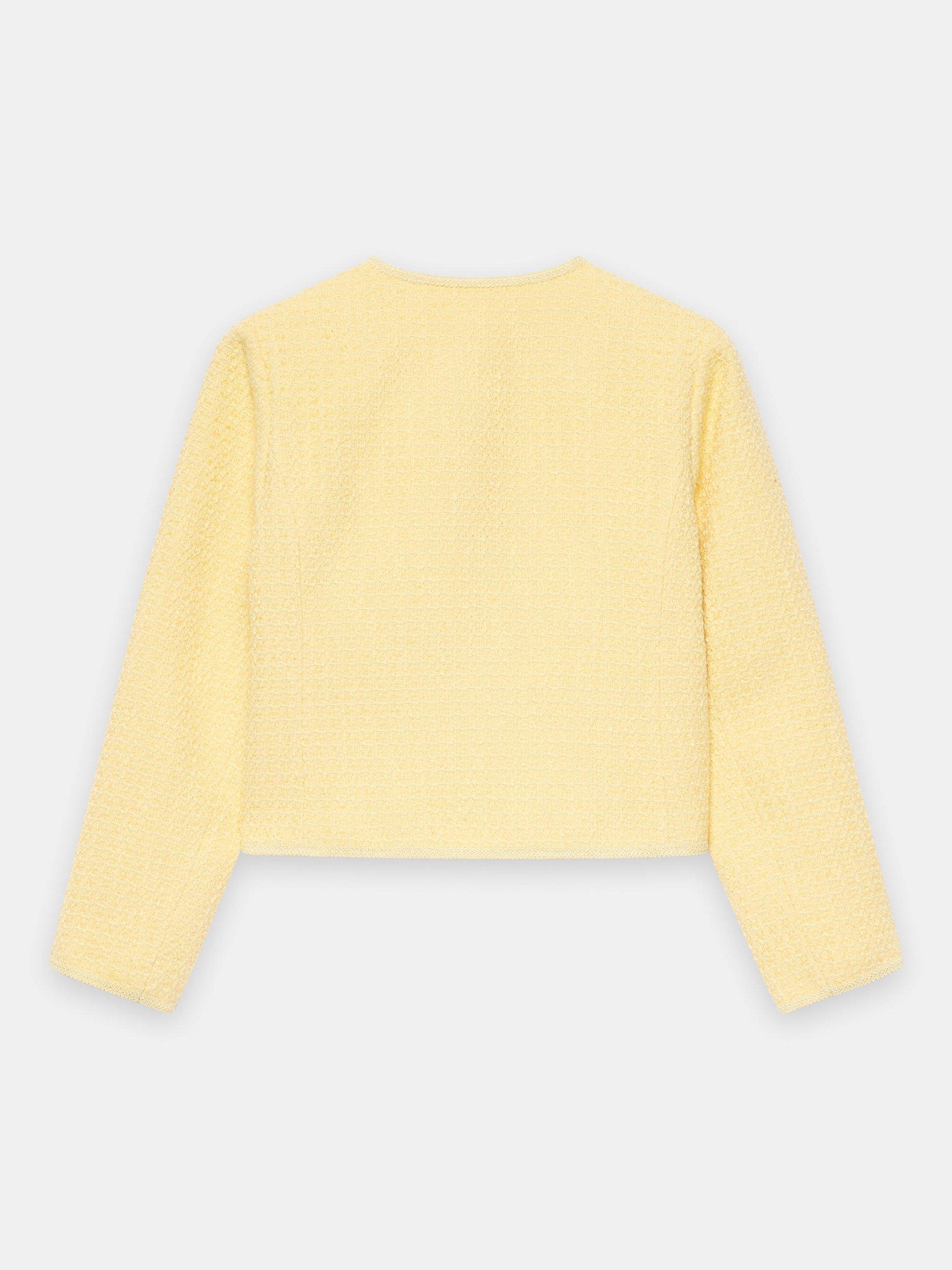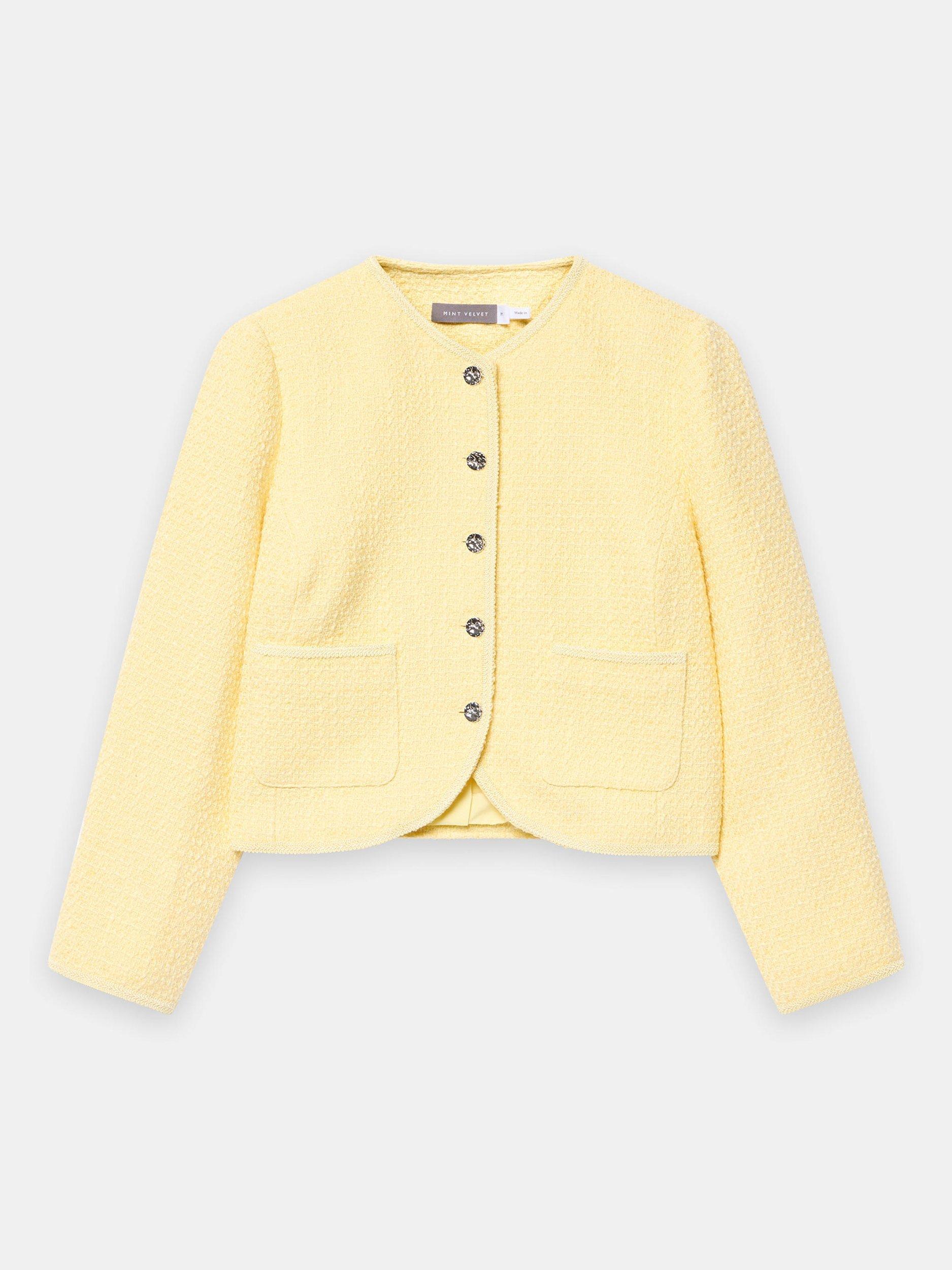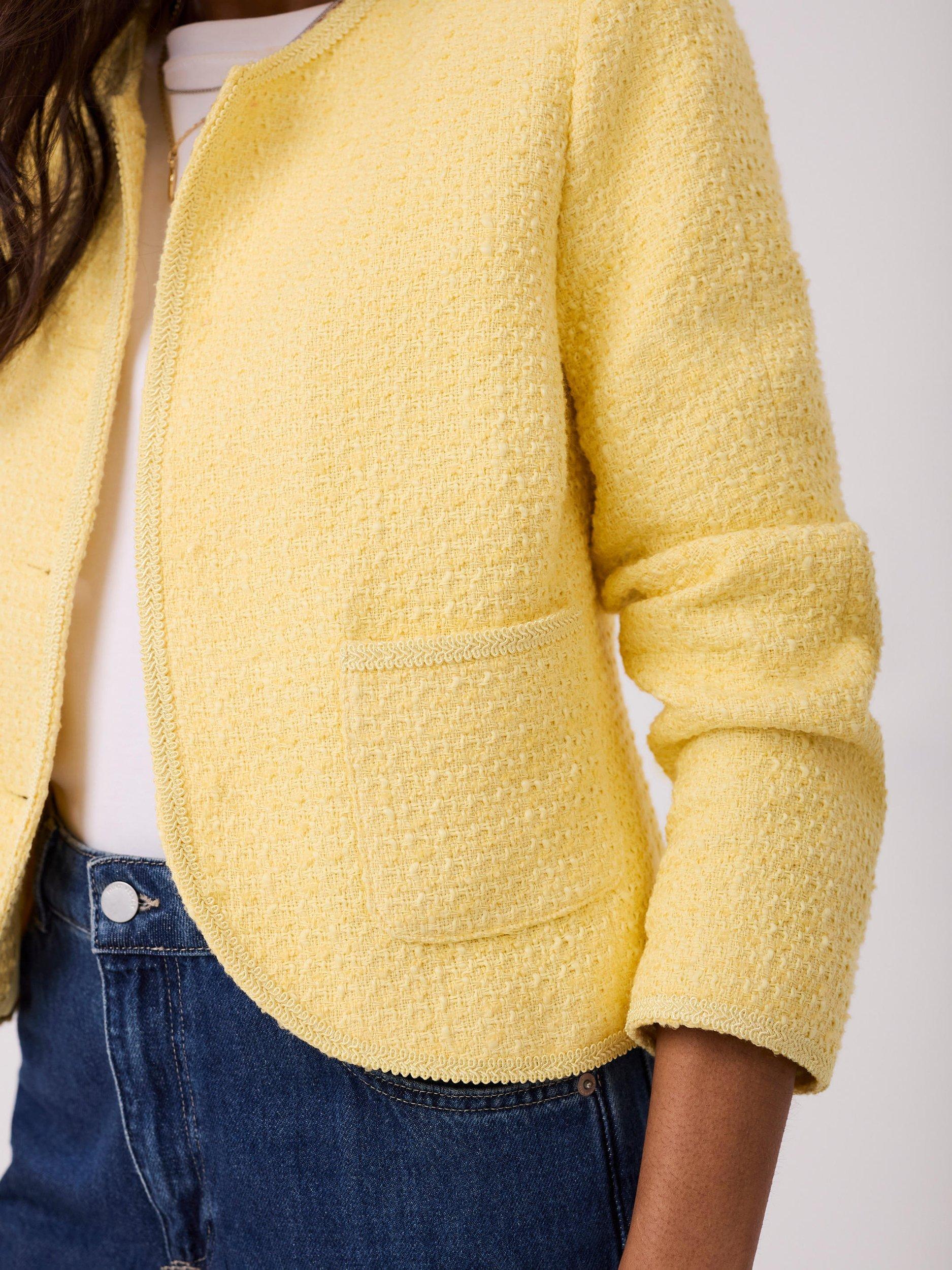 A bouclé jacket featuring a collarless crew neckline, 3/4 length sleeves, square pockets and curved hemline.