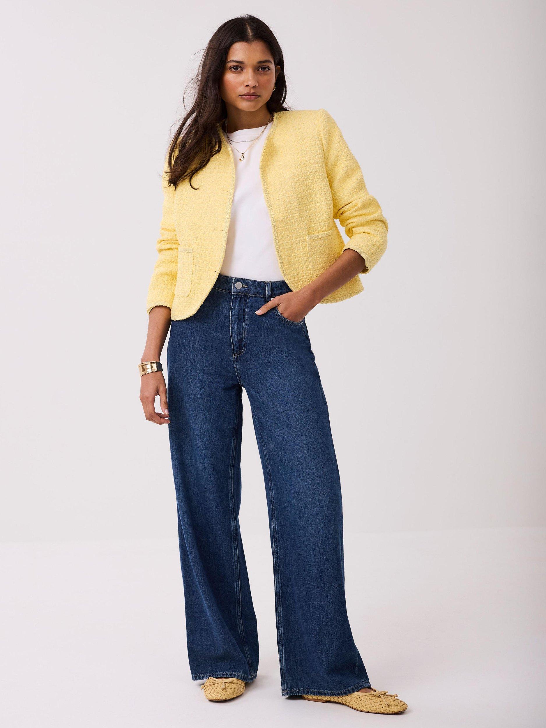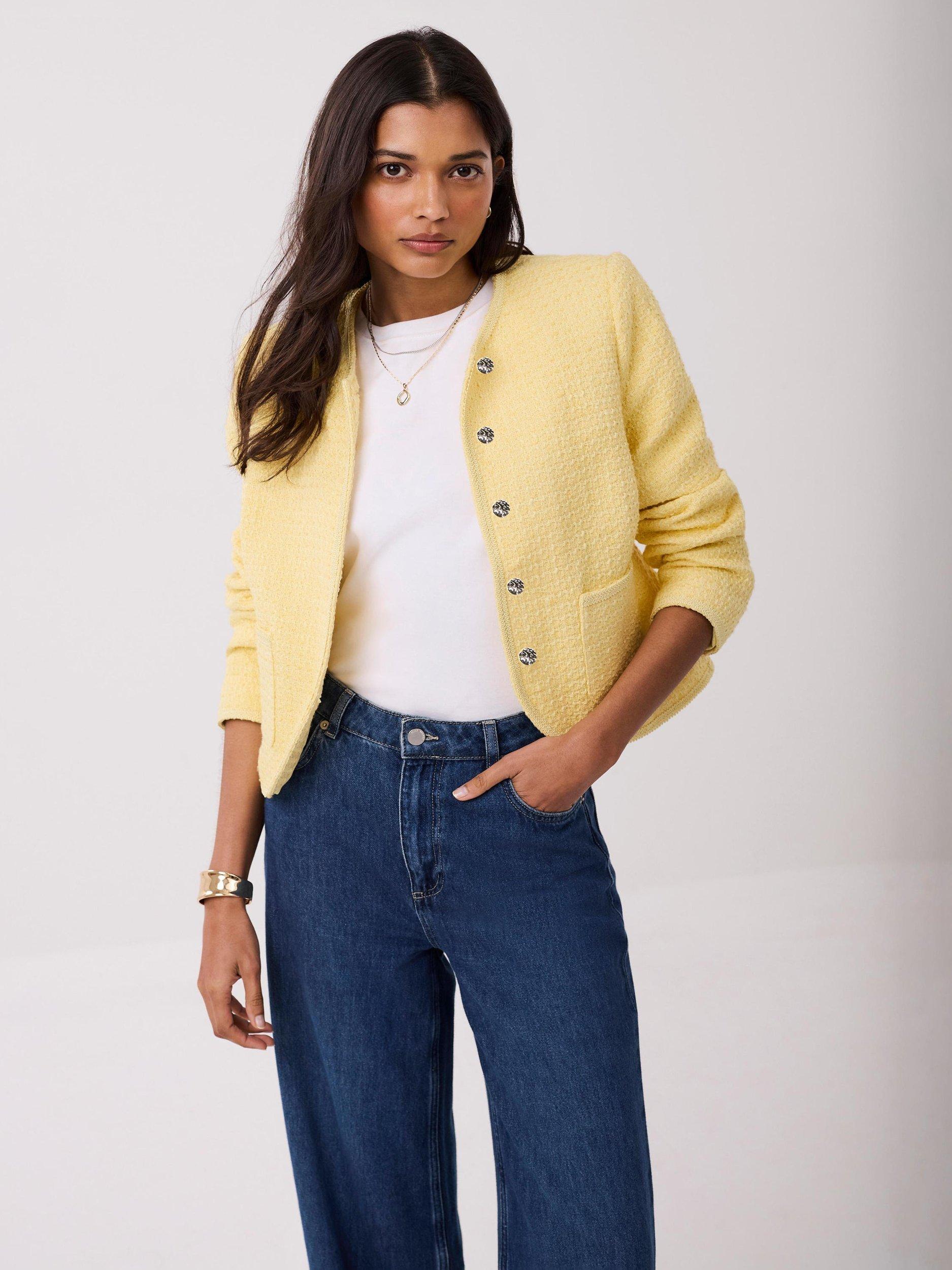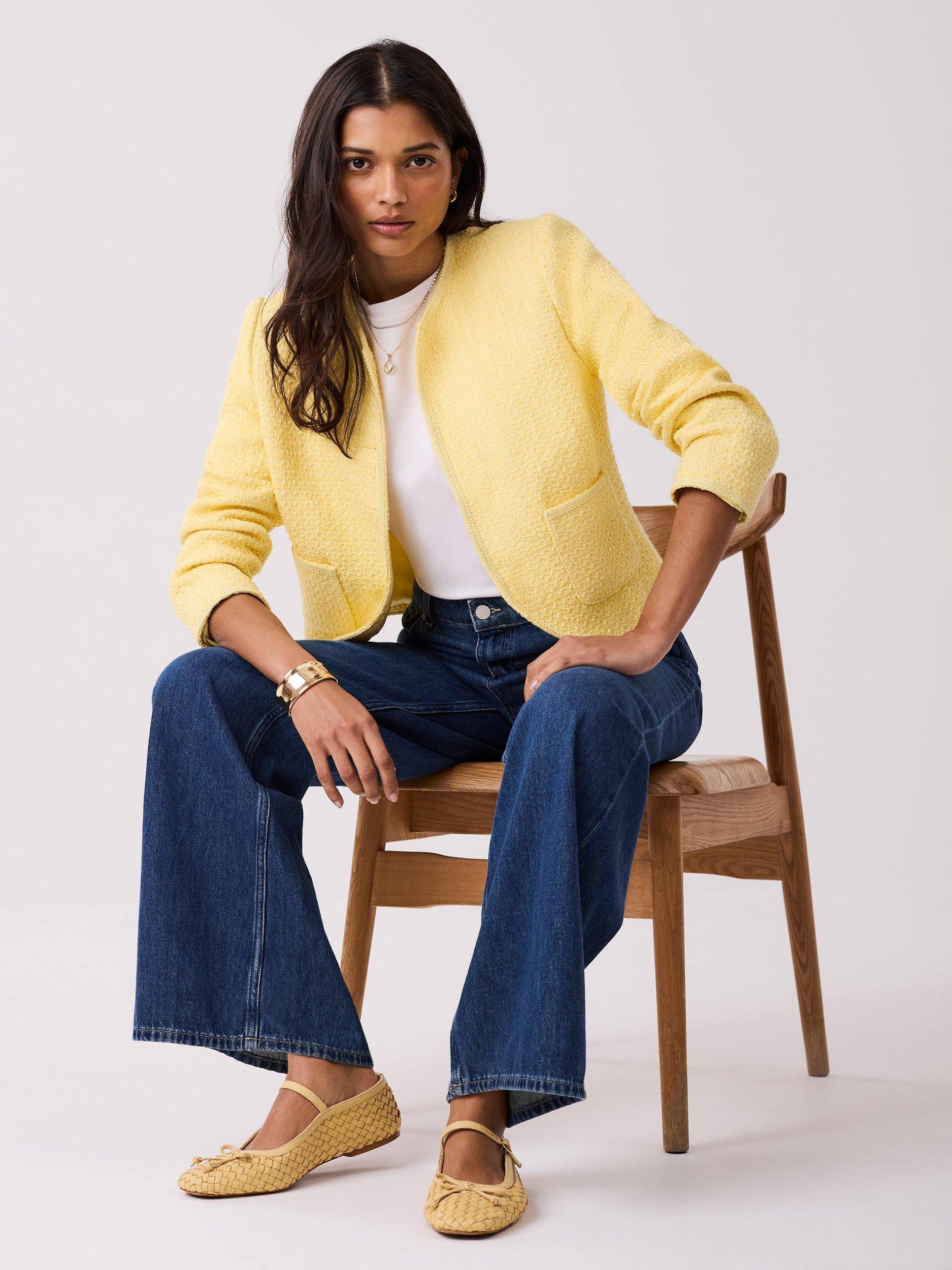 A bouclé jacket featuring a collarless crew neckline, 3/4 length sleeves, square pockets and curved hemline.