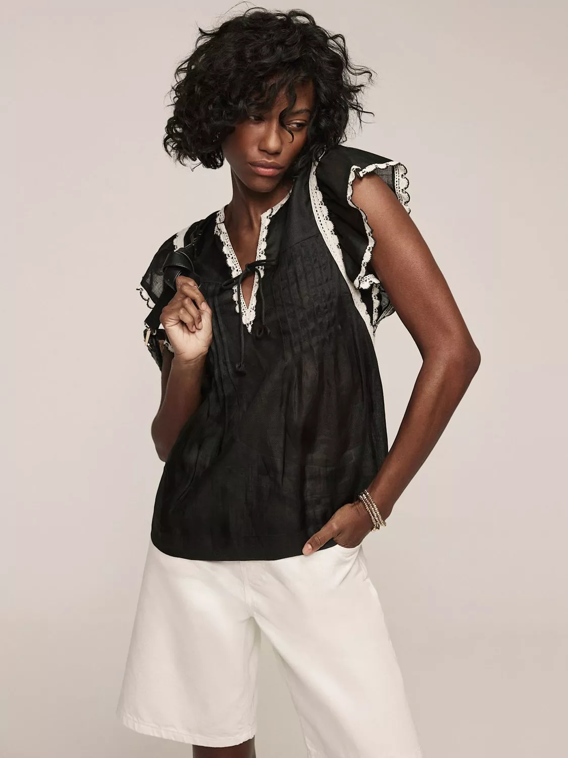 A blouse with a V-neckline, trim edging, pintuck detailing, cap sleeves and a tie fastening through the front.