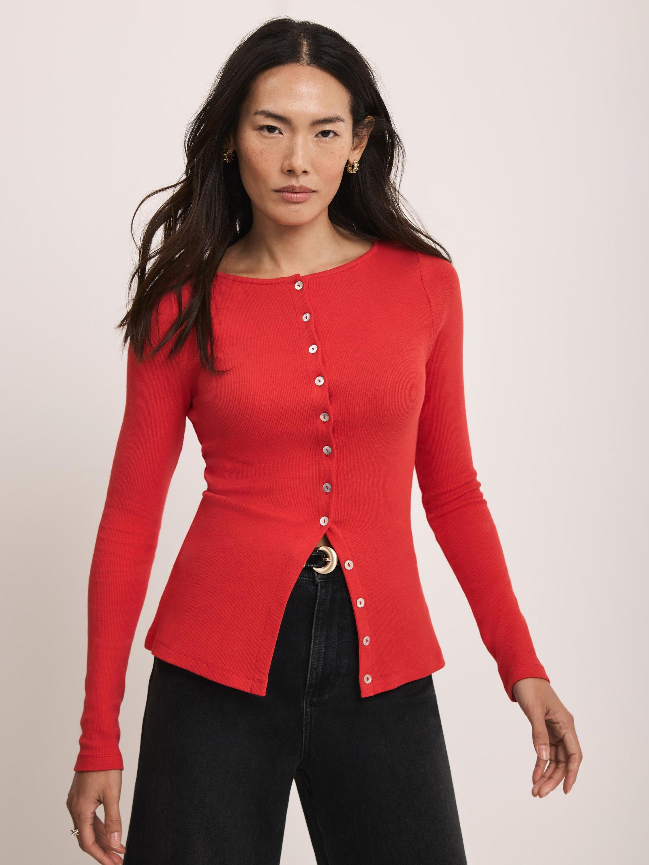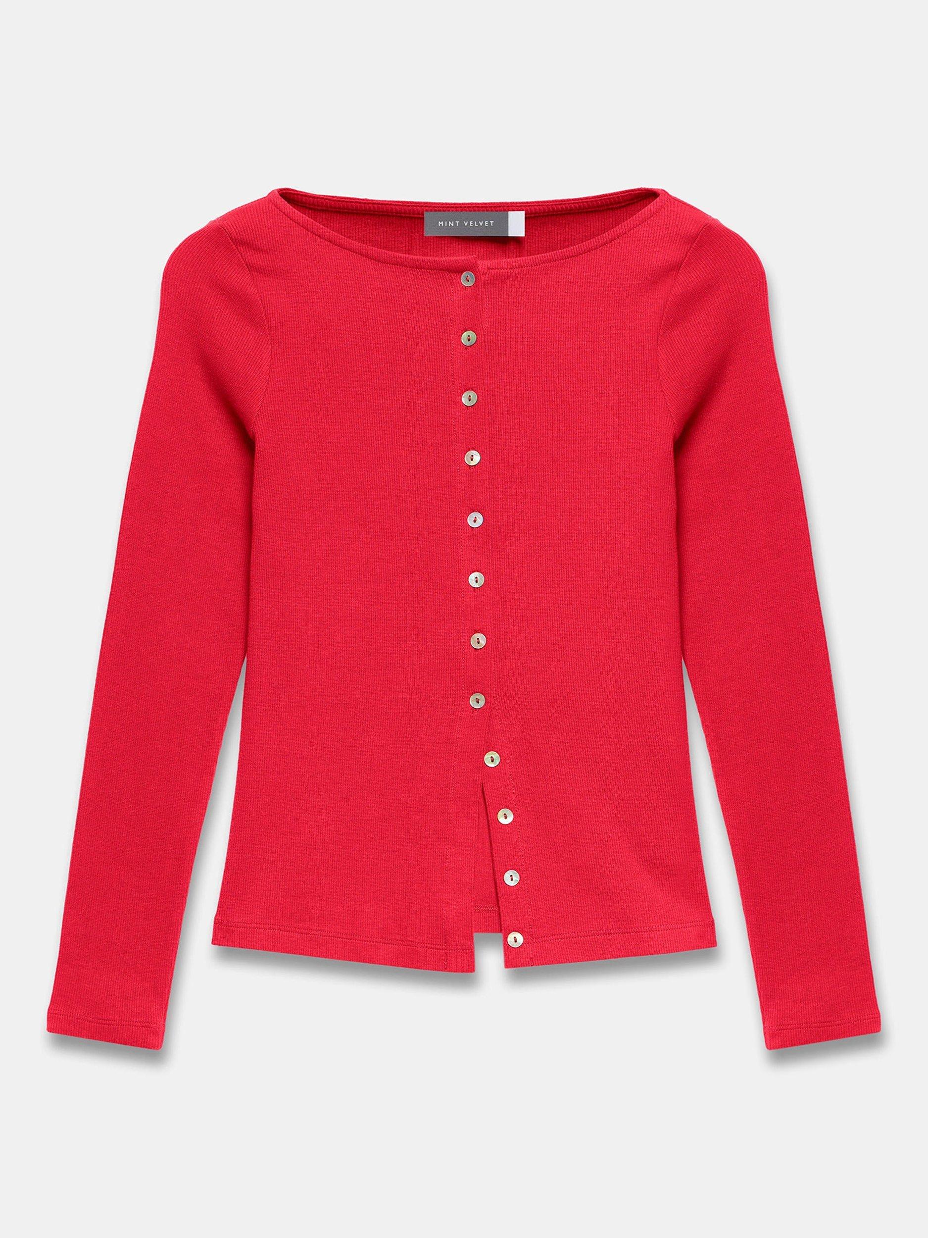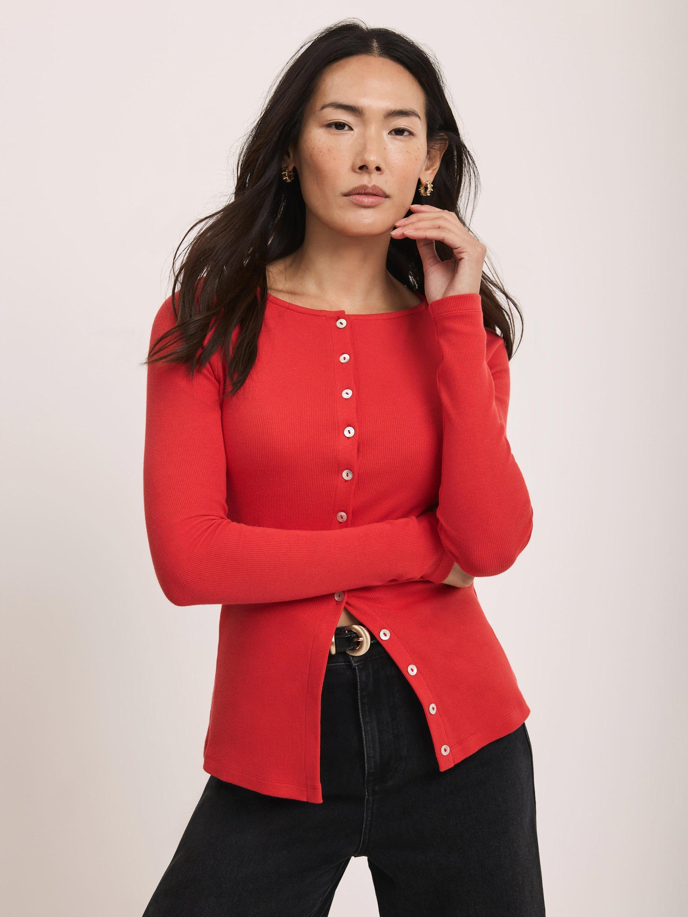 Red top featuring a crew neckline, long sleeves and button fastening through the front.