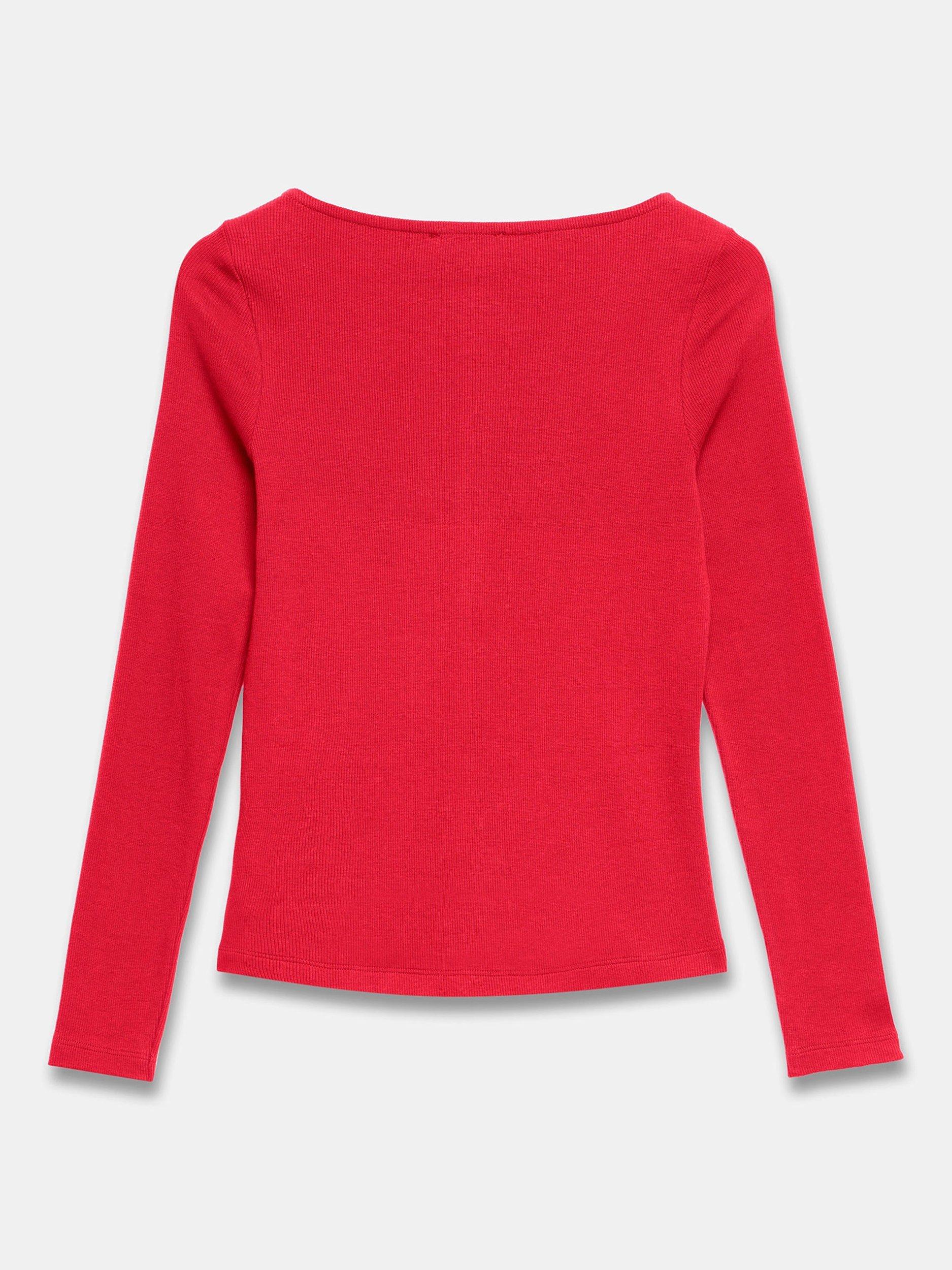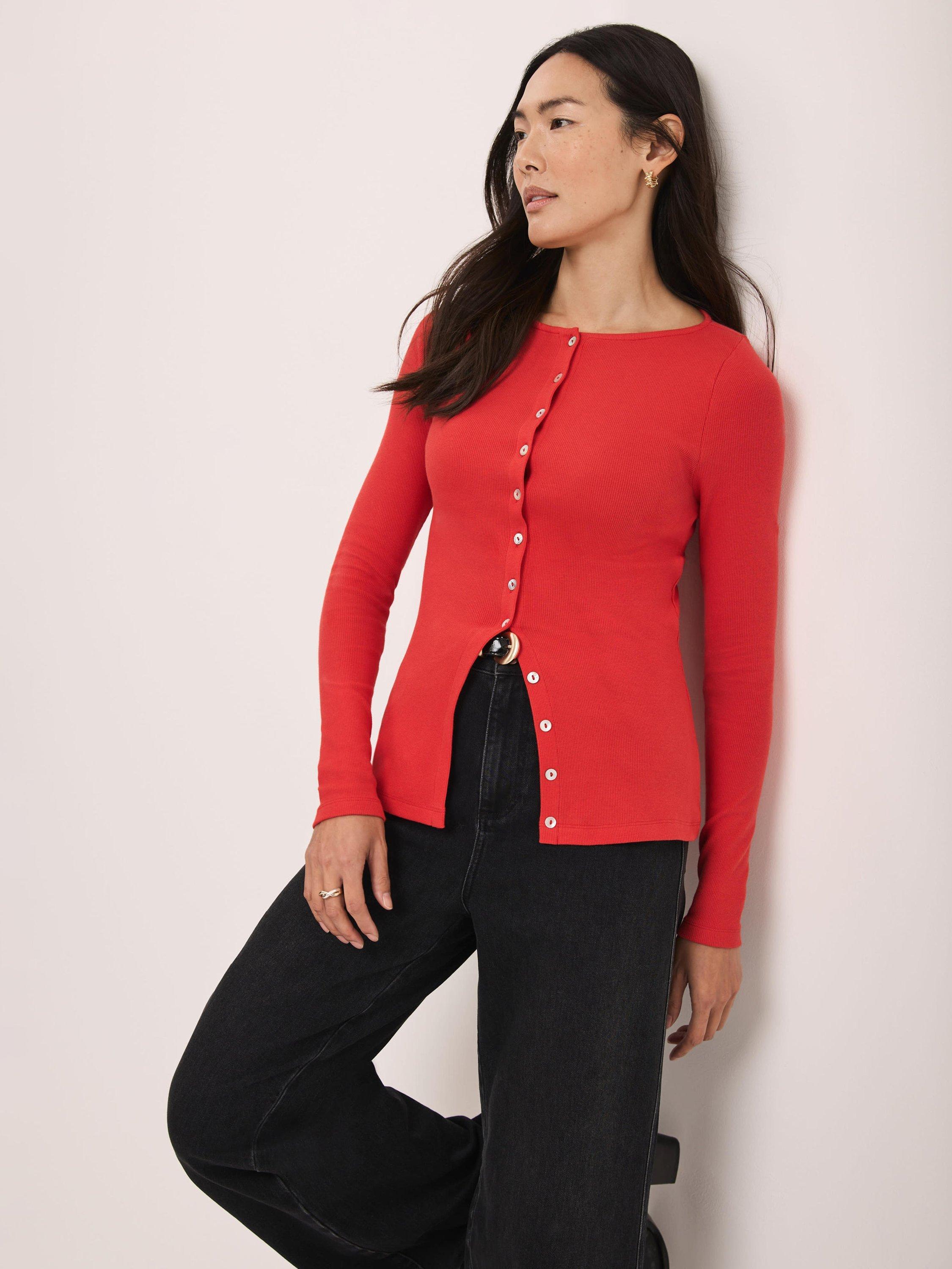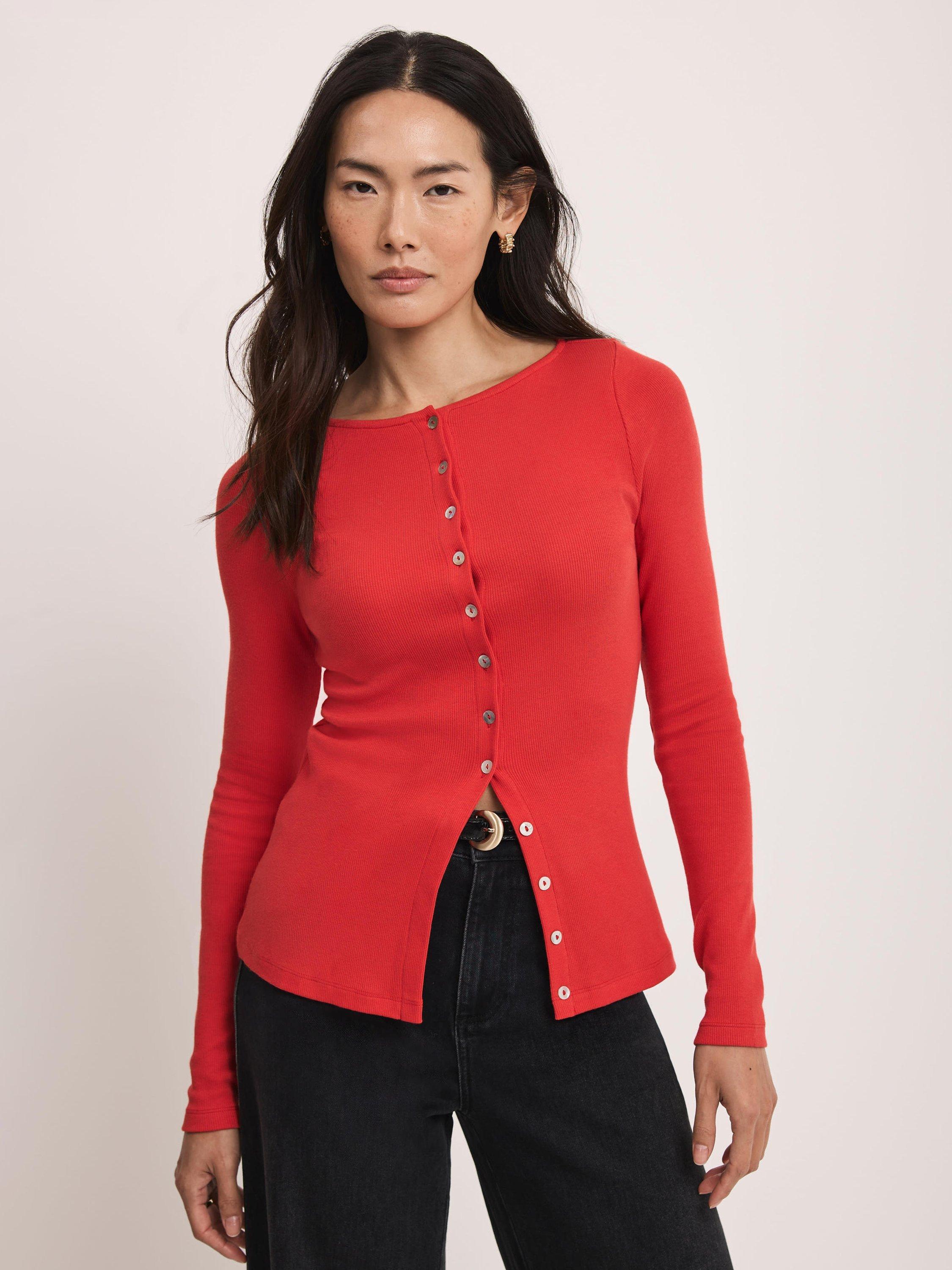 Red top featuring a crew neckline, long sleeves and button fastening through the front.