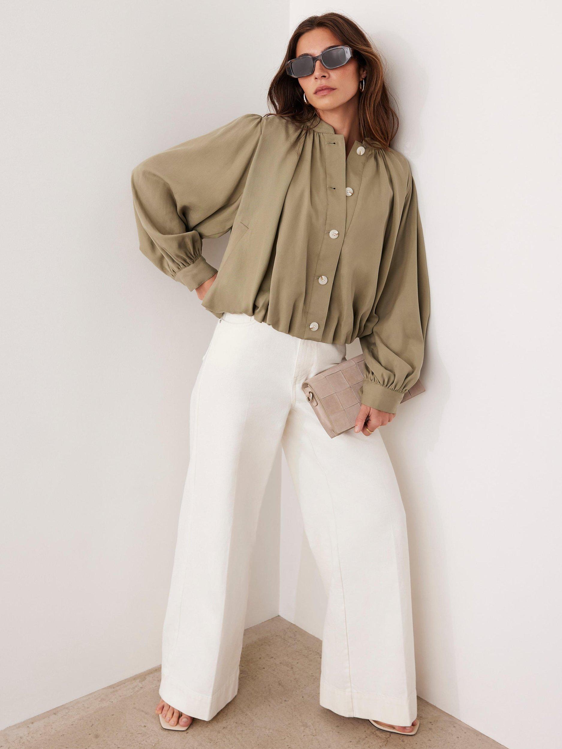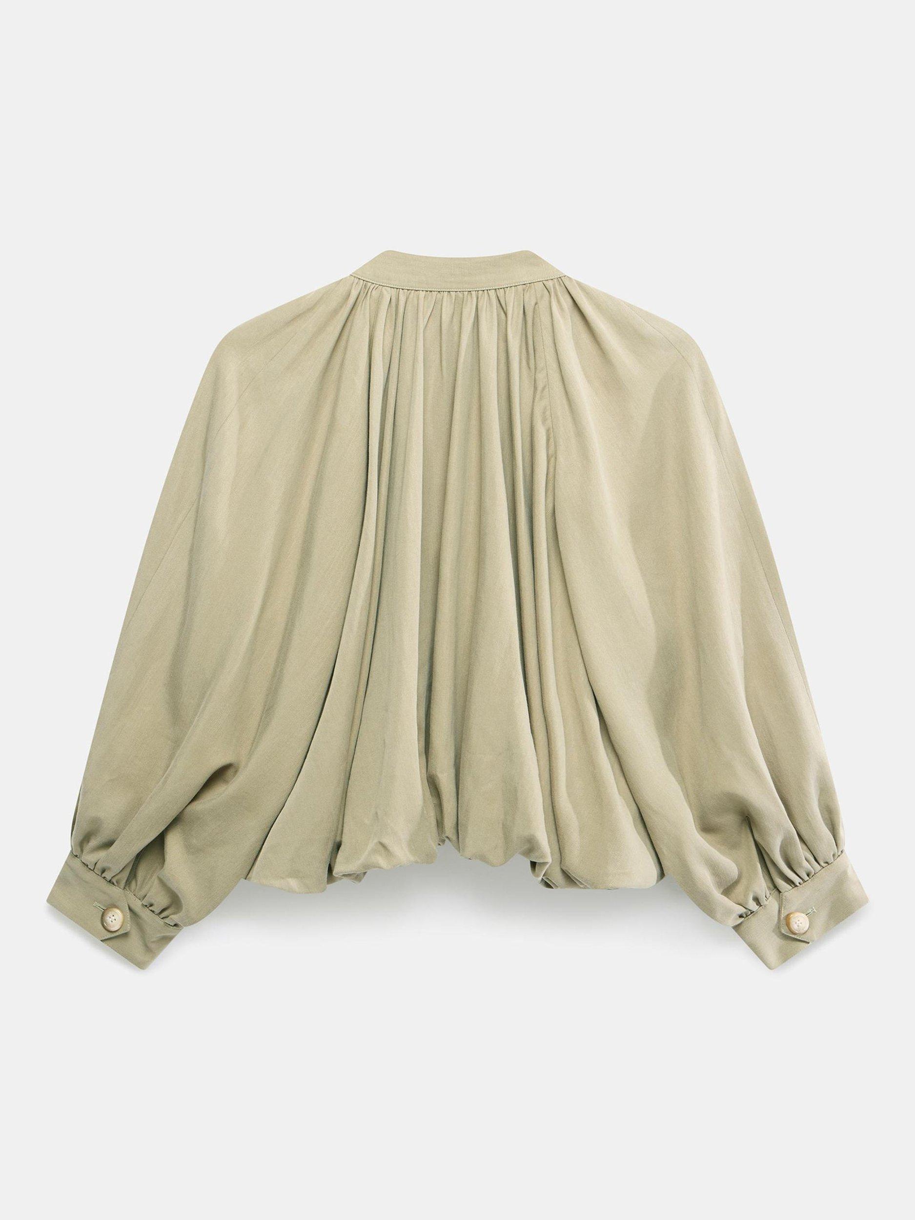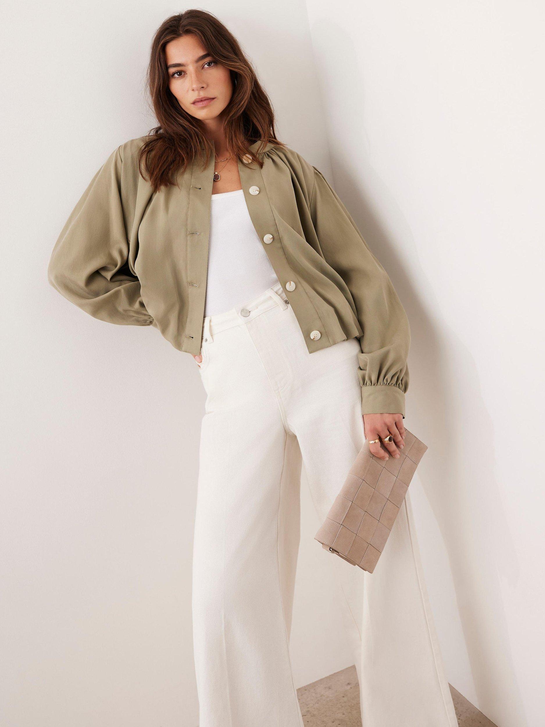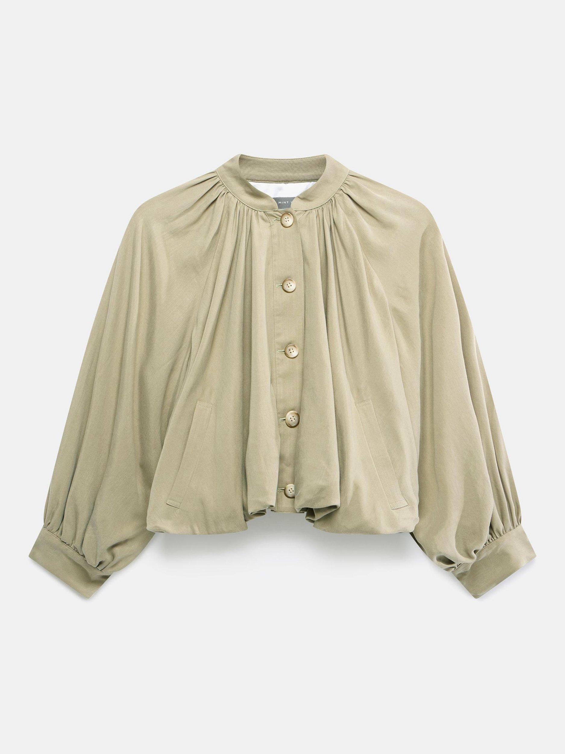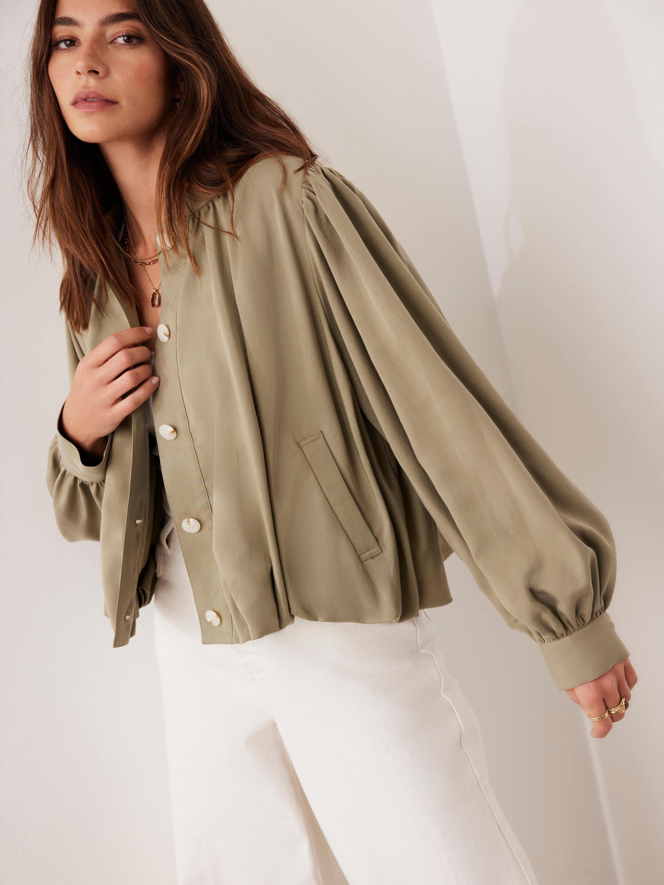 A lightweight jacket in a cropped silhouette featuring a crew neckline, long blouson sleeves, bubble waistband, welt pockets with a button fastening through the front.