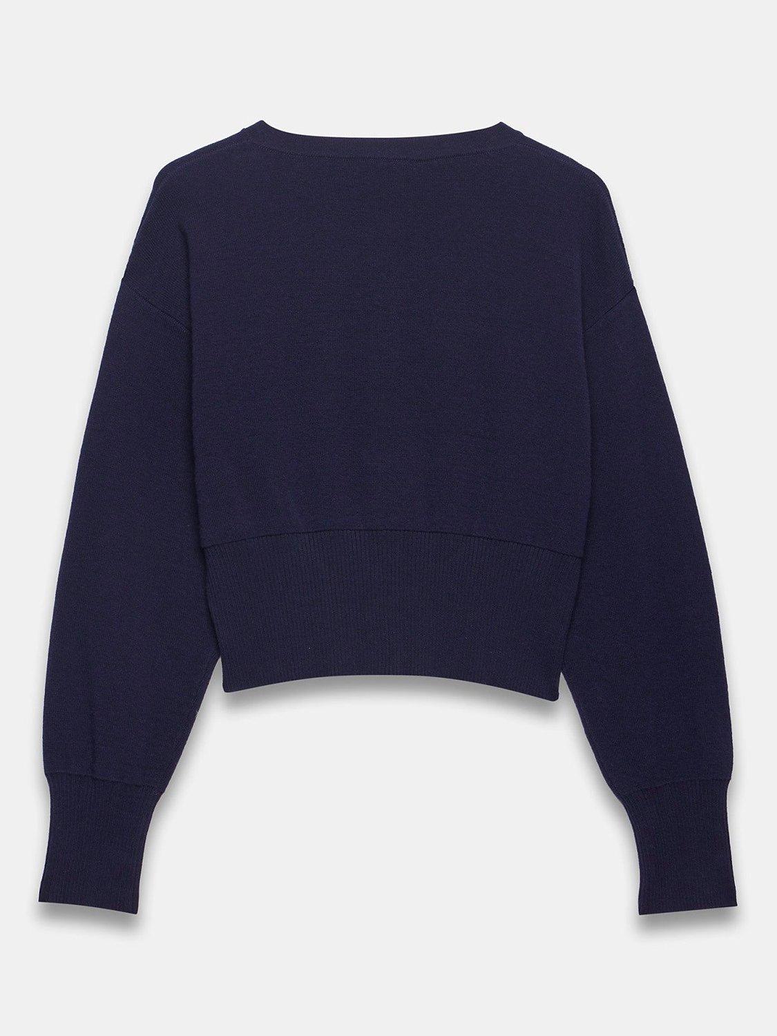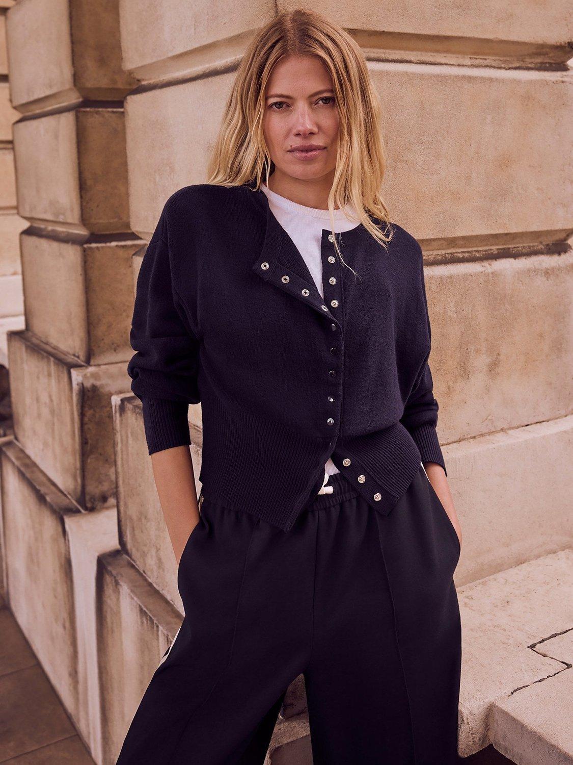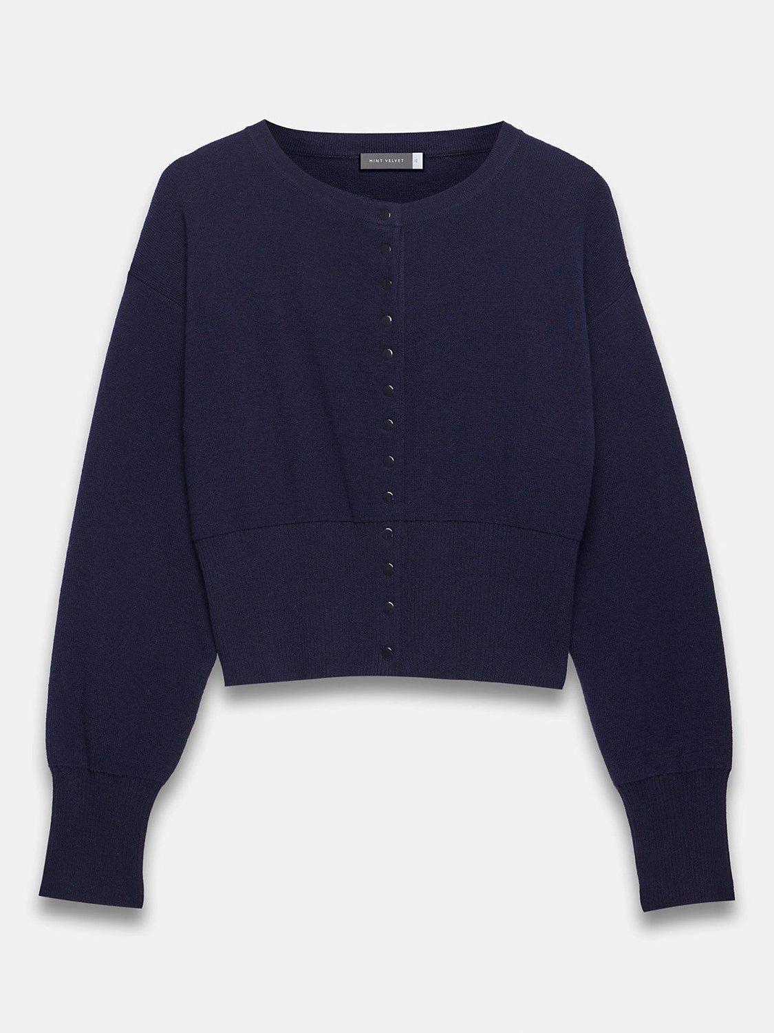 A cropped cardigan featuring a crew neckline, long sleeves, exaggerated waistband and a button fastening through the front.
