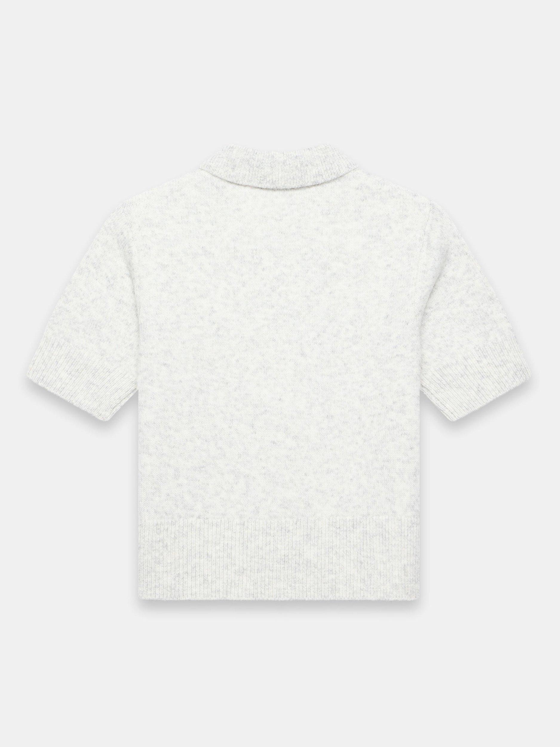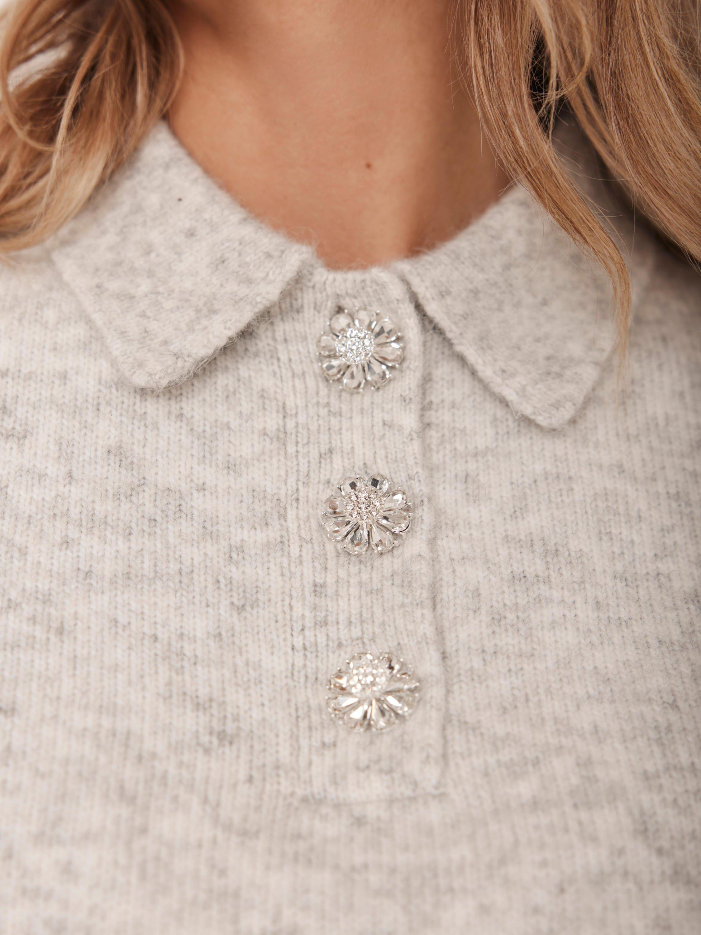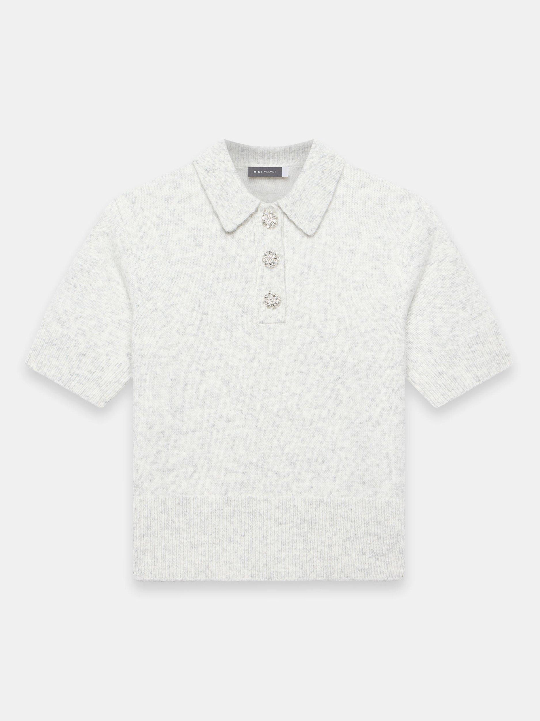 A knit top with a classic collar, short sleeves and crystal button fastenings through the front.