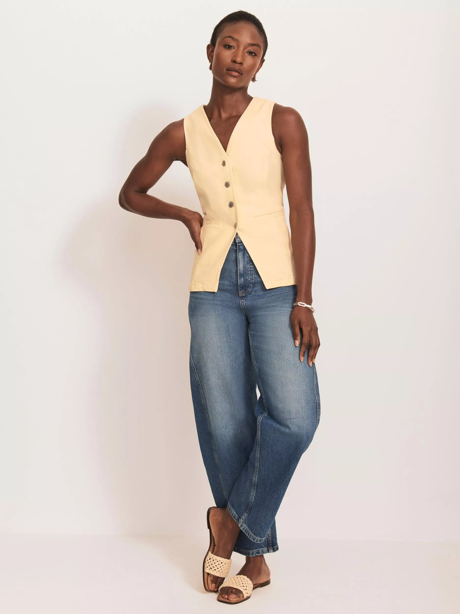 Pale toned waistcoat featuring a V-neckline, welt pockets, adjustable back strap with silver-tone button fastenings through the front.