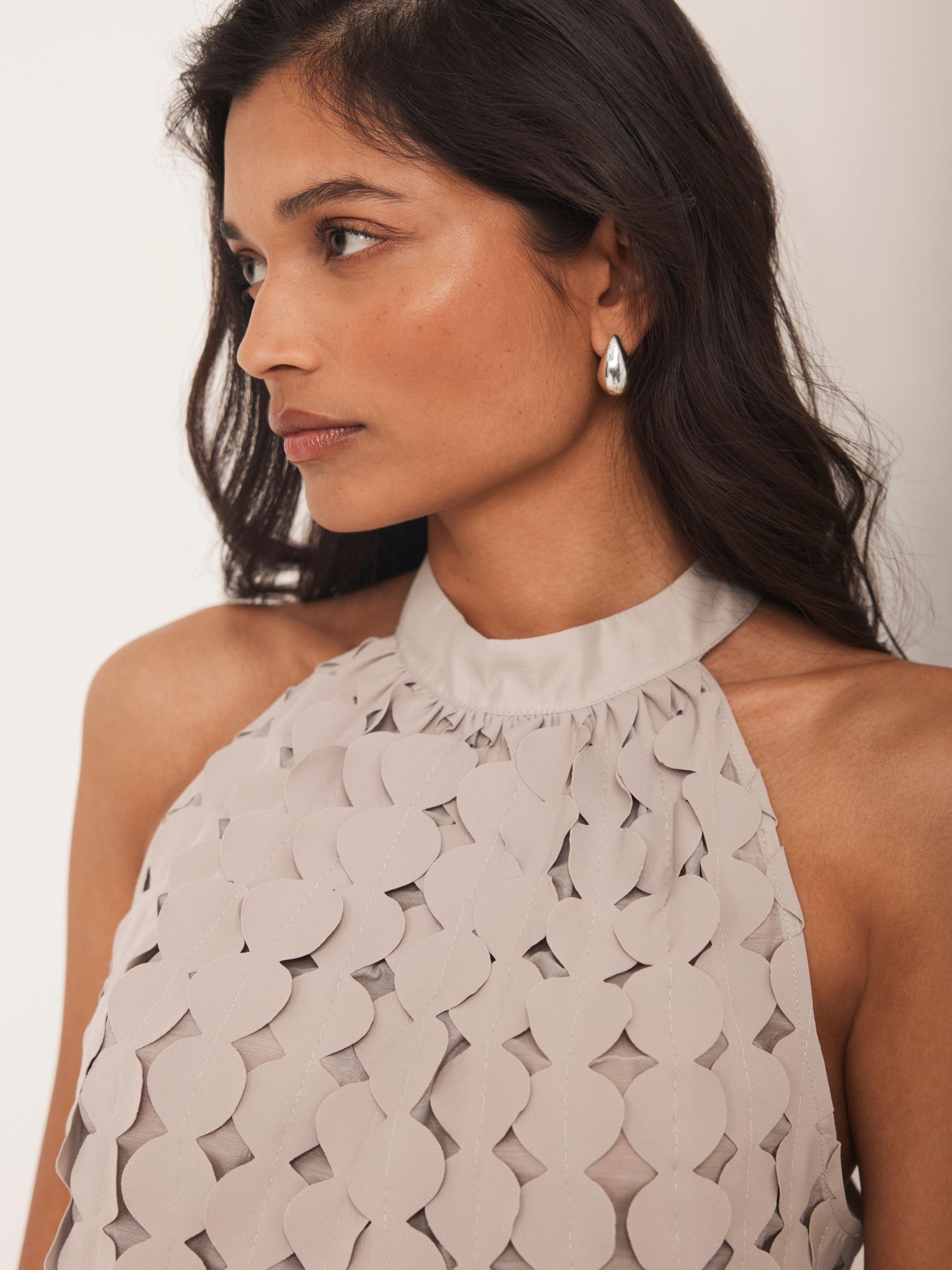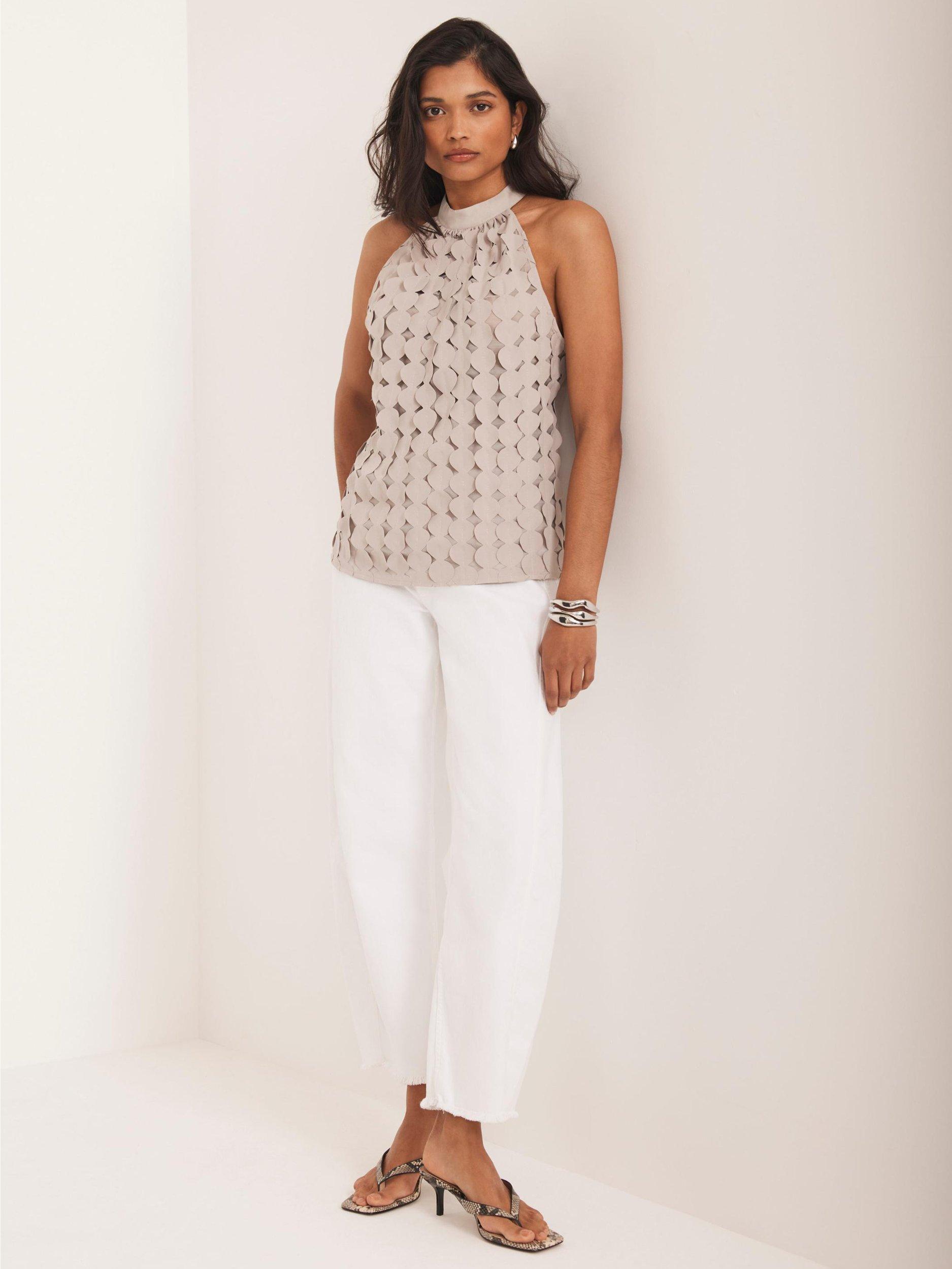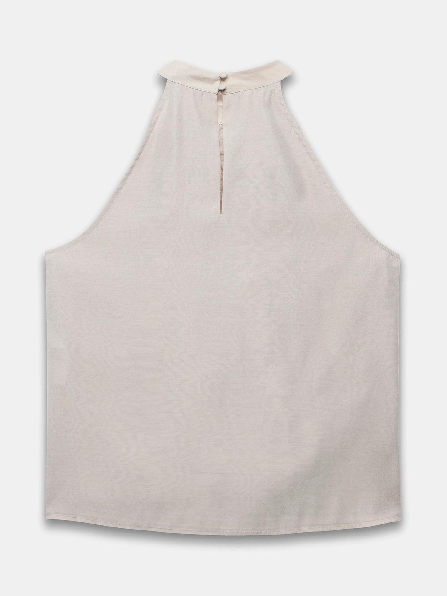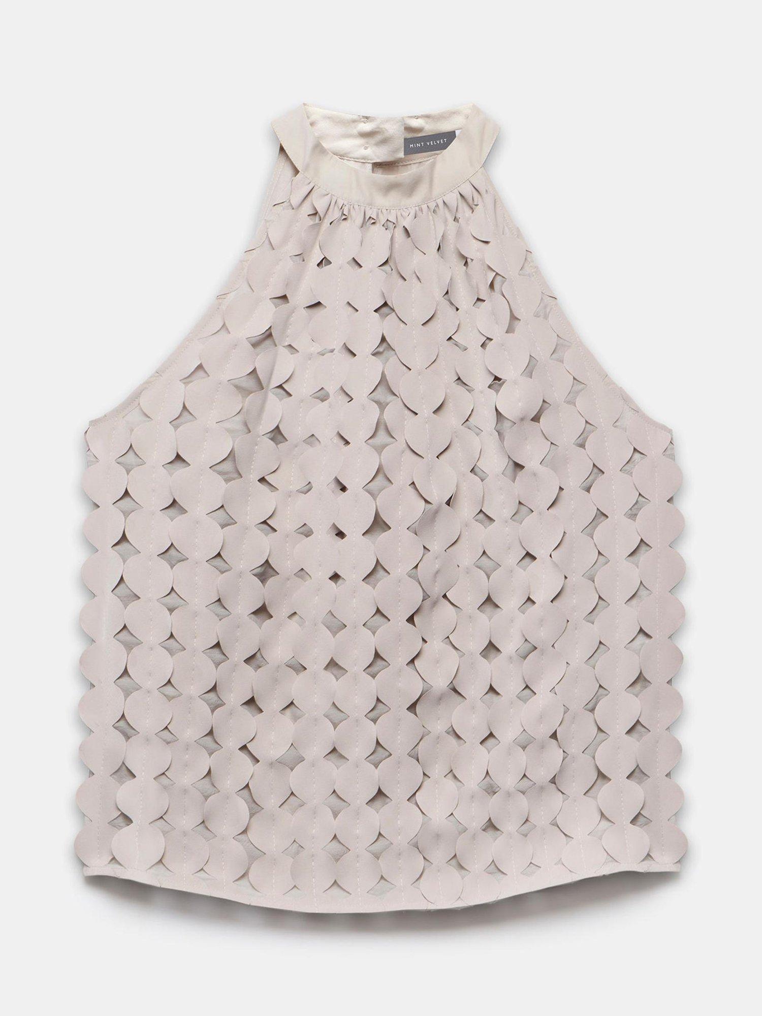 A sleeveless top with a halter neckline, cut-out disc design with a button fastening through the back, for a truly one-of-a-kind look.