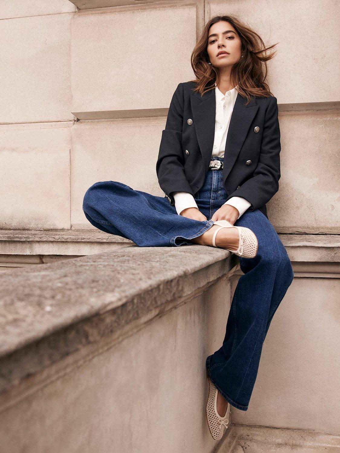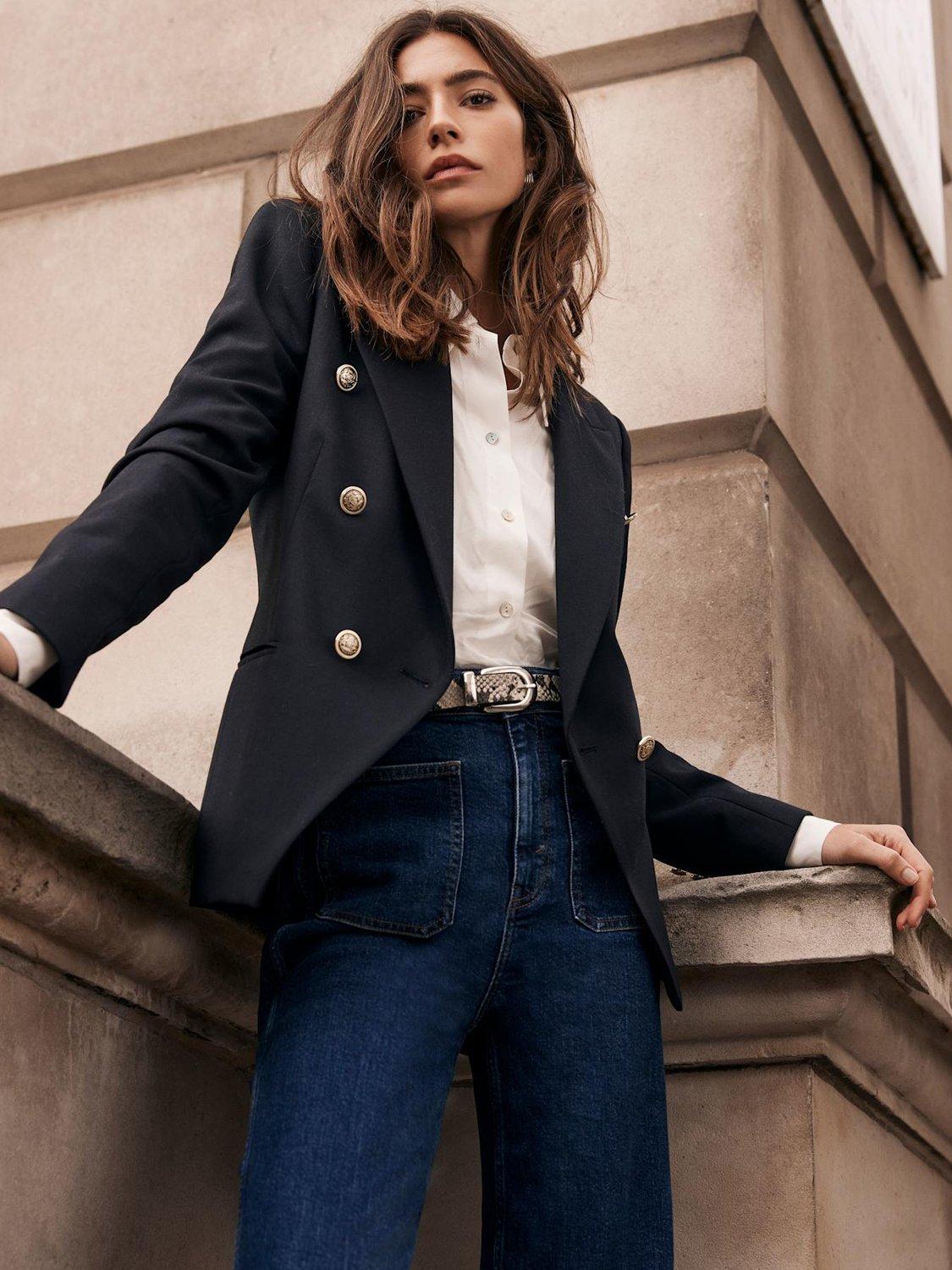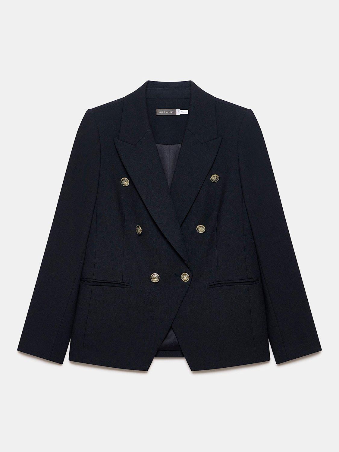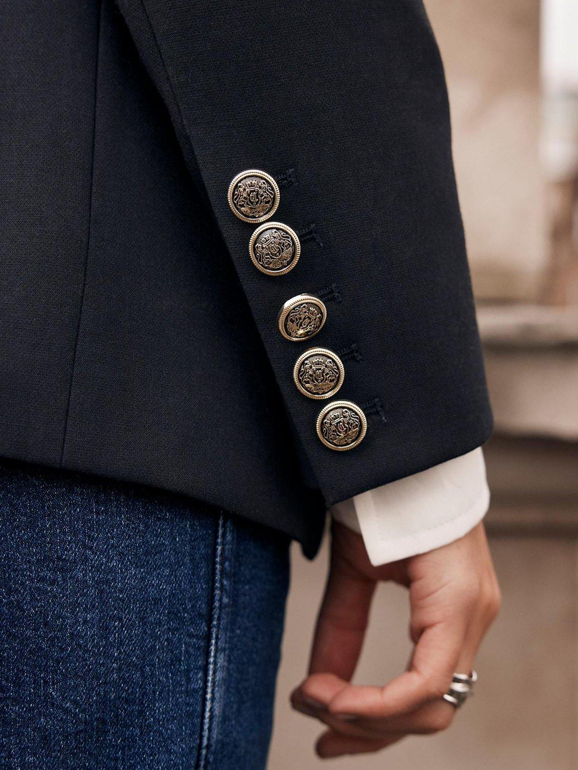 A smart blazer in a double-breasted silhouette featuring peaked lapels, welt pockets, long sleeves, buttoned cuffs, and asymmetric gold-tone button detailing with a single button fastening through the front. Fully lined.
