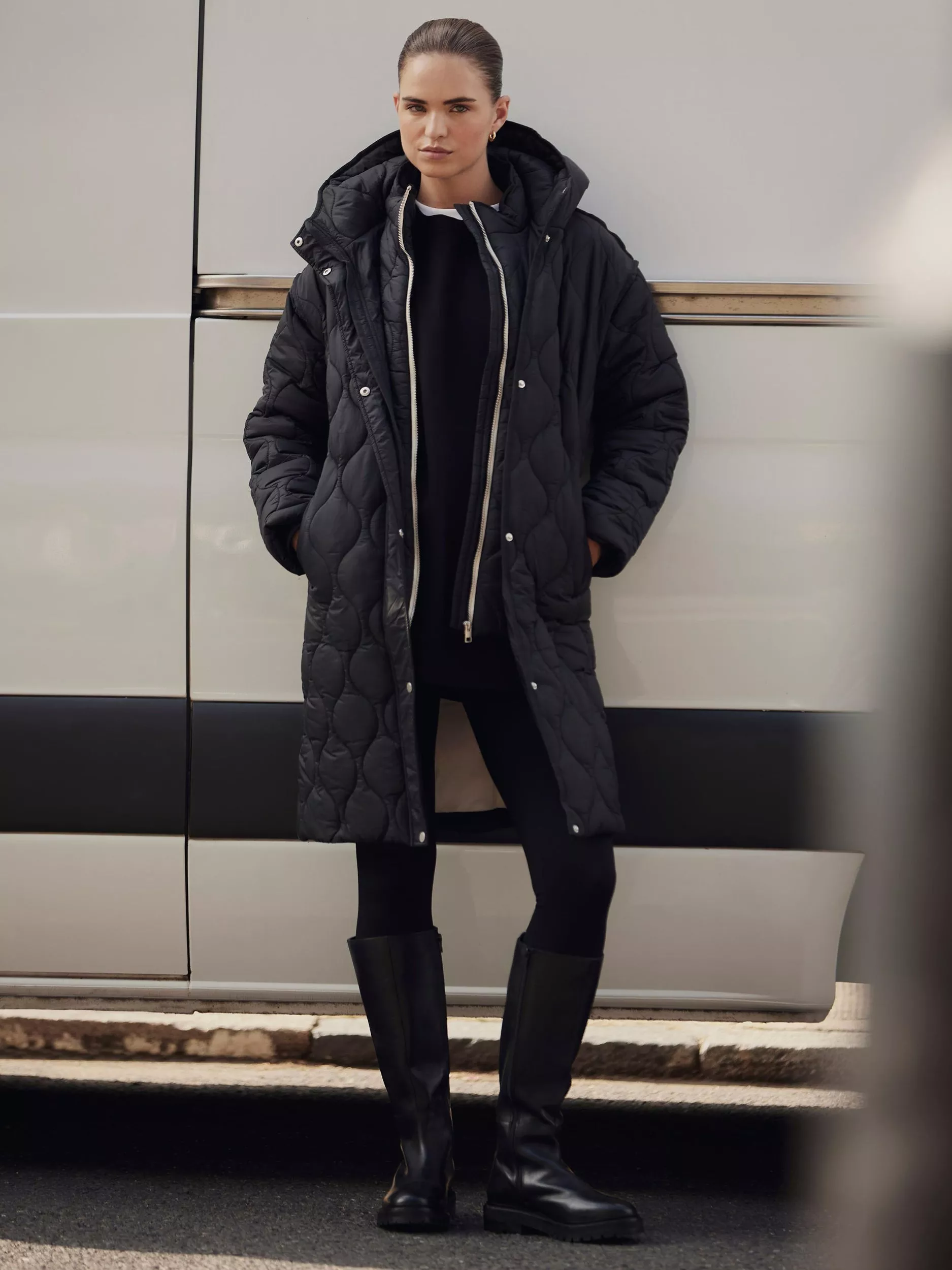 A double-layered quilted coat featuring a hood, long sleeves, welt pockets, contrast rear trim with a zip and popper fastening through the front.