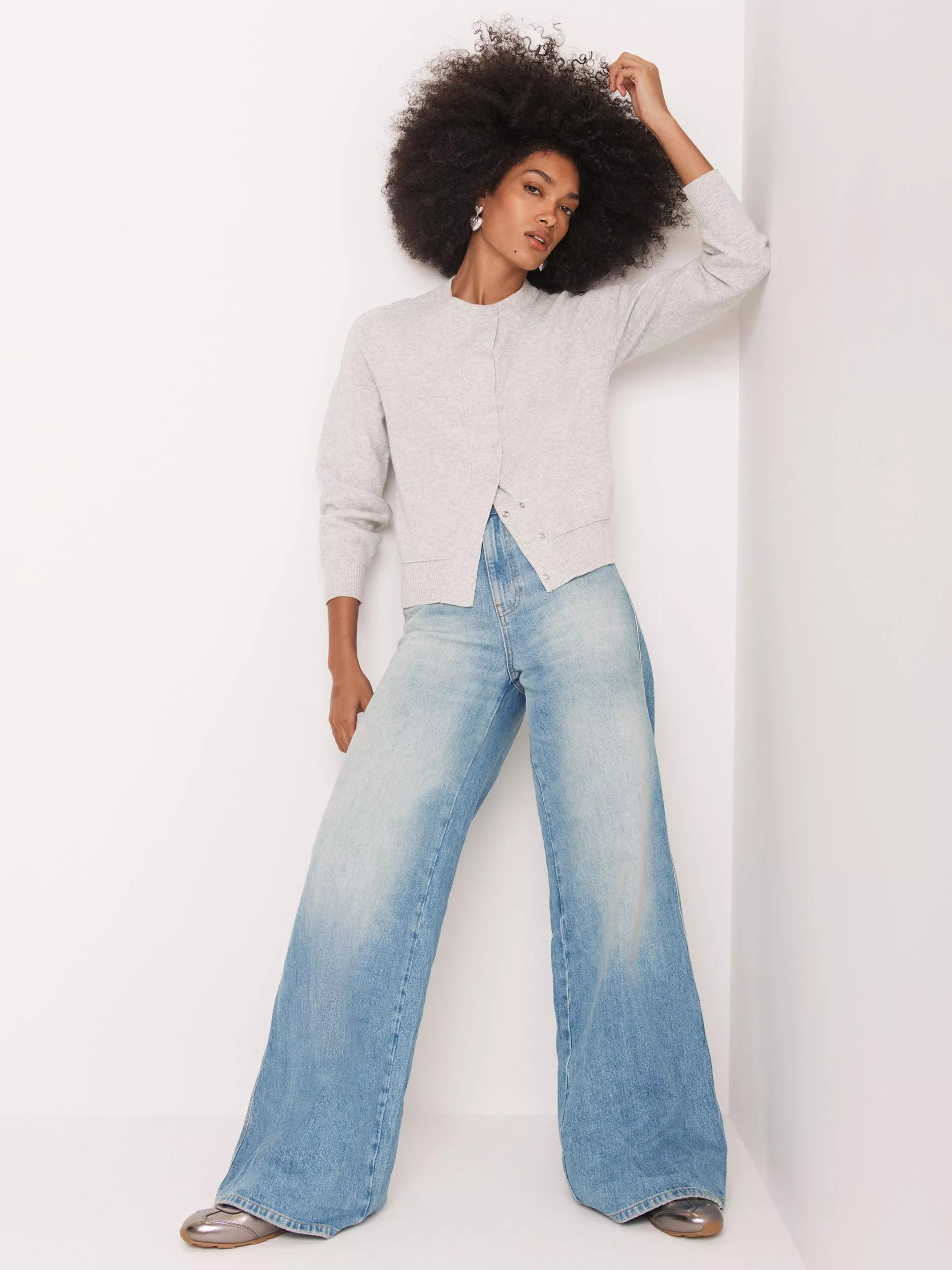 A lightweight cardigan with a crew neckline, long sleeves and double popper fastening through the front.