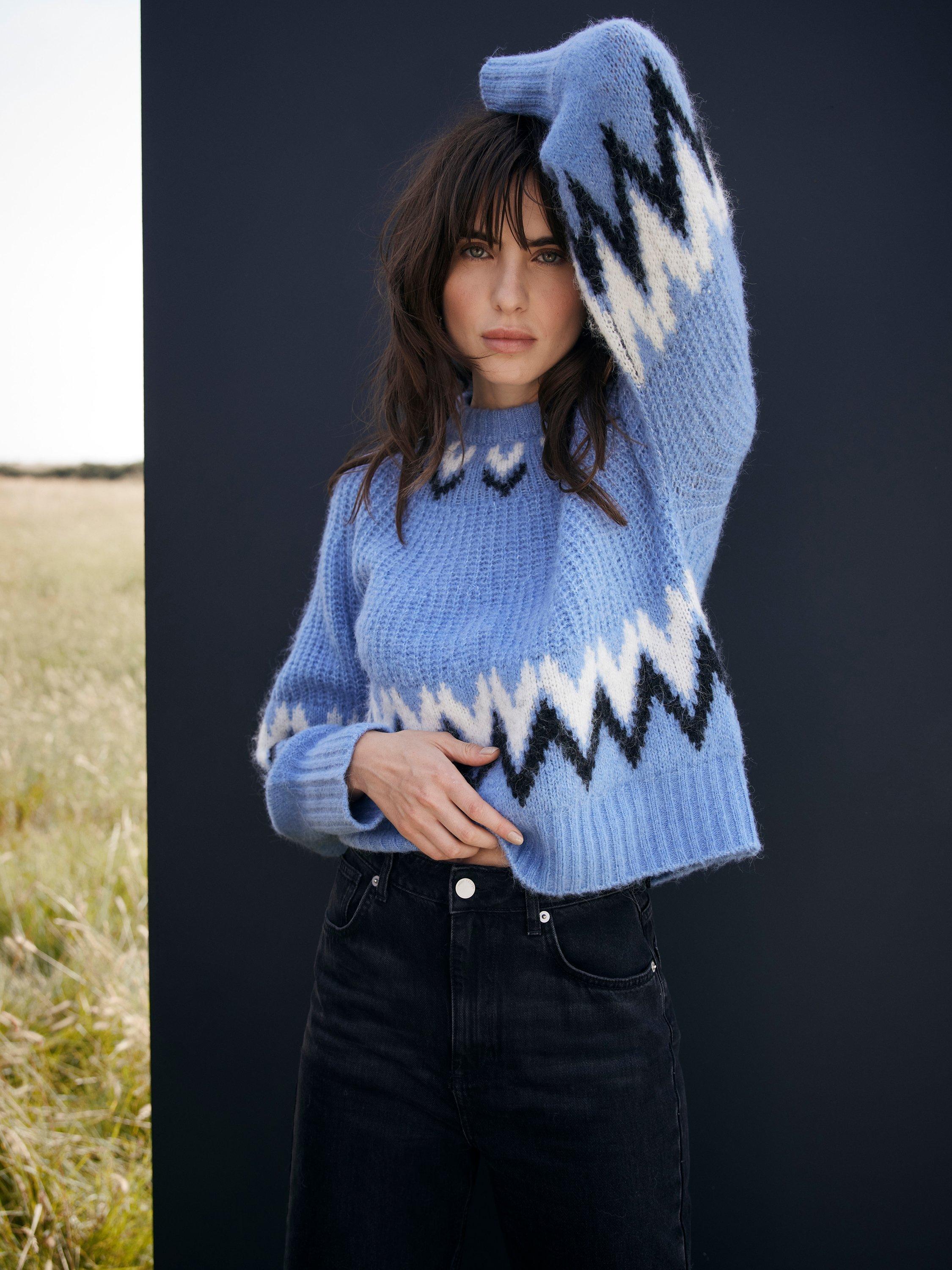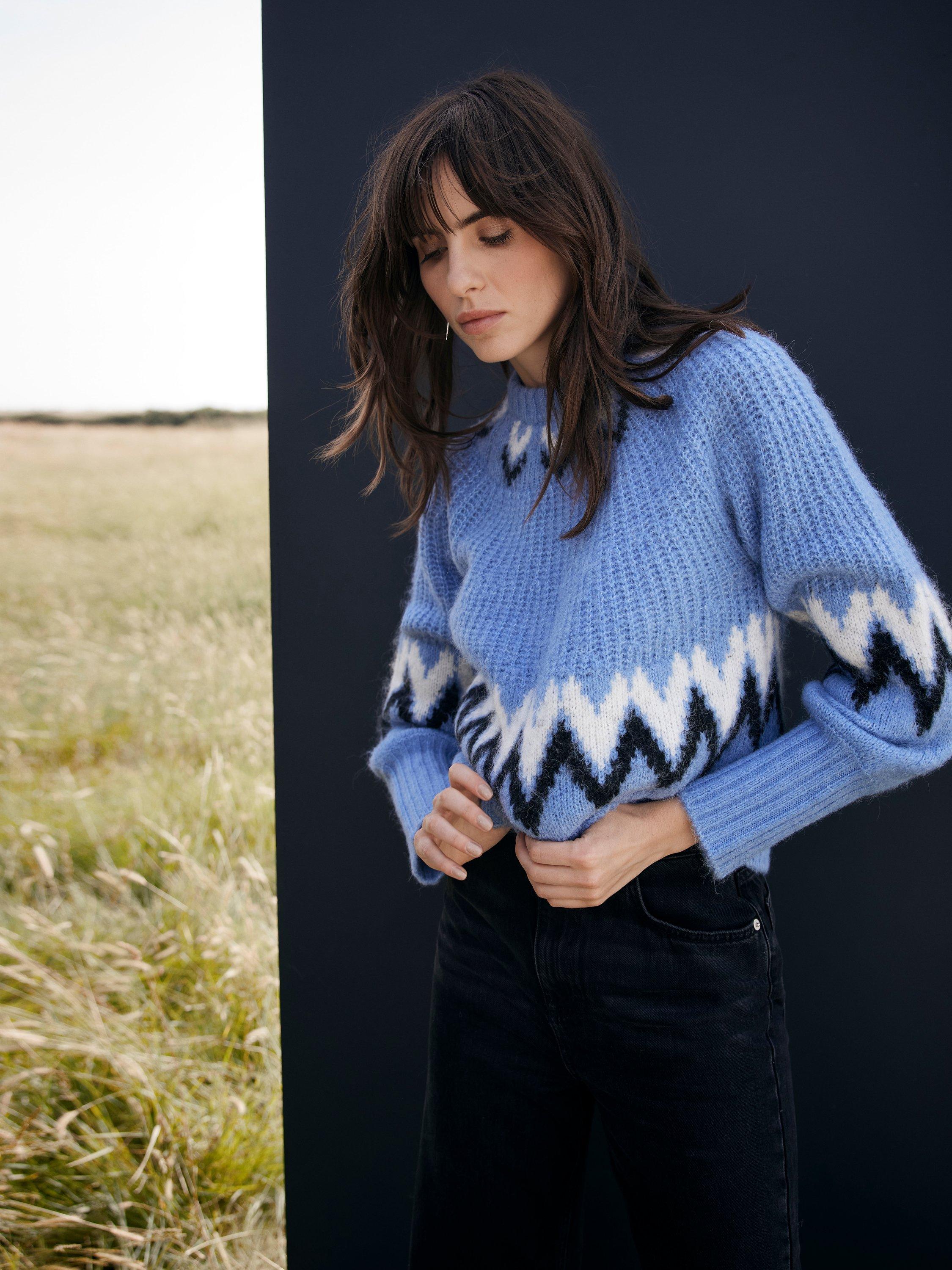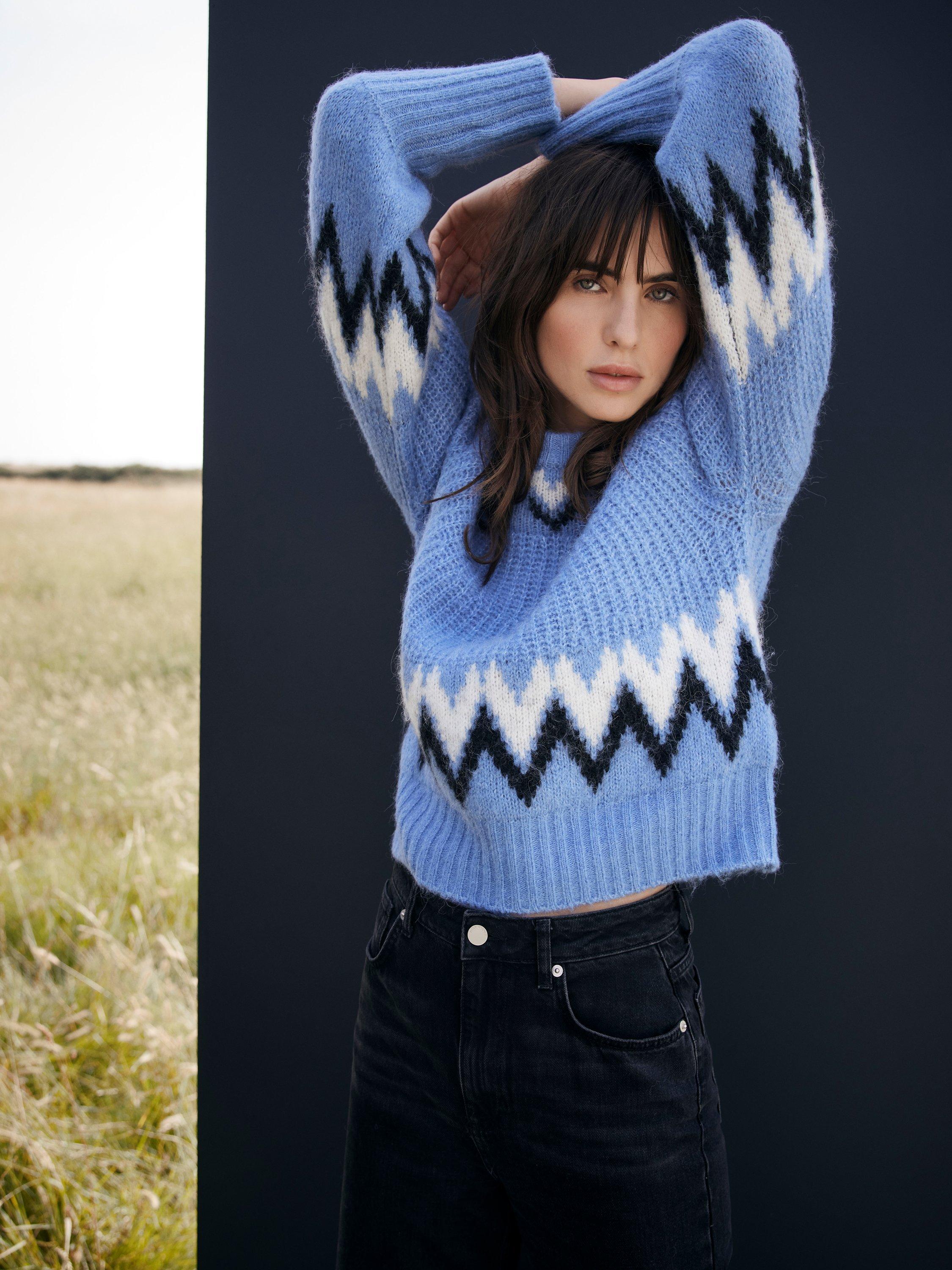 A fairisle jumper with a crew neckline and long sleeves with exaggerated cuffs.