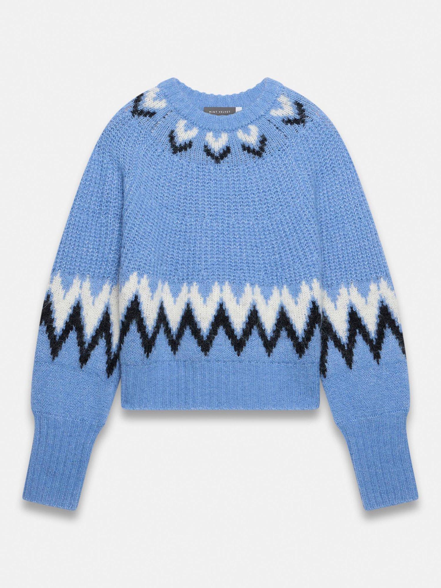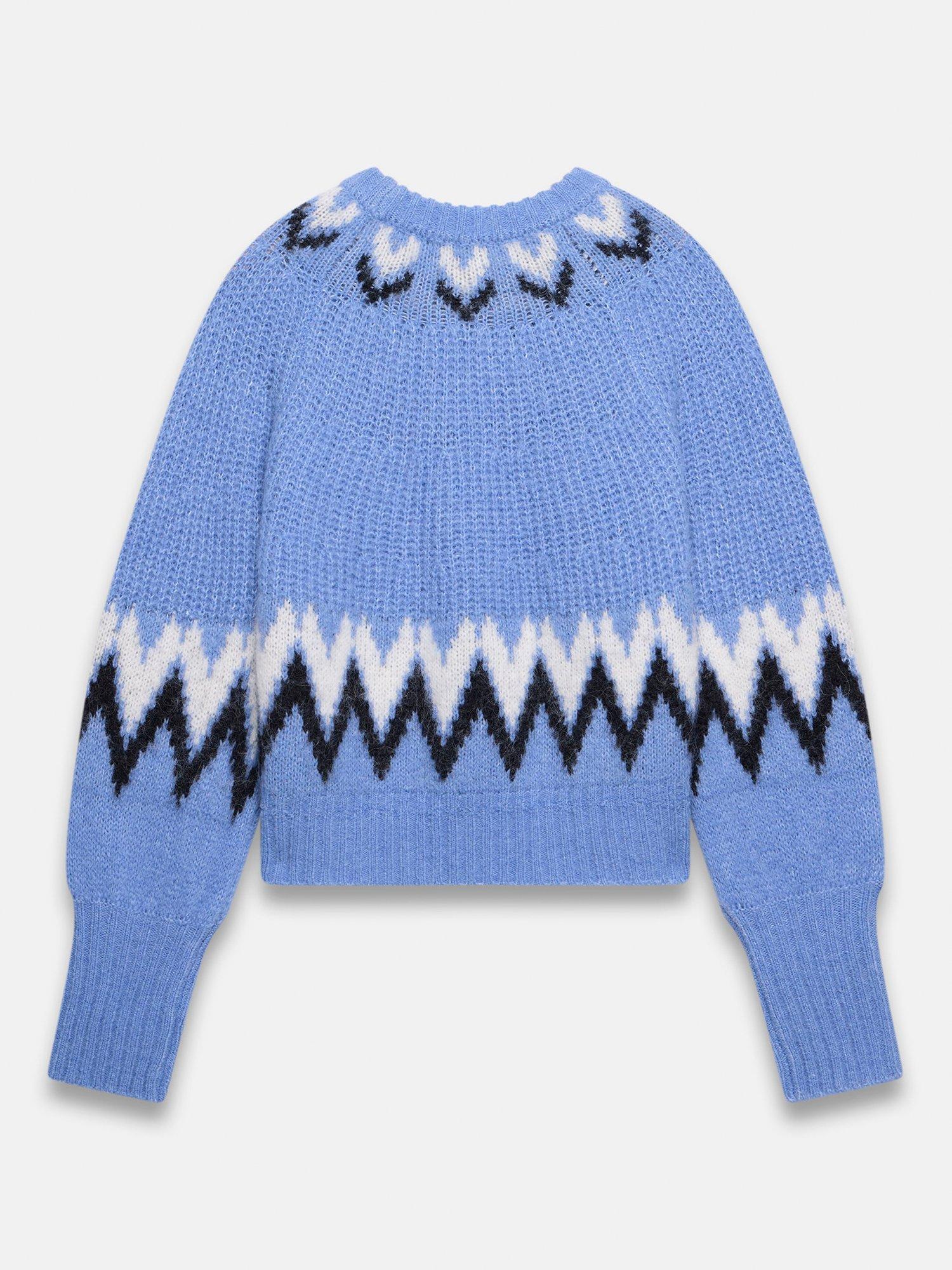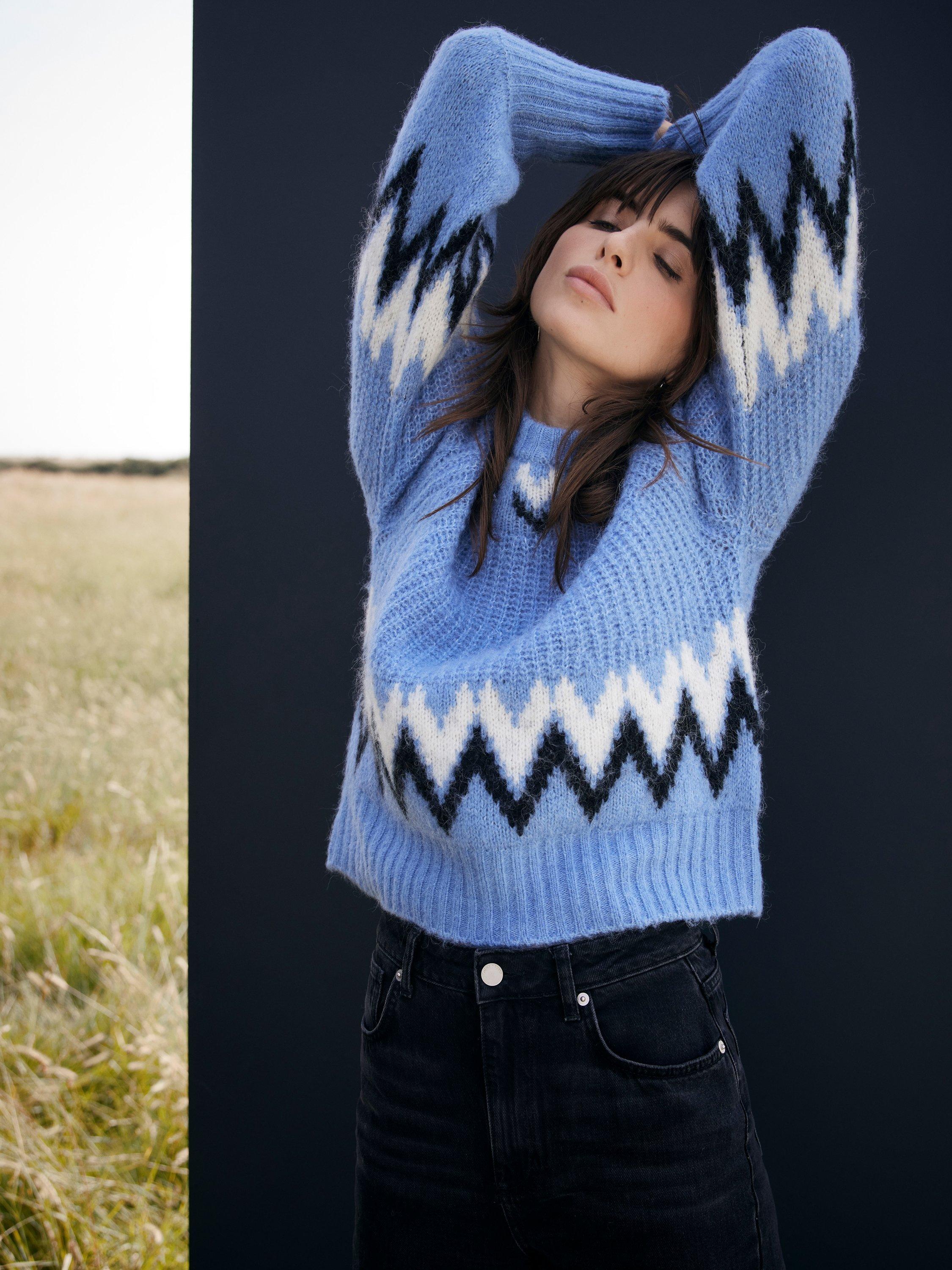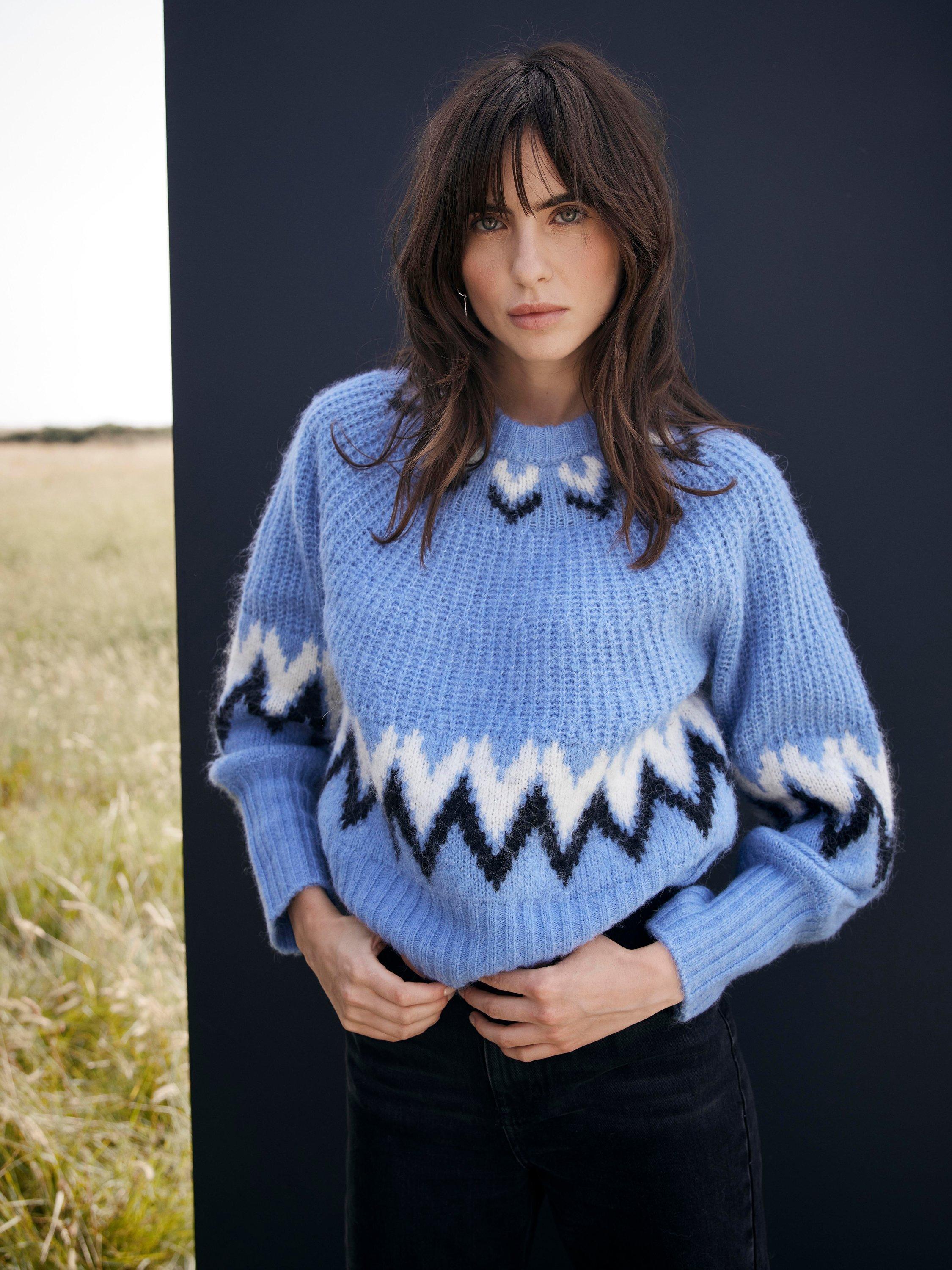 A fairisle jumper with a crew neckline and long sleeves with exaggerated cuffs.