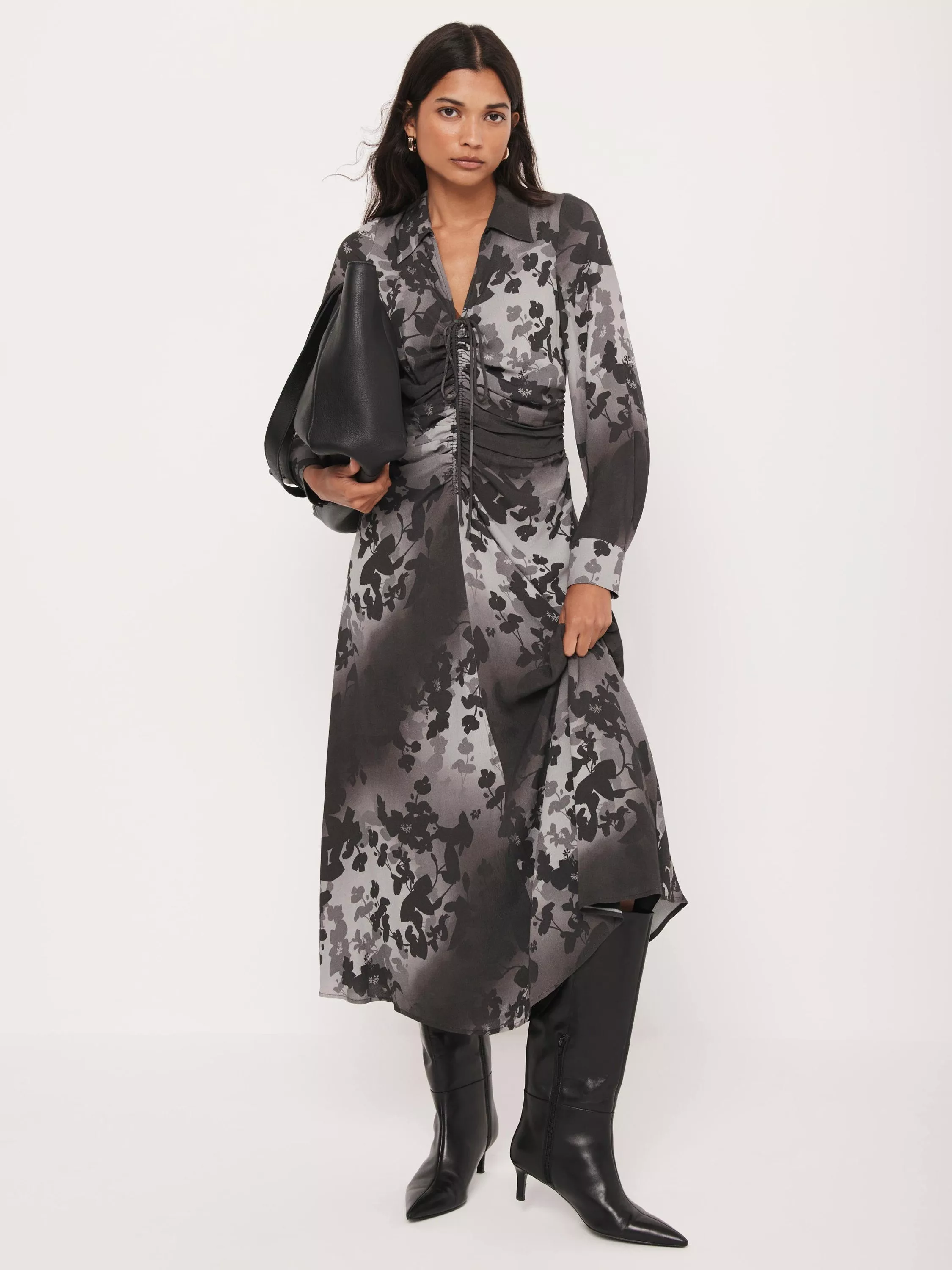 A floral print dress in a midi silhouette featuring a classic collar, long sleeves, button cuffs, gathered detailing with a tie fastening through the front.