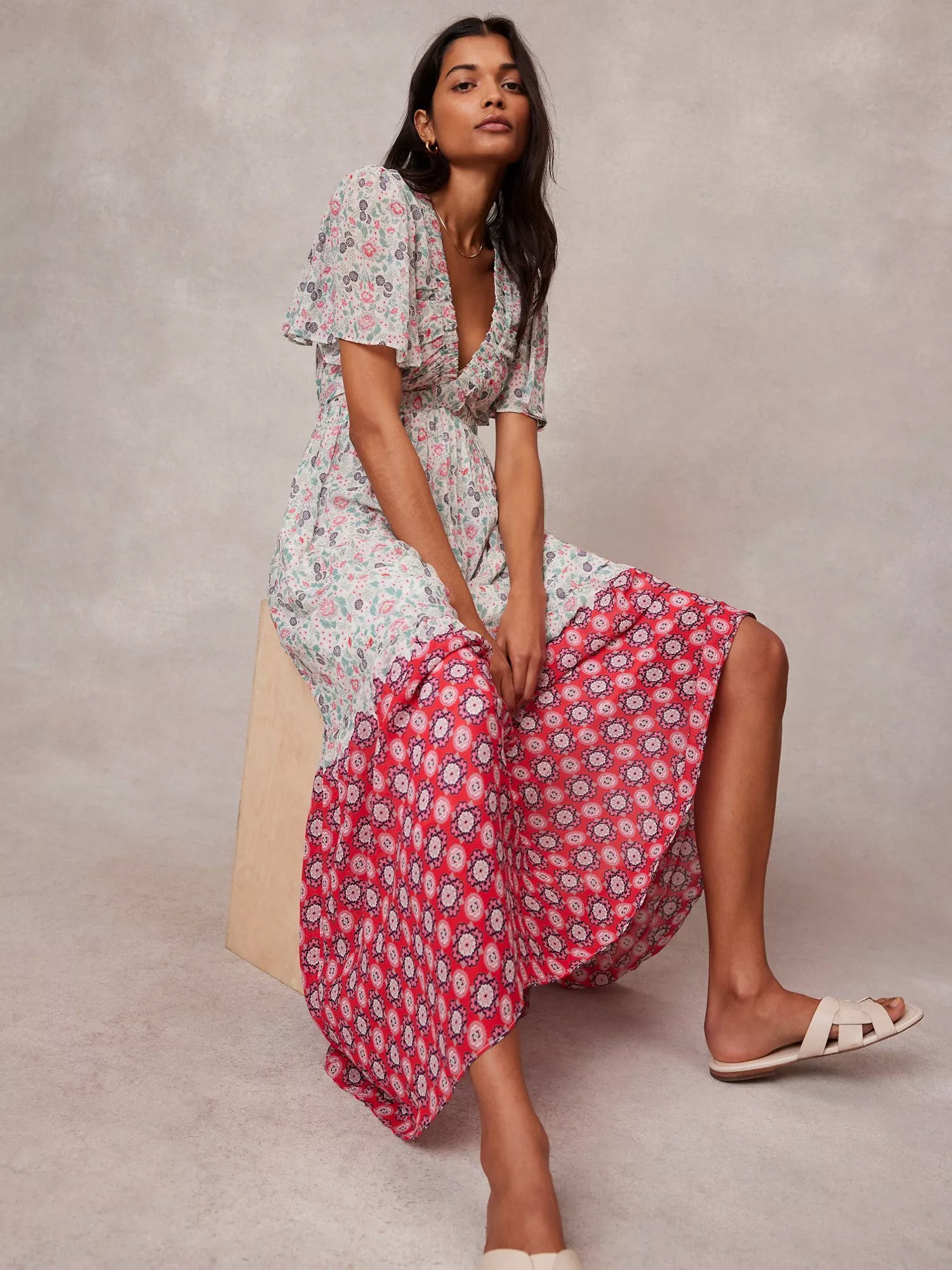 A floral print dress in a maxi silhouette featuring a V-neckline, short frill sleeves, full length hemline with a contrastprint design.