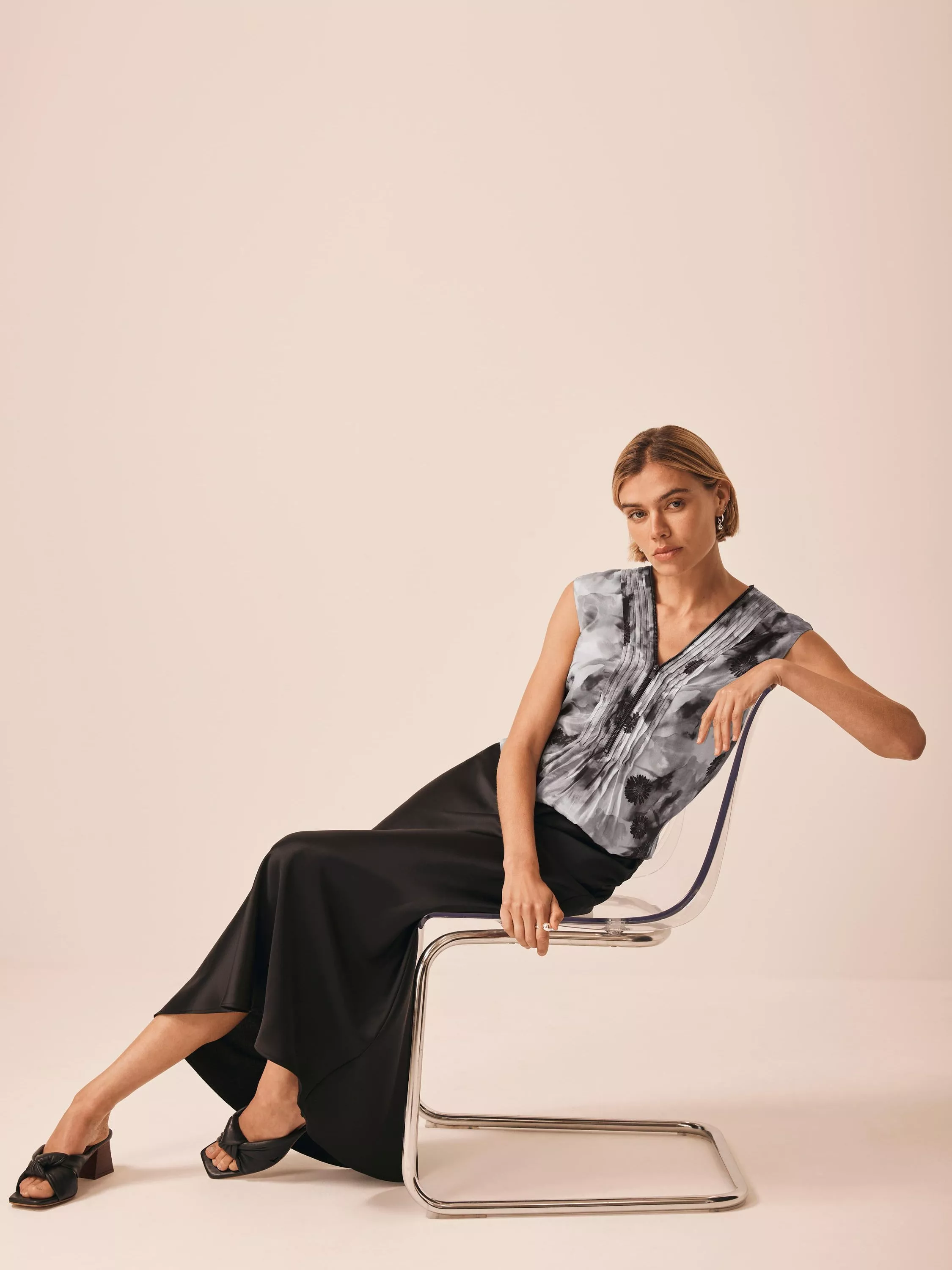 A sleeveless floral print top with a V-neckline, pin-tuck detailing, gathered elasticated waistband with a zip trim and fastening through the front.