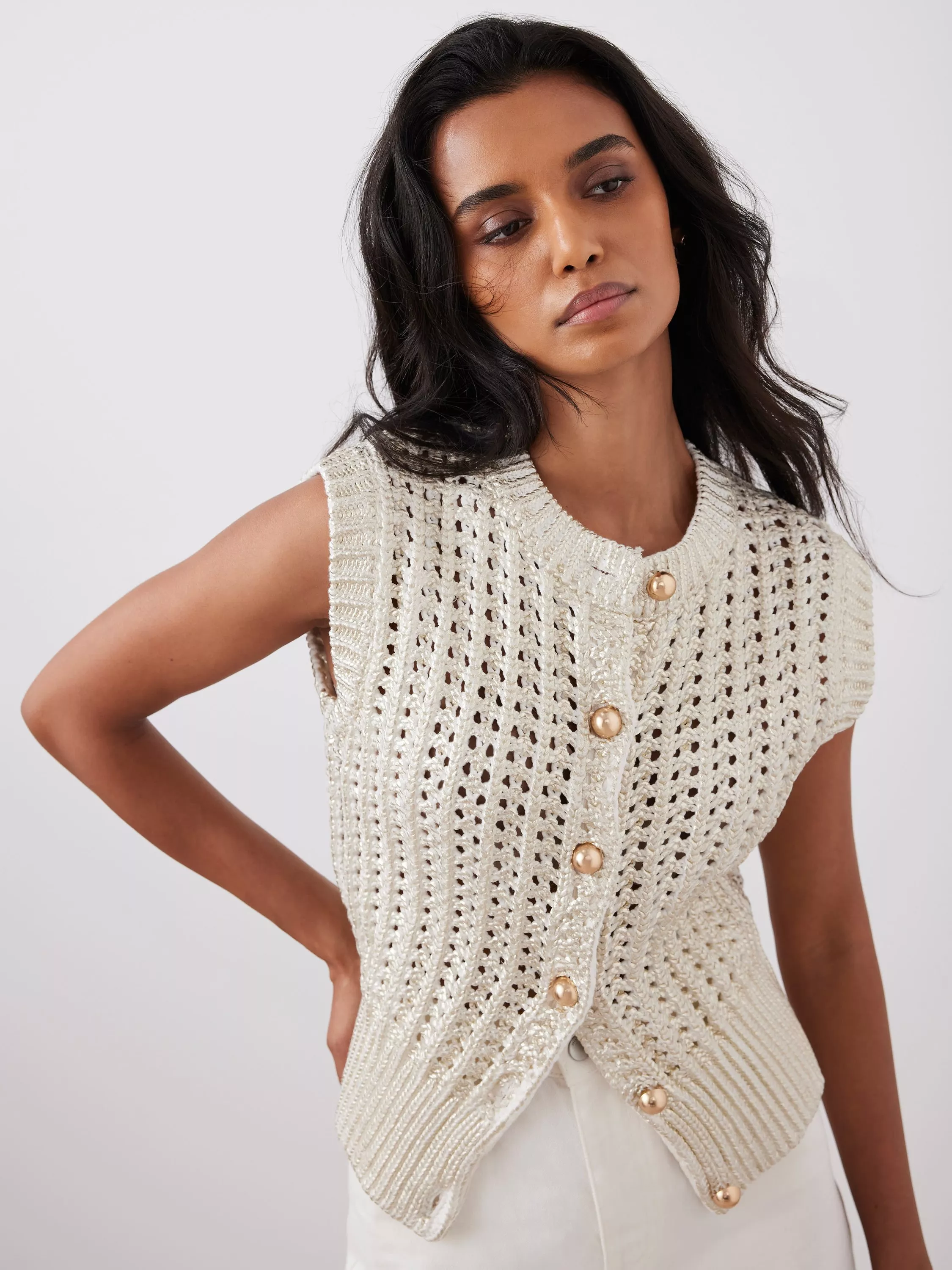 A foil waistcoat with a crew neckline, open knit, ribbed trim and metallic-tone military-inspired button fastenings through the front.