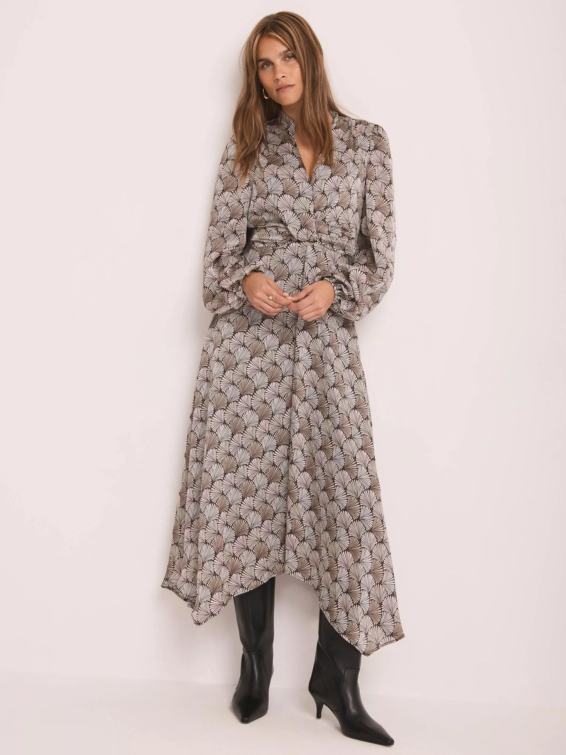 Step into your day with confidence in this fit and flare midi dress, featuring a striking abstract pattern, long sleeves, and a flattering V-neck for easy style and all-day comfort. Perfect for bringing fresh perspective to any occasion.