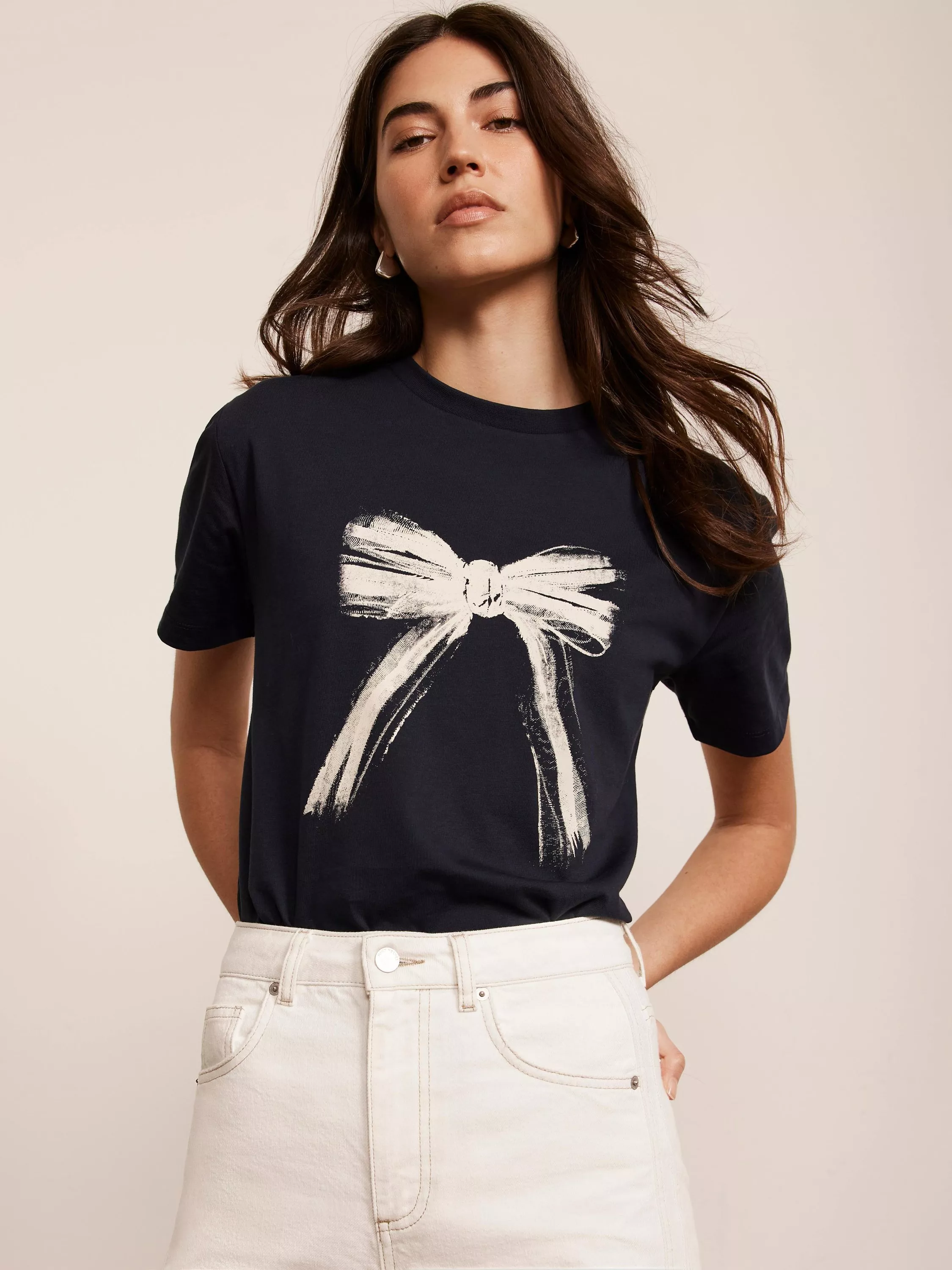 A t-shirt with a crew neckline, short sleeves and a bow graphic on the front.