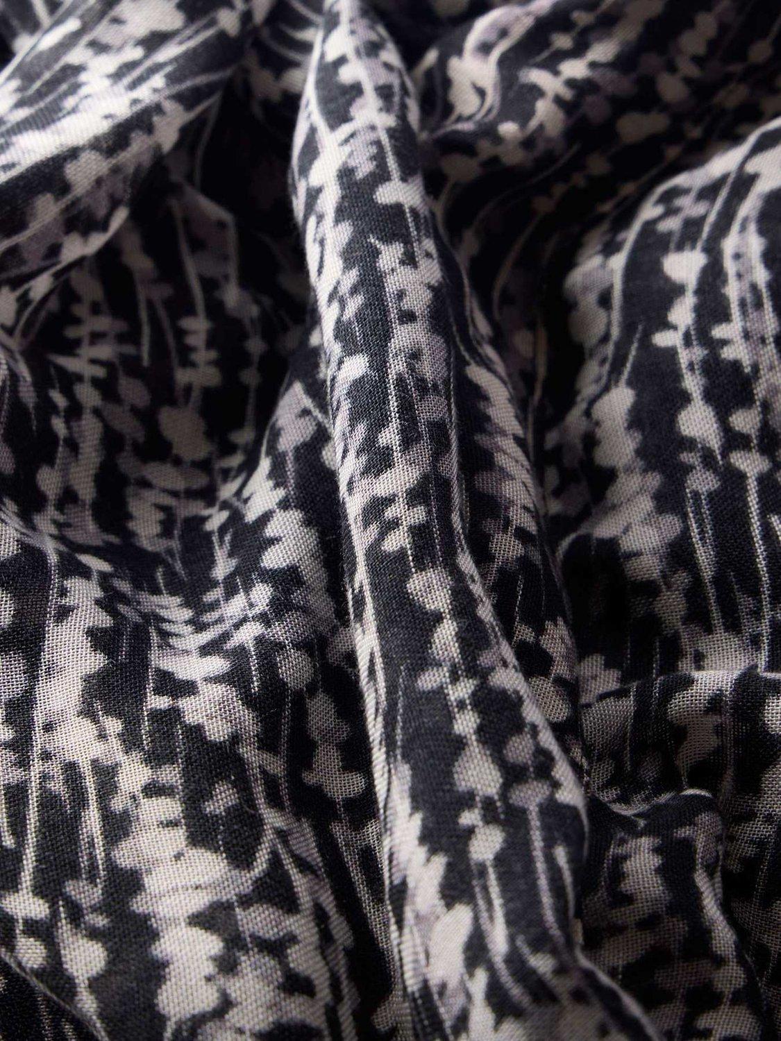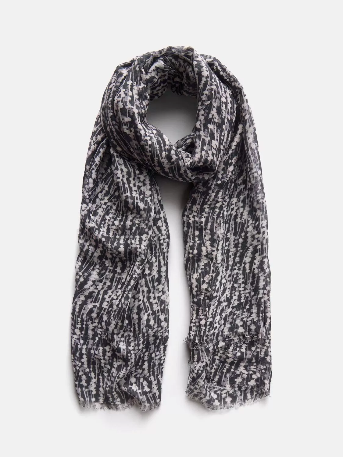 A black graphic print rectangular shaped scarf with raw edge detailing.