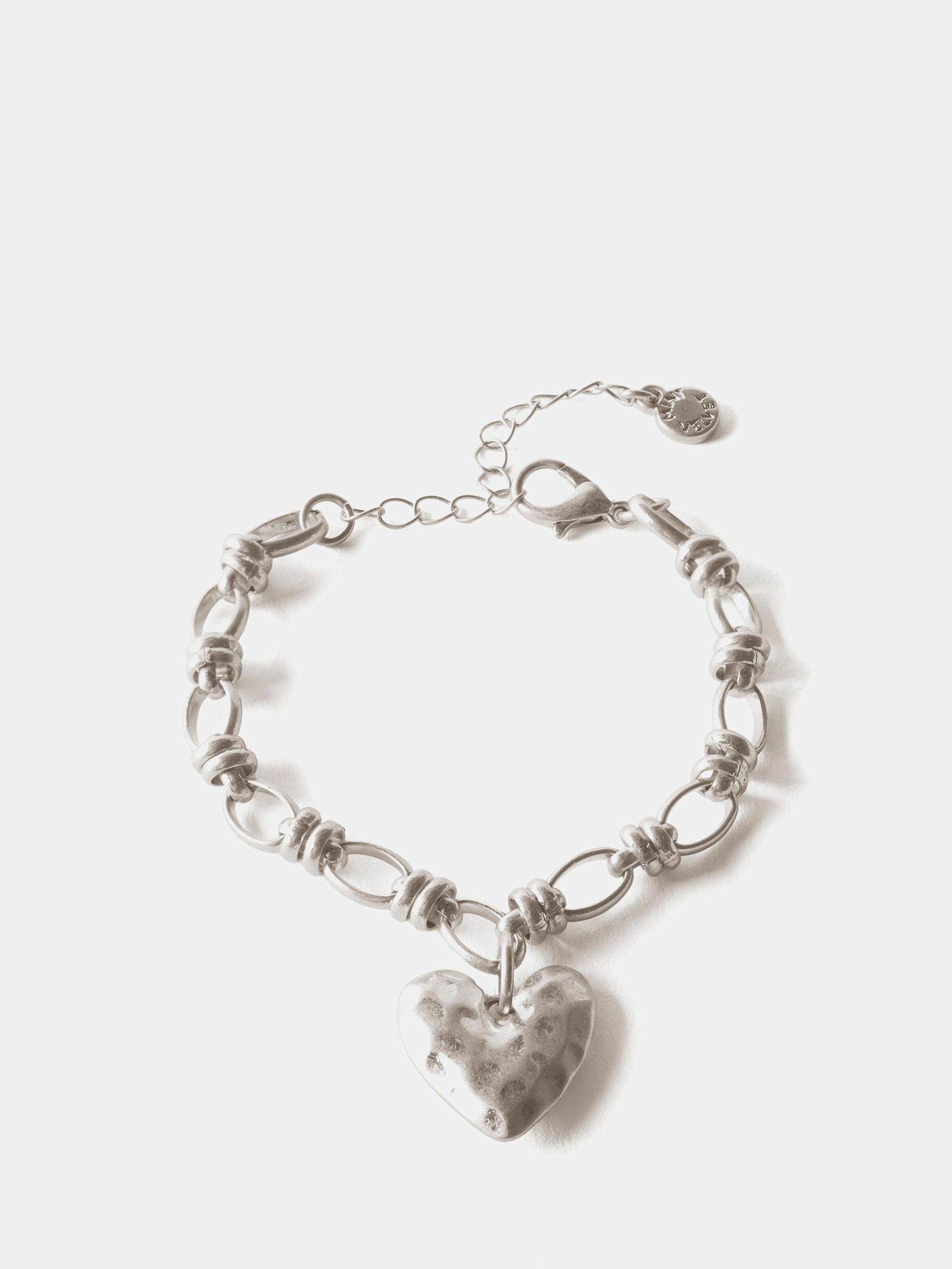 Chunky link bracelet with a hammered heart charm and adjustable lobster clasp fastening.