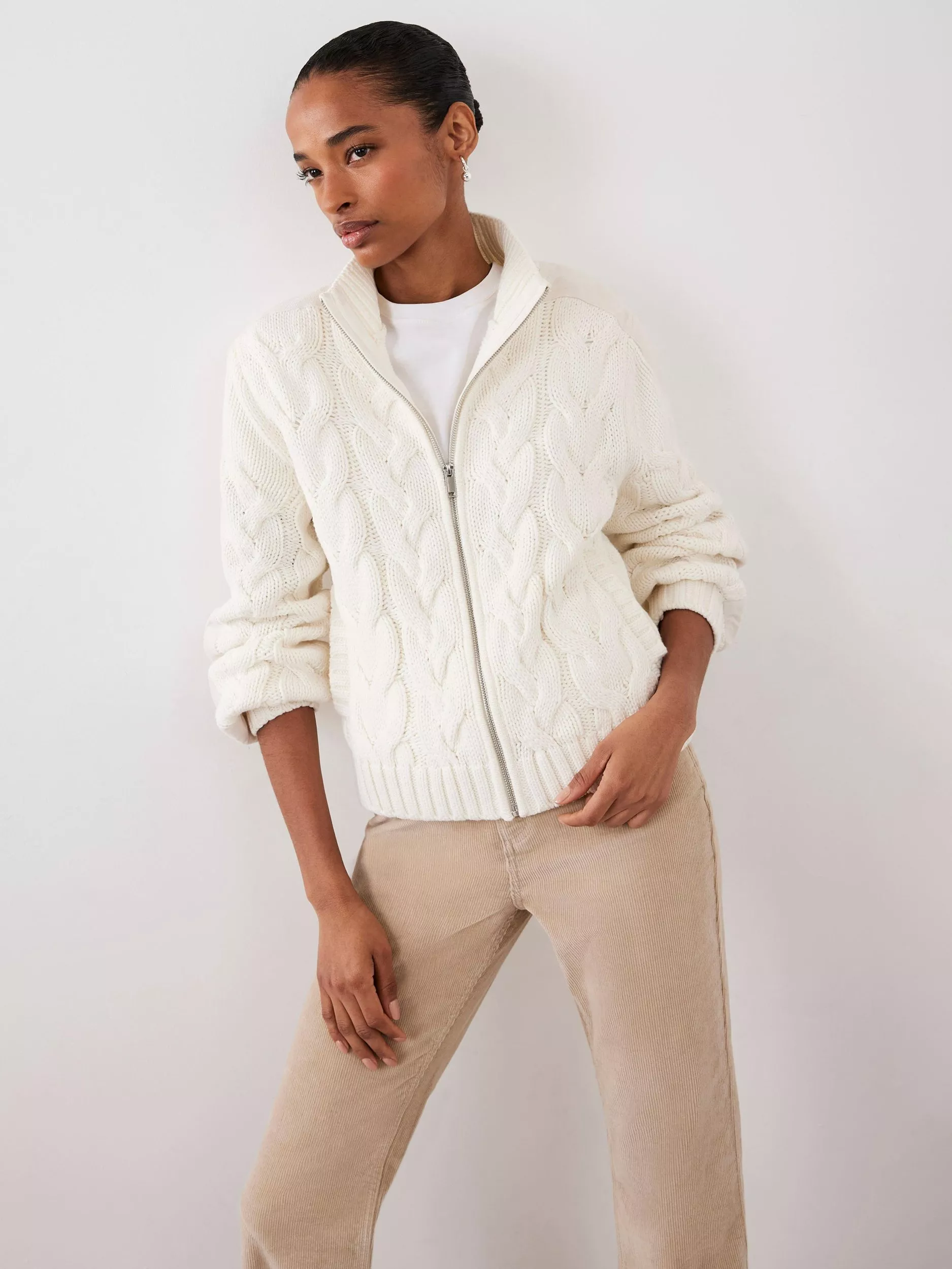 A knit jacket featuring a high neckline, long sleeves, welt pockets and a zip fastening through the front.