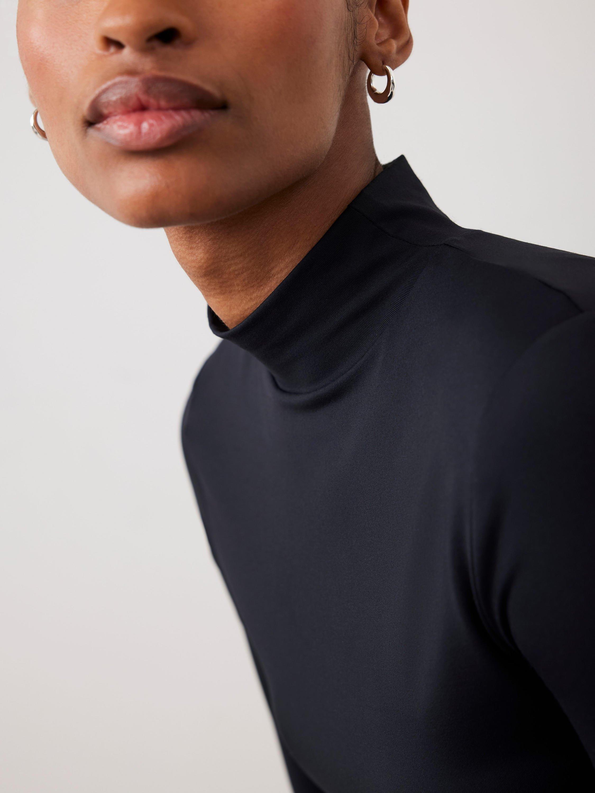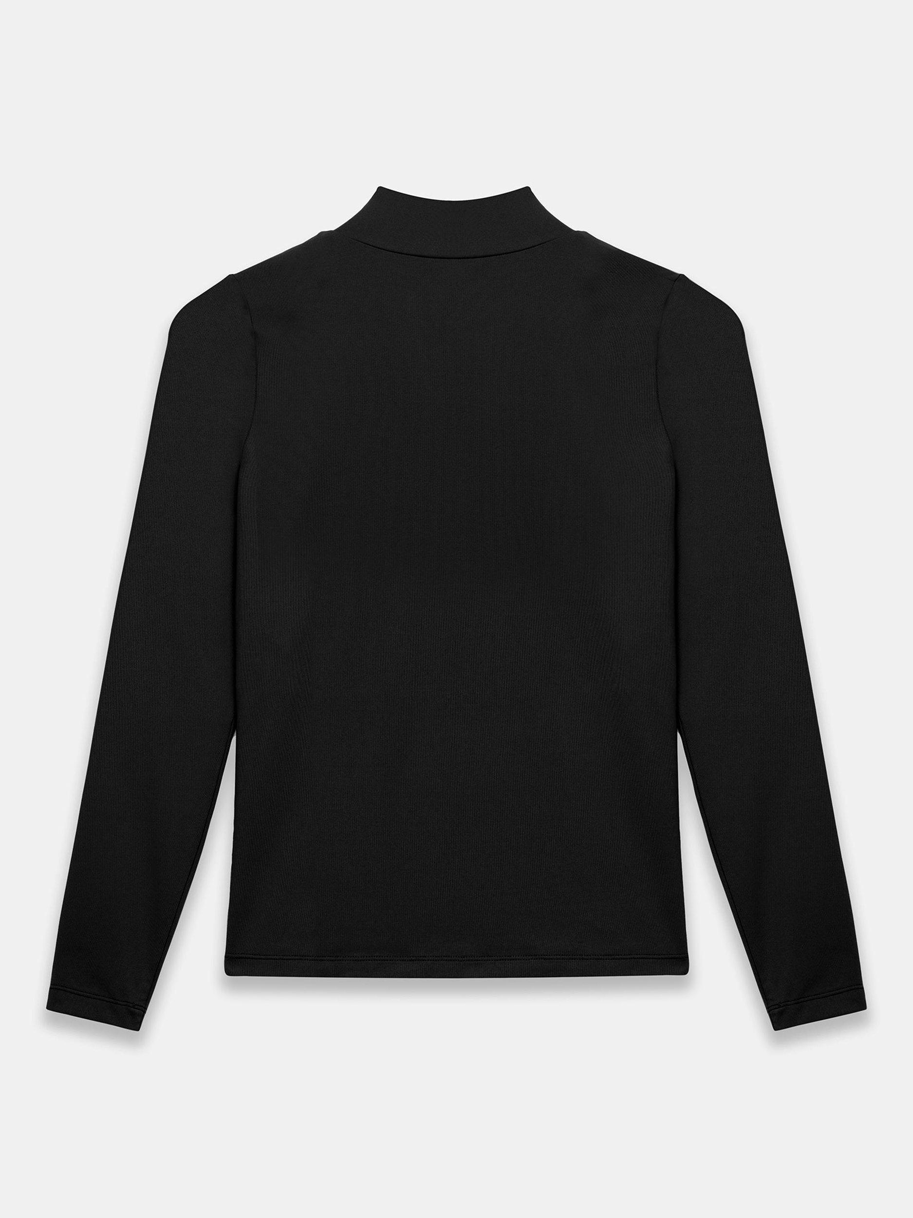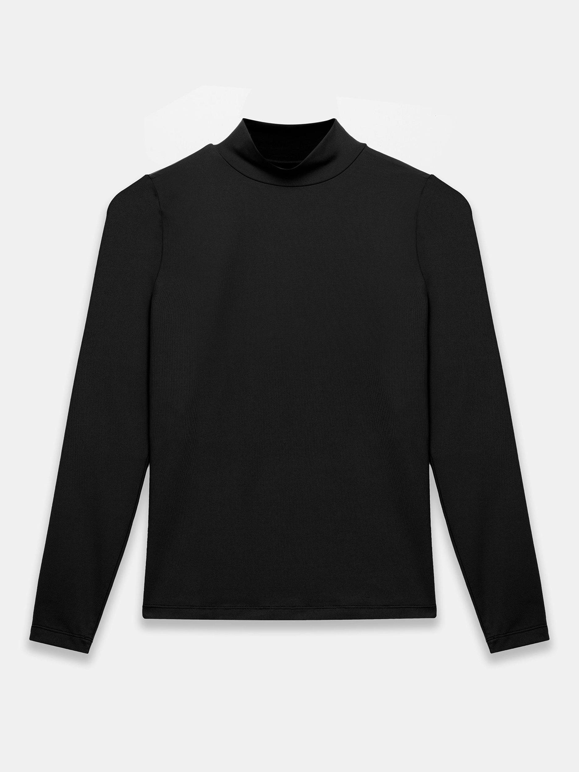 A plain top featuring a high neckline and long sleeves.