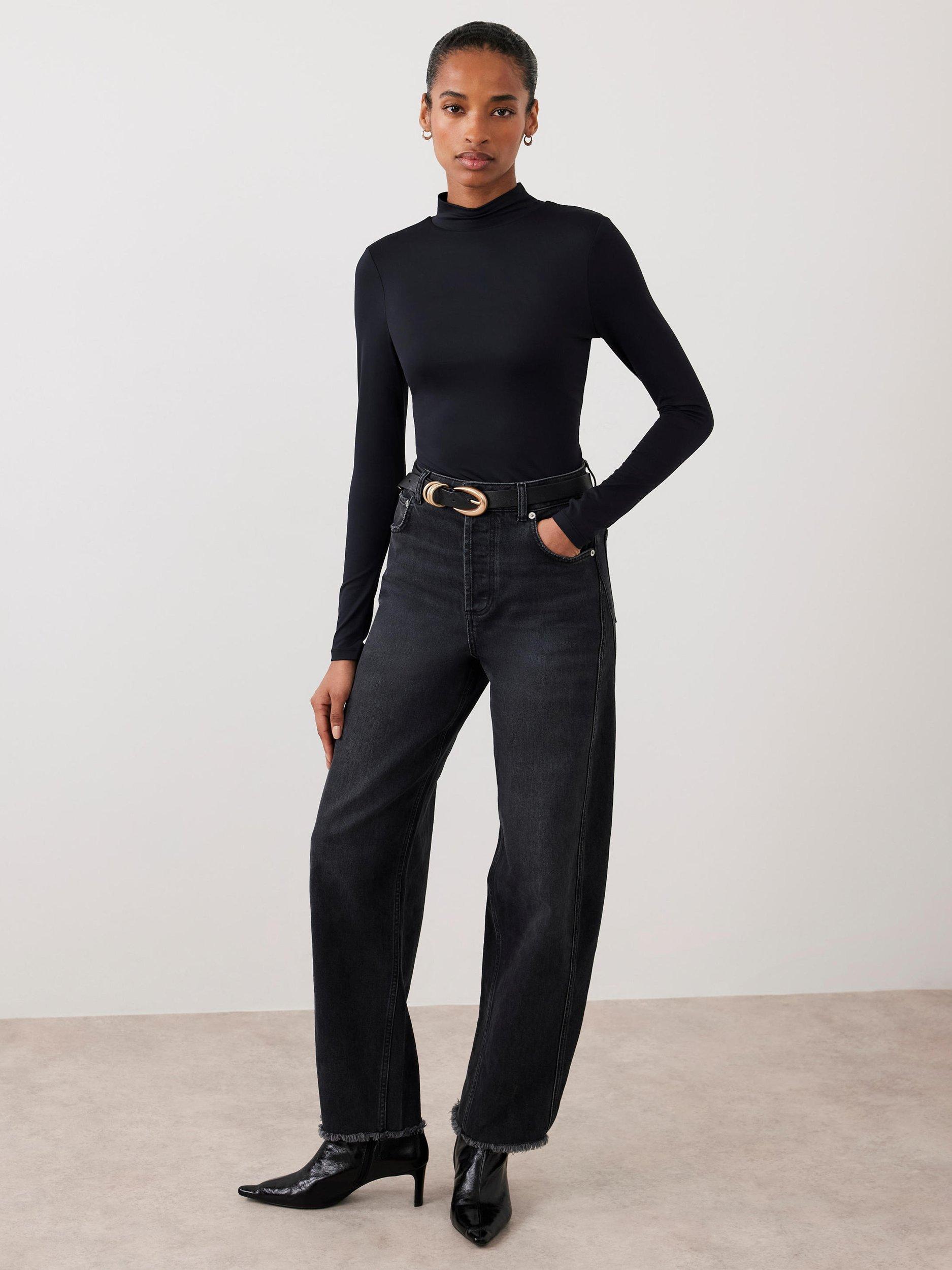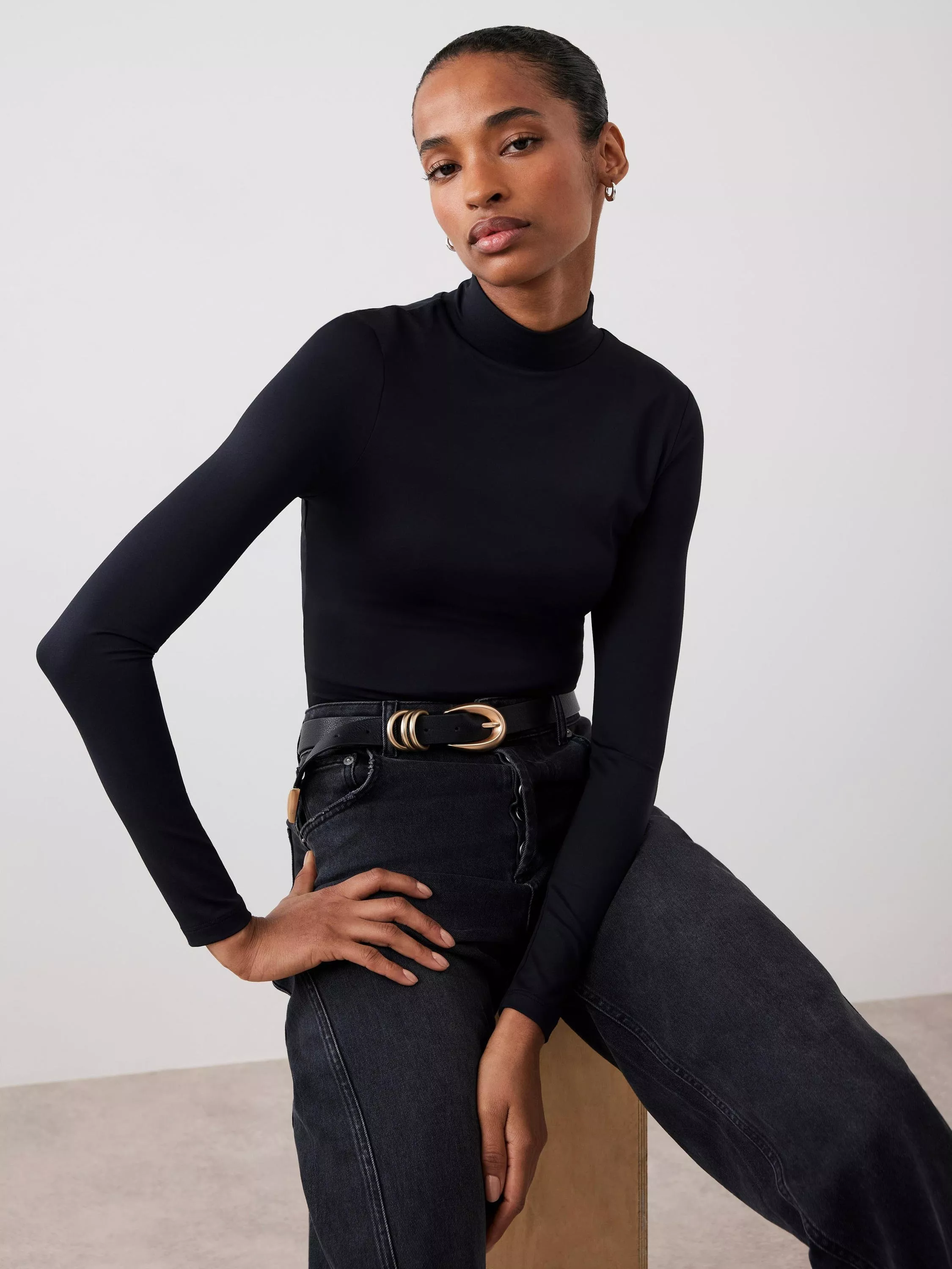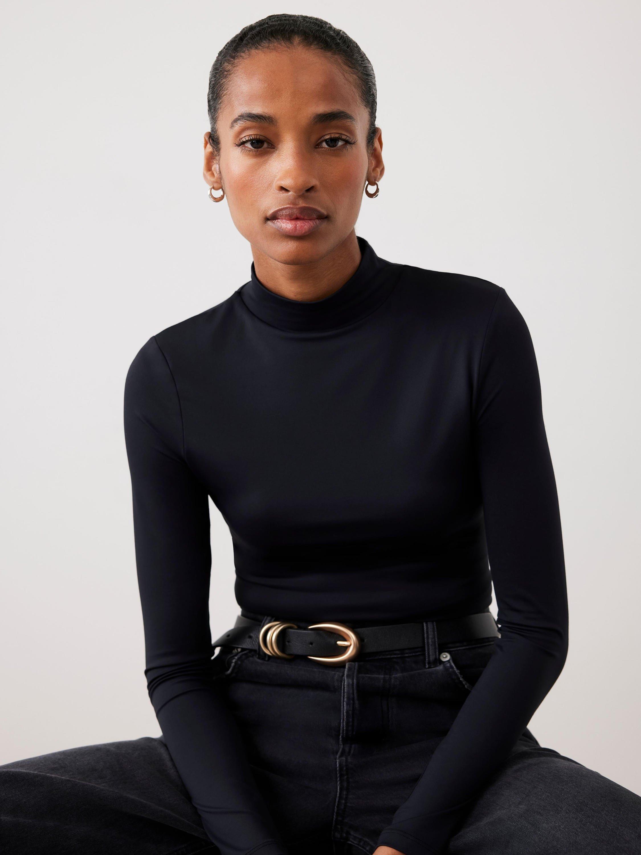 A plain top featuring a high neckline and long sleeves.