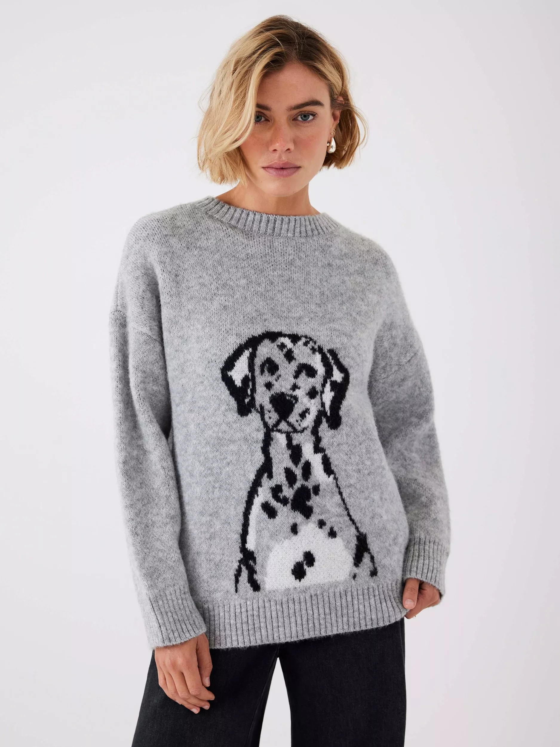 Grey knit jumper featuring a crew neckline, long sleeves and dalmatian motif across the front.