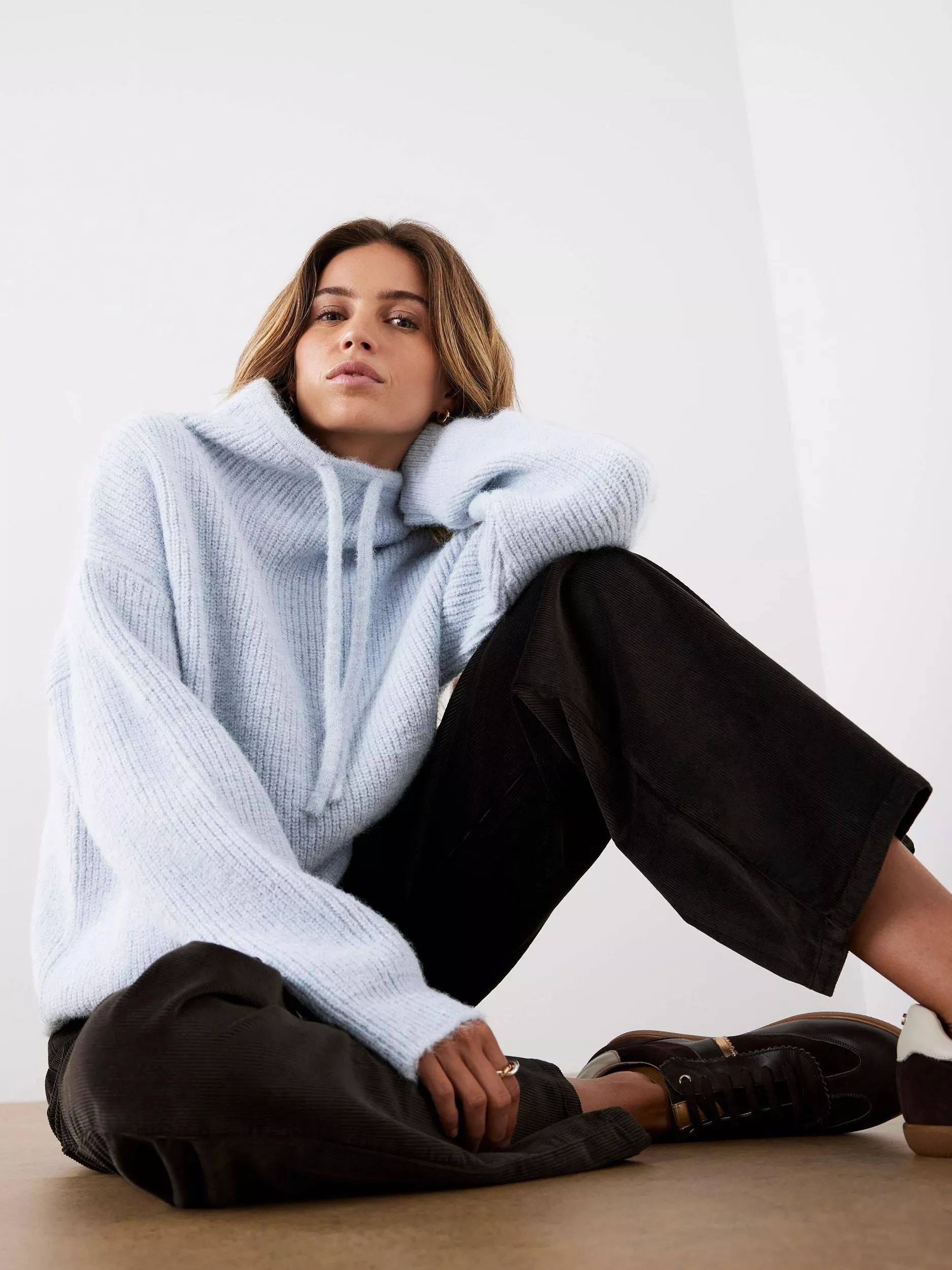 A cosy jumper featuring a high neckline, long sleeves and a drawstring fastening through the front.