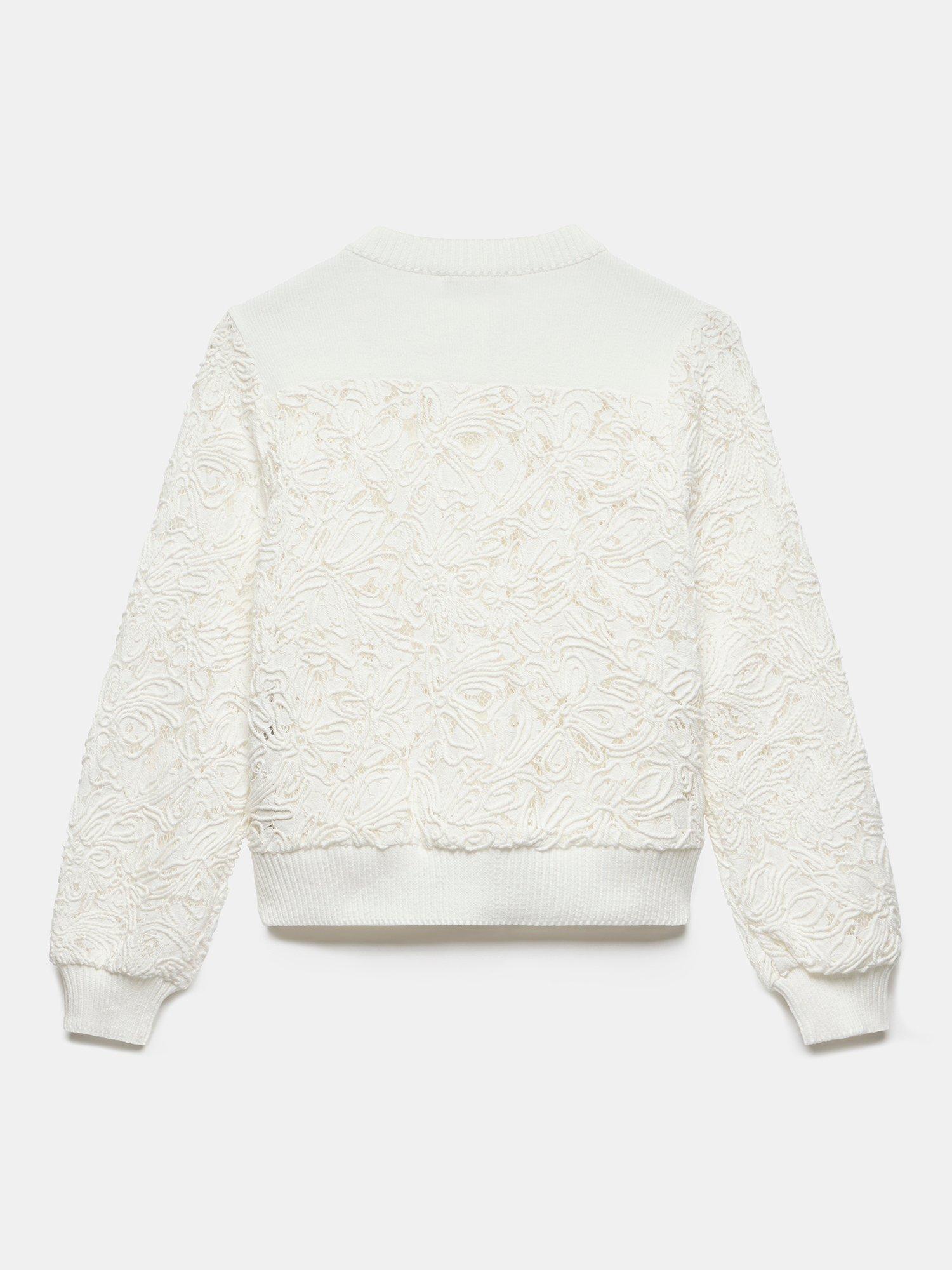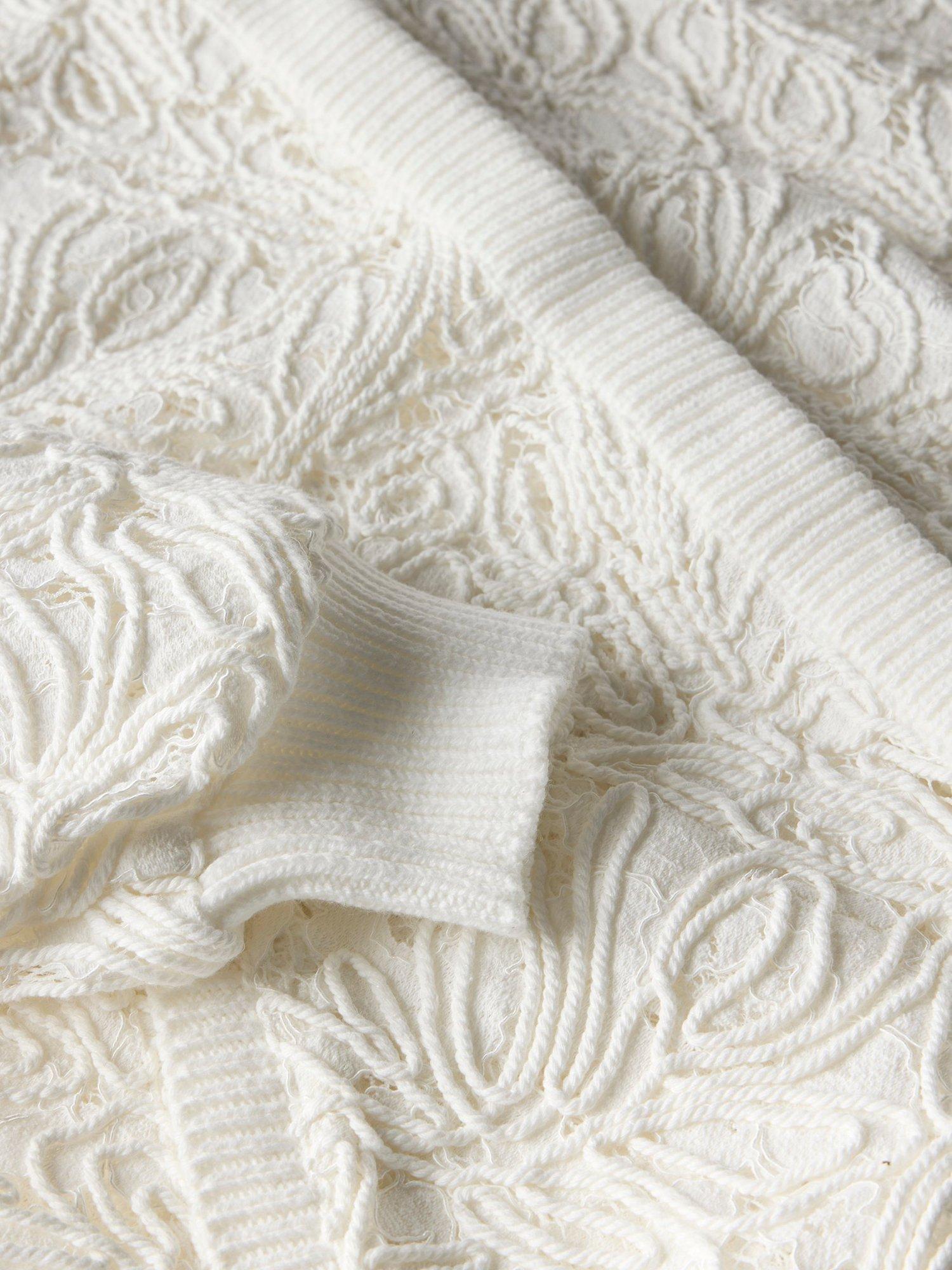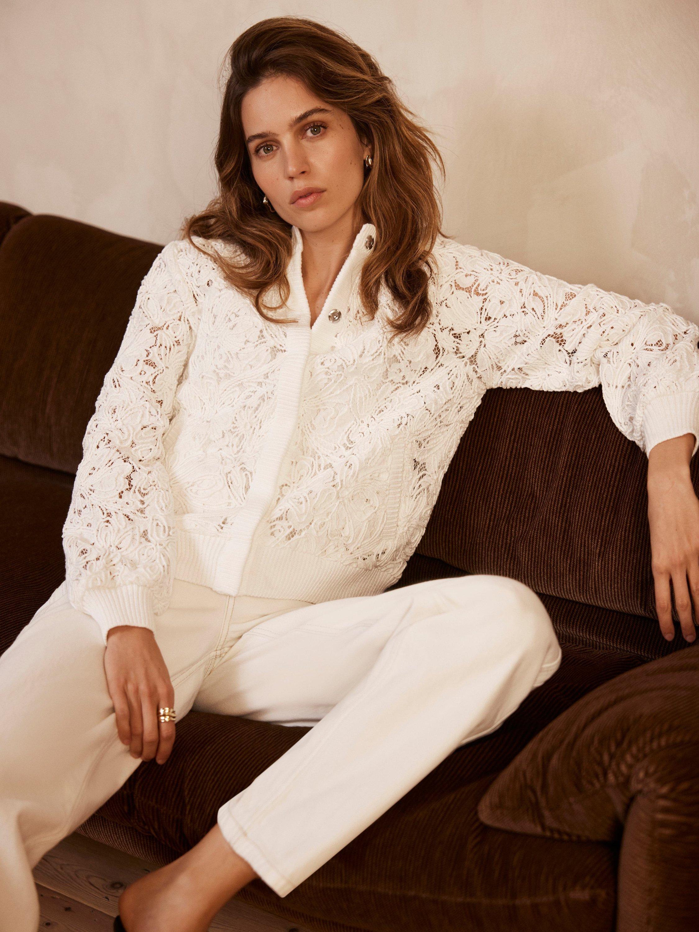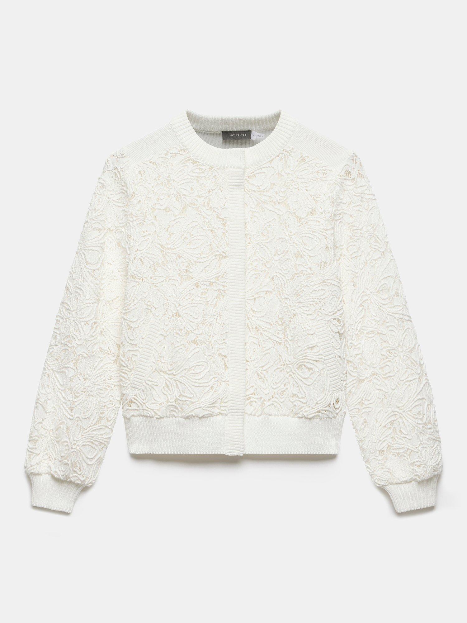 A lace bomber jacket with a crew neckline, long sleeves and a concealed fastening through the front.