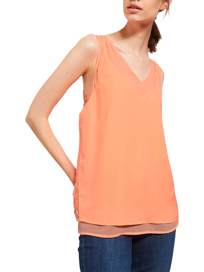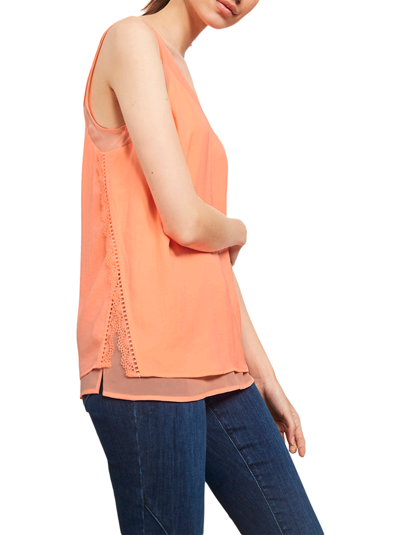 The cami top has a hammered-satin camisole, lined by a chiffon underlayer. The narrow straps draw a V-neckline at the front, while each side seam is bordered by intricate lace trims.