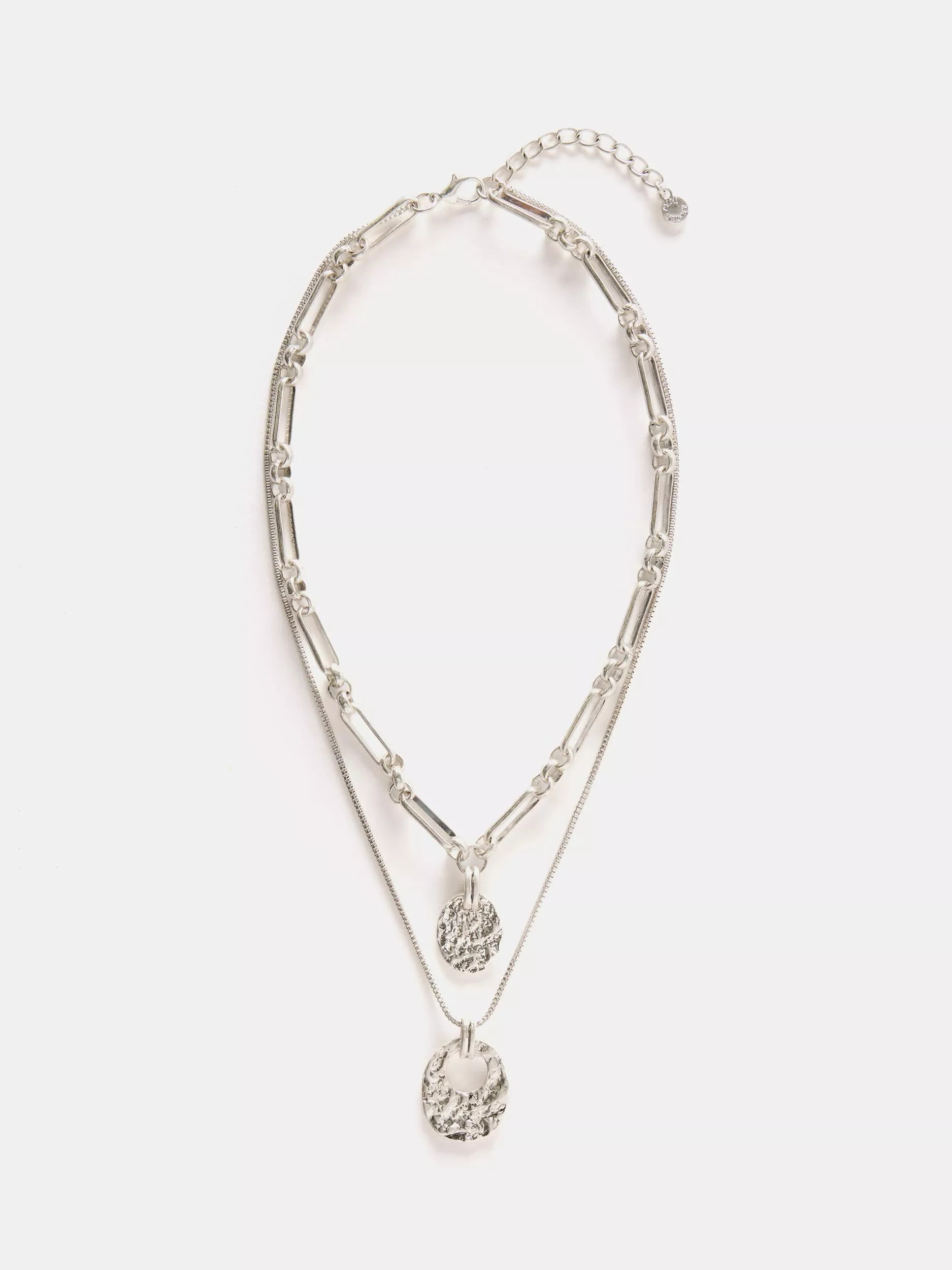 A layered necklace with hanging textured pendants and an adjustable lobster clasp fastening.