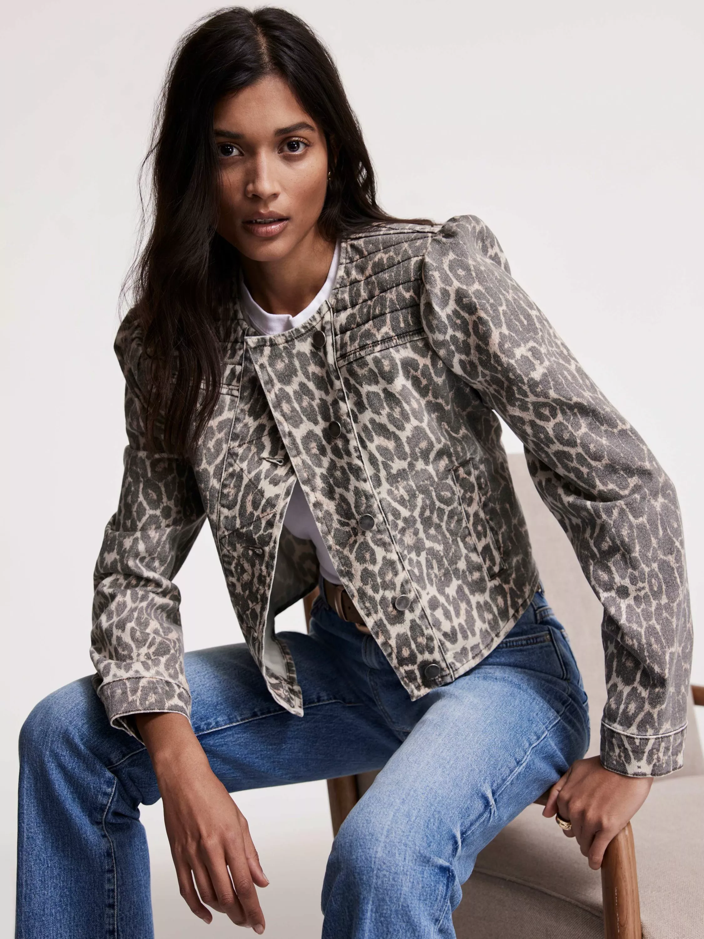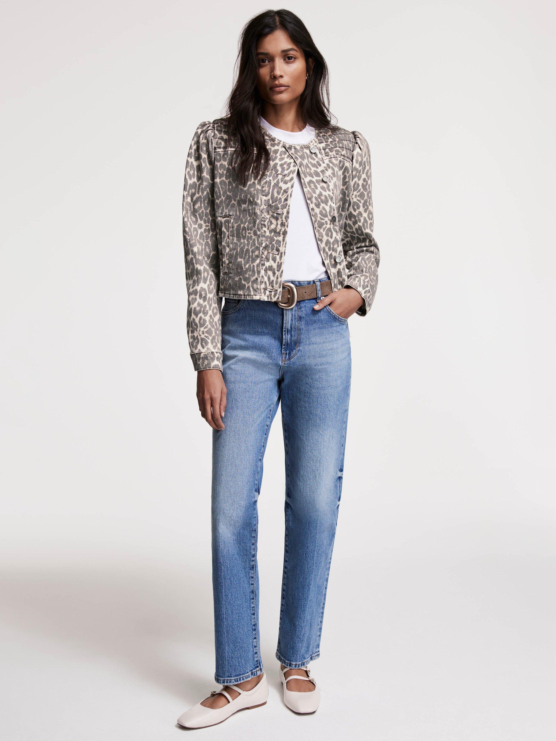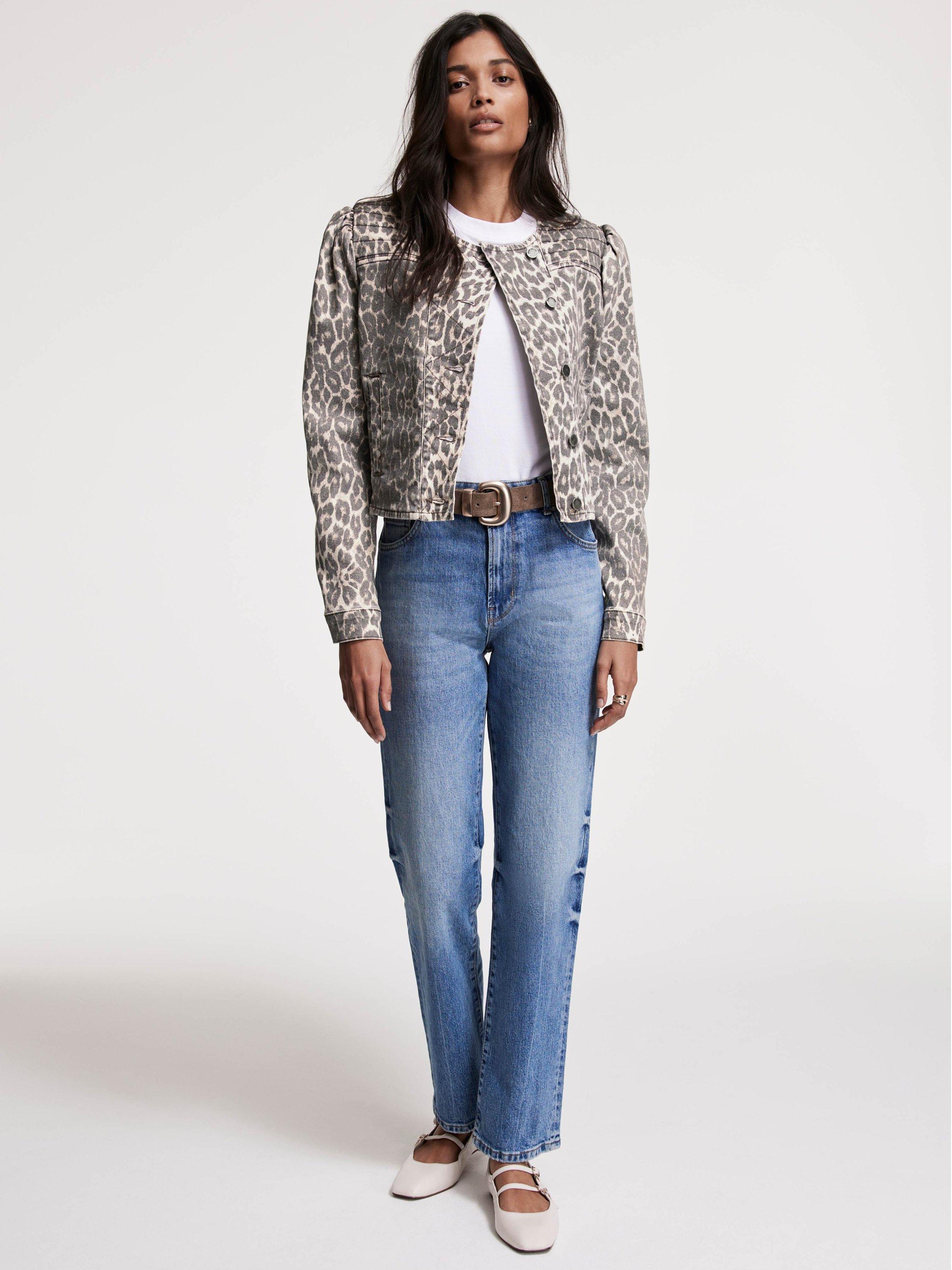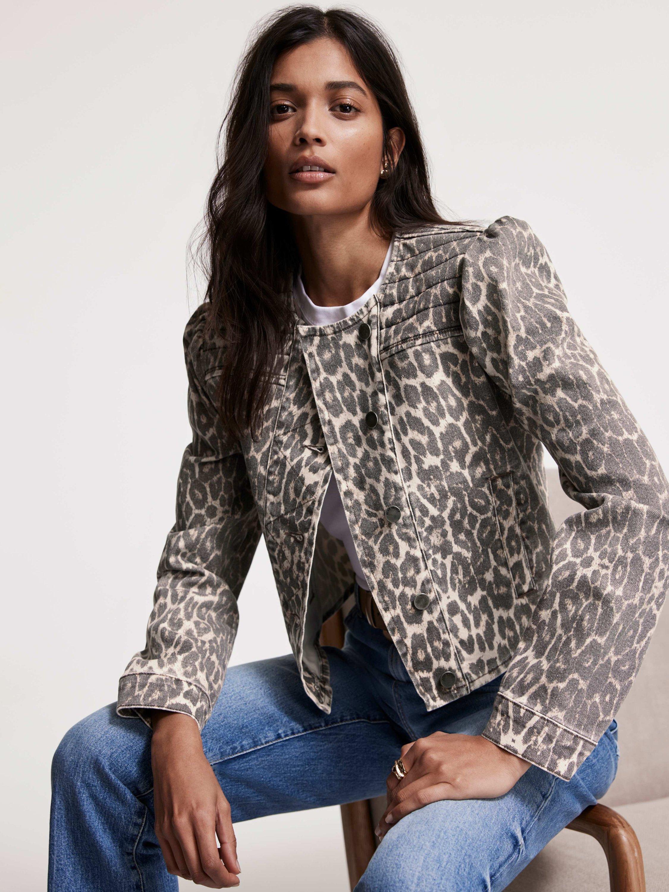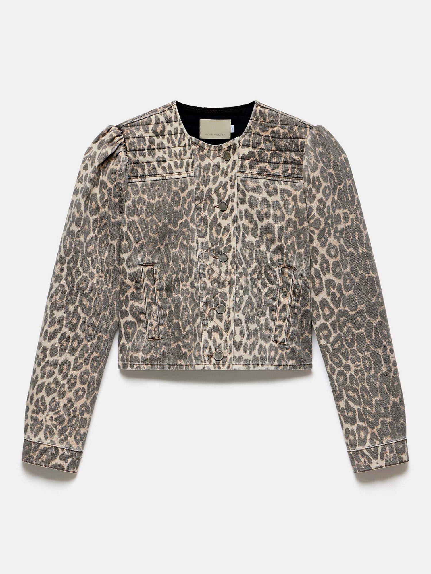 A leopard print jacket with a crew neckline, stitch panelling, puff shoulders, long sleeves, buttoned cuffs, welt pockets and an asymmetric button fastening through the front.