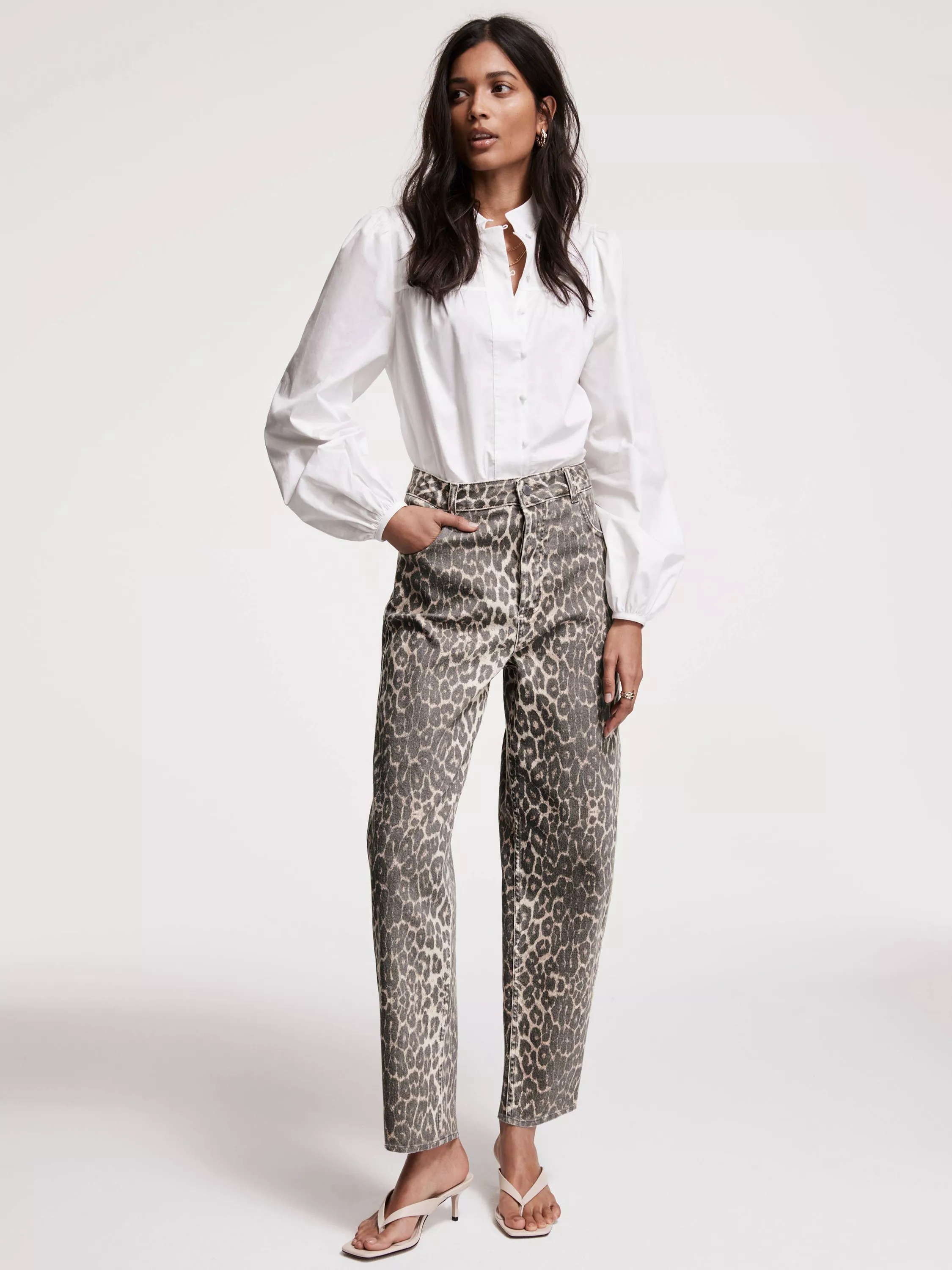 Leopard print jeans in a high rise silhouette featuring belt loops, a five-pocket construction, tapered leg, ankle-grazing hemlines with a concealed zip fly and button fastening.