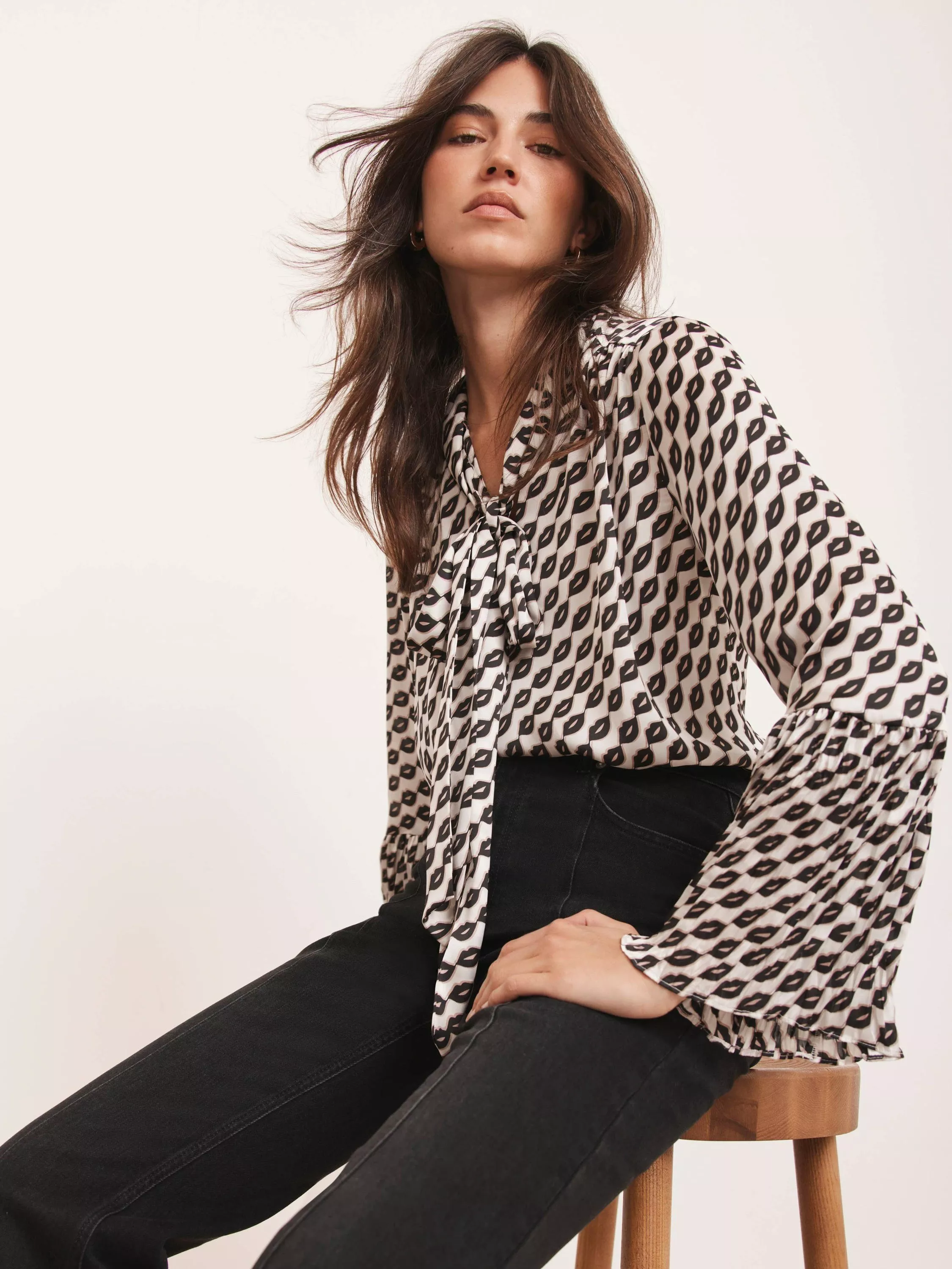 A lip print blouse featuring a pussy bow neckline, long sleeves and fluted crinkle cuffs.