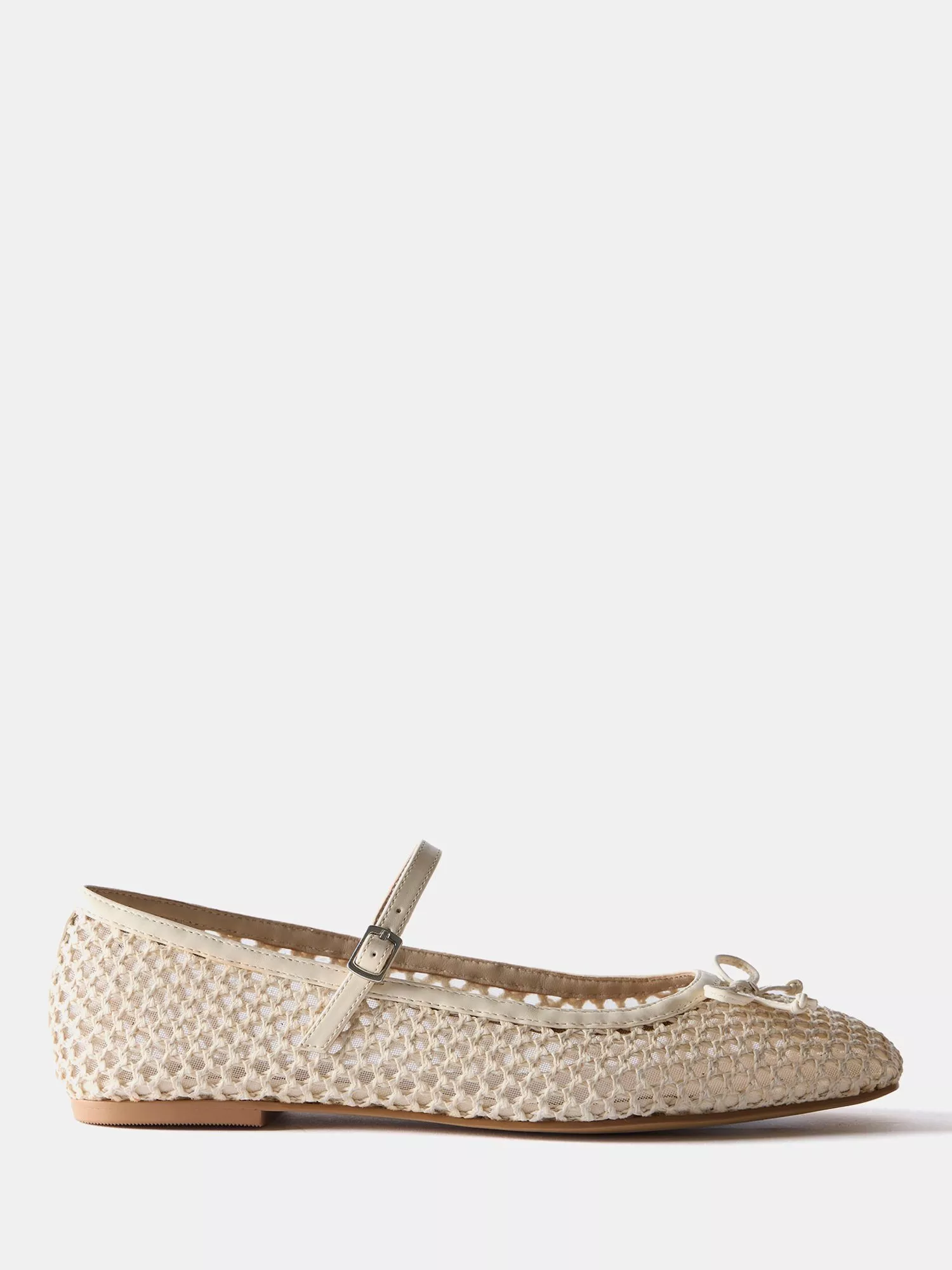 An everyday favourite in summer, this pair of ballerina flats by Mint Velvet is made with mesh uppers with a leather sole. Finished with an almond toe, bow detail, thin strap and a buckle fastening through the sides.