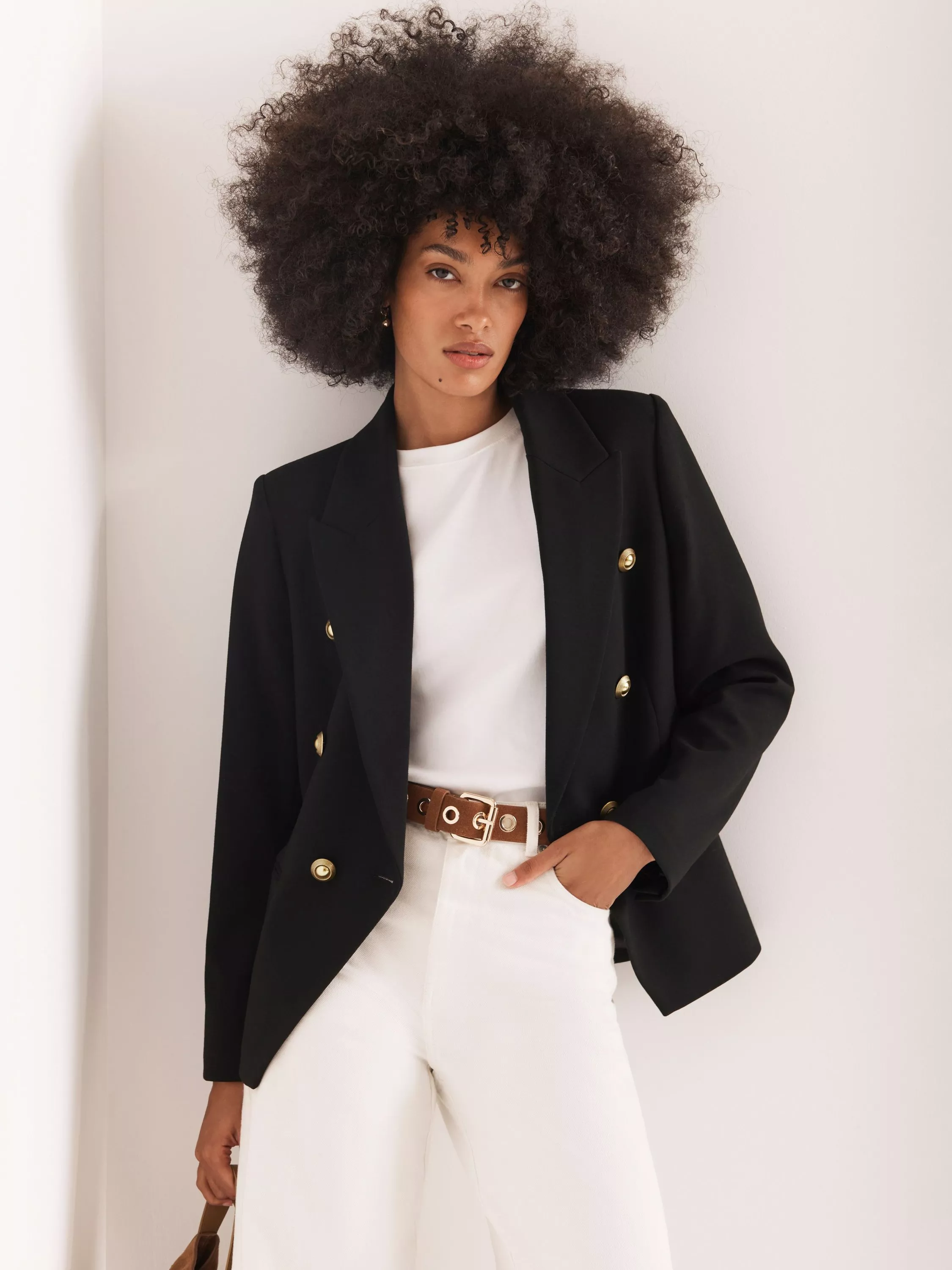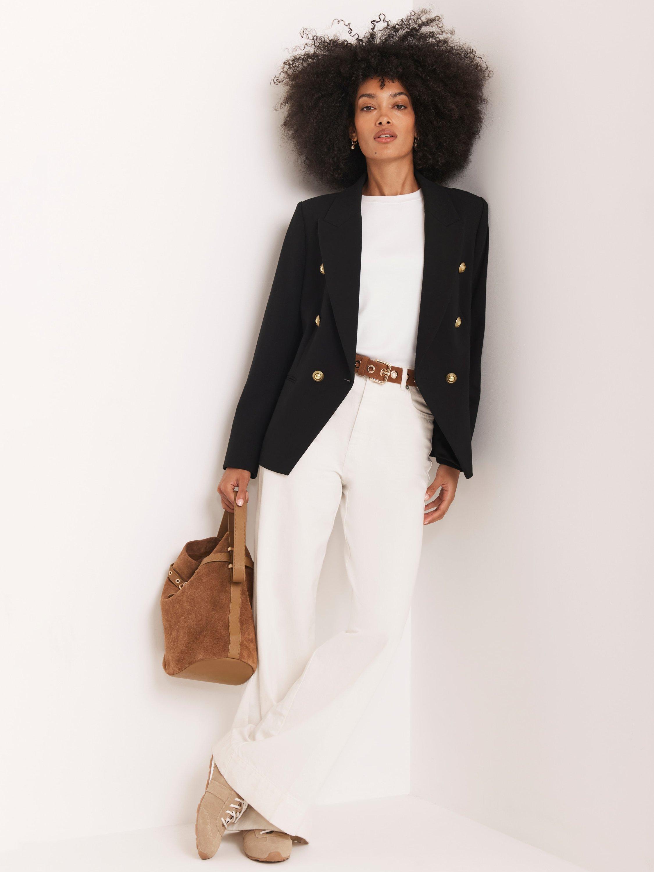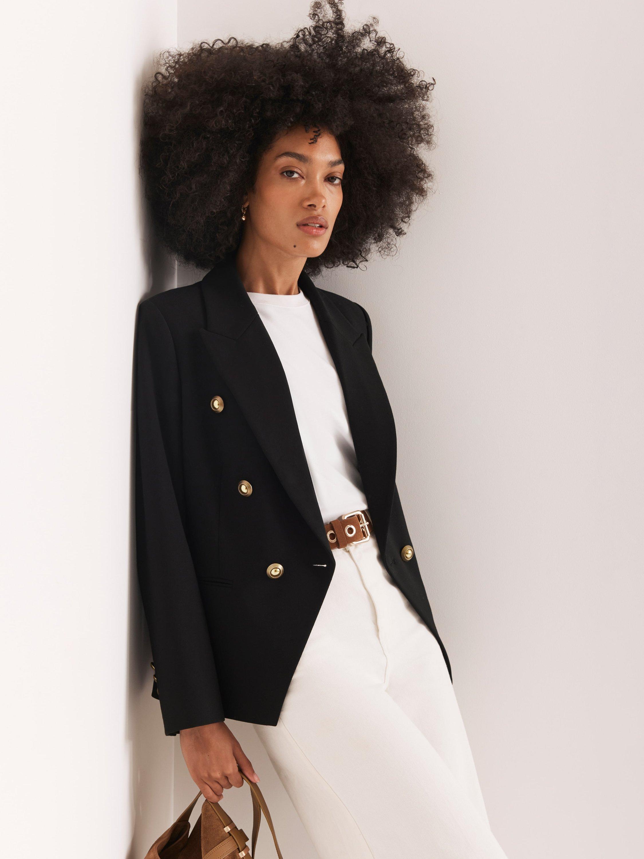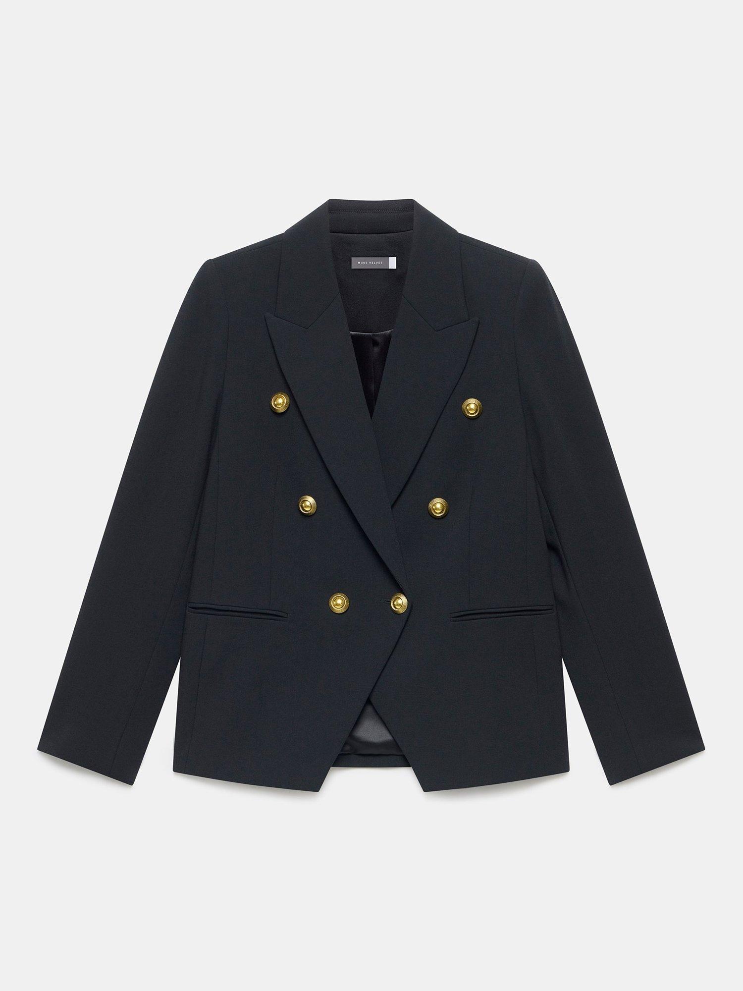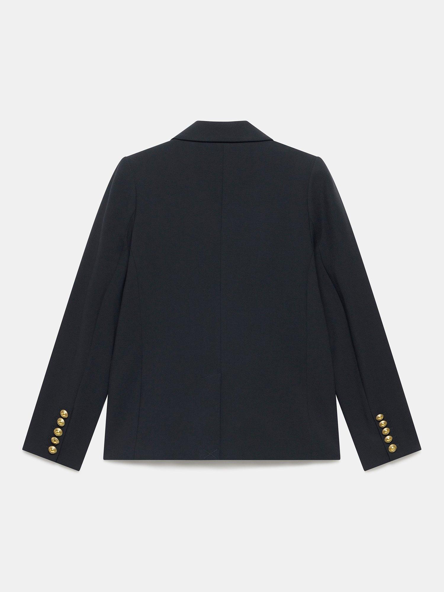 A blazer in a double-breasted silhouette with peaked lapels, long sleeves, buttoned cuffs, welt pockets, with gold-tone military-inspired buttons in a single fastening through the front. Fully lined.