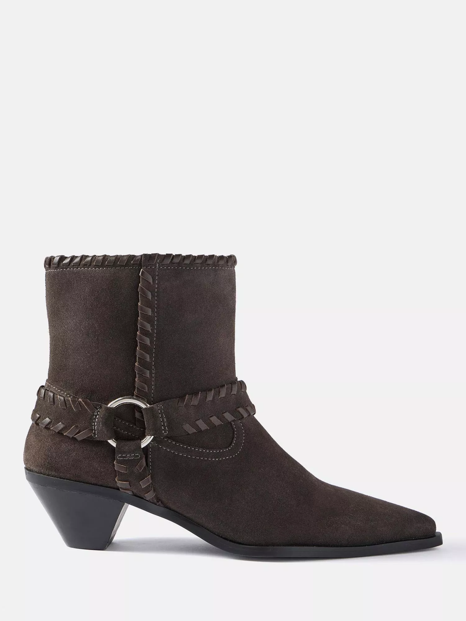 Suede ankle boots with a pointed toe and mid cone heel for comfort and attitude. The zip fastening offers ease, while subtle embellishment sets you apart in every casual moment.