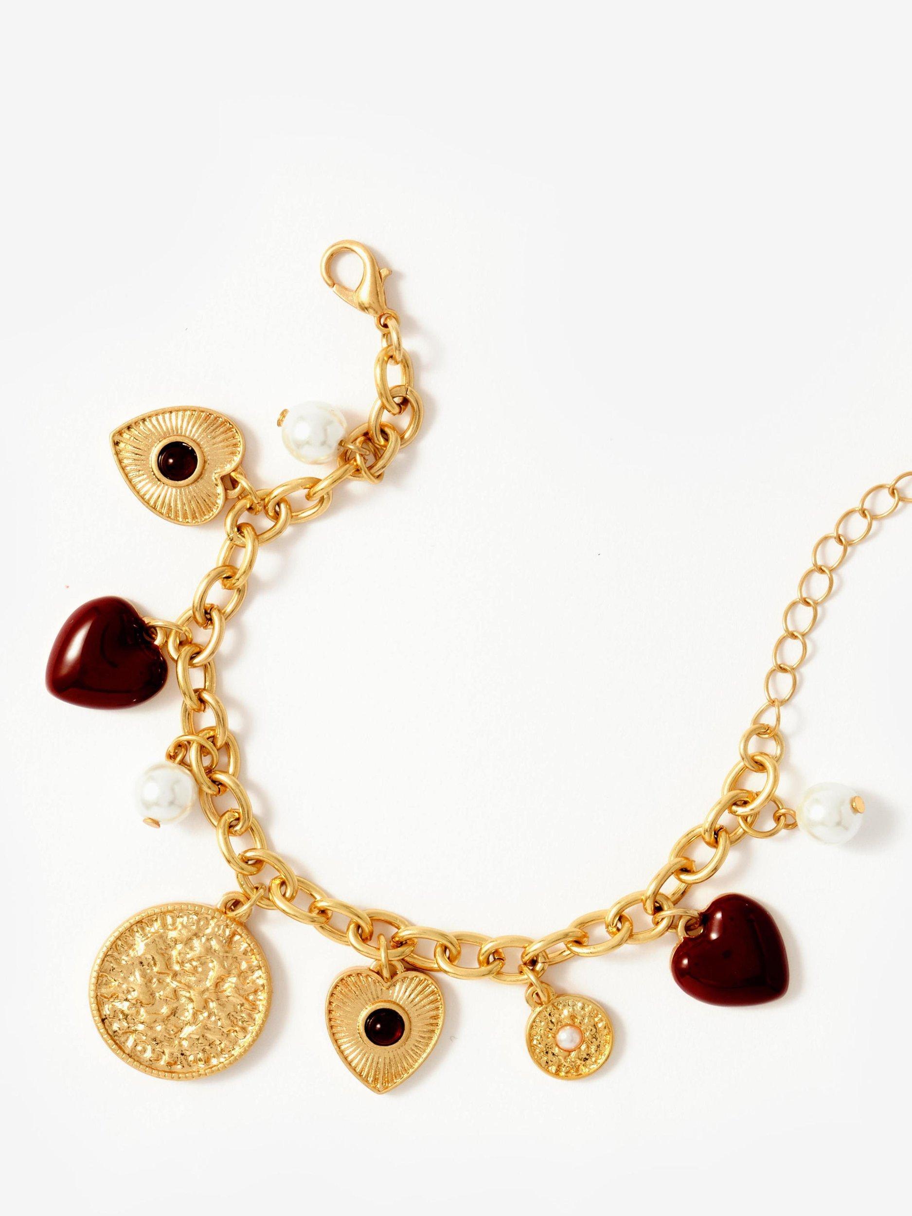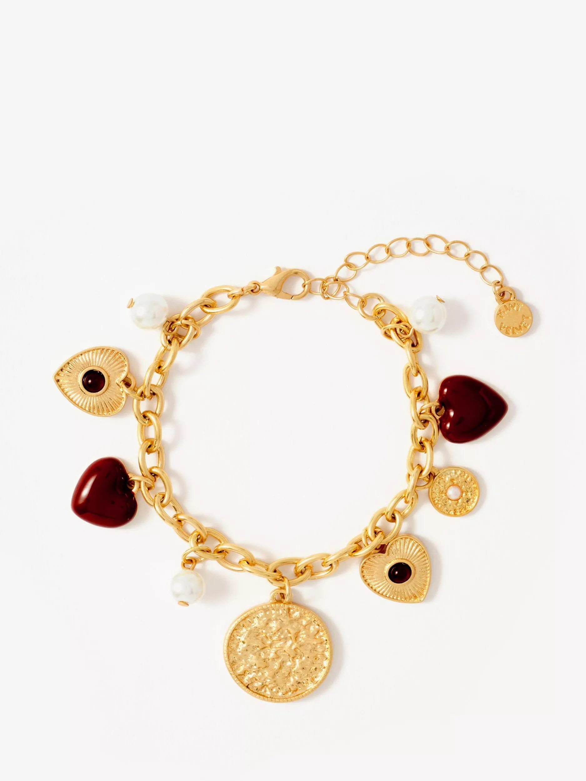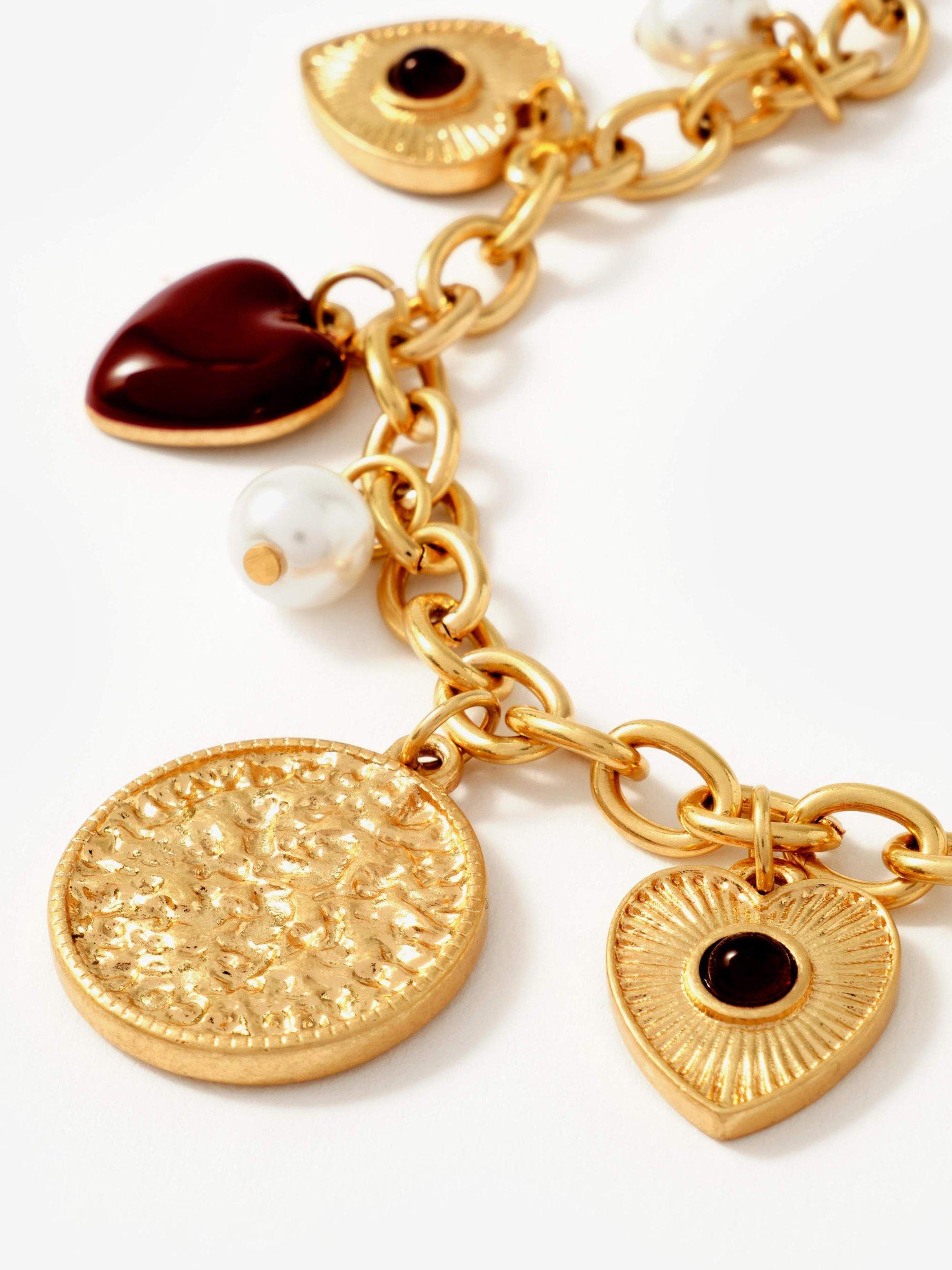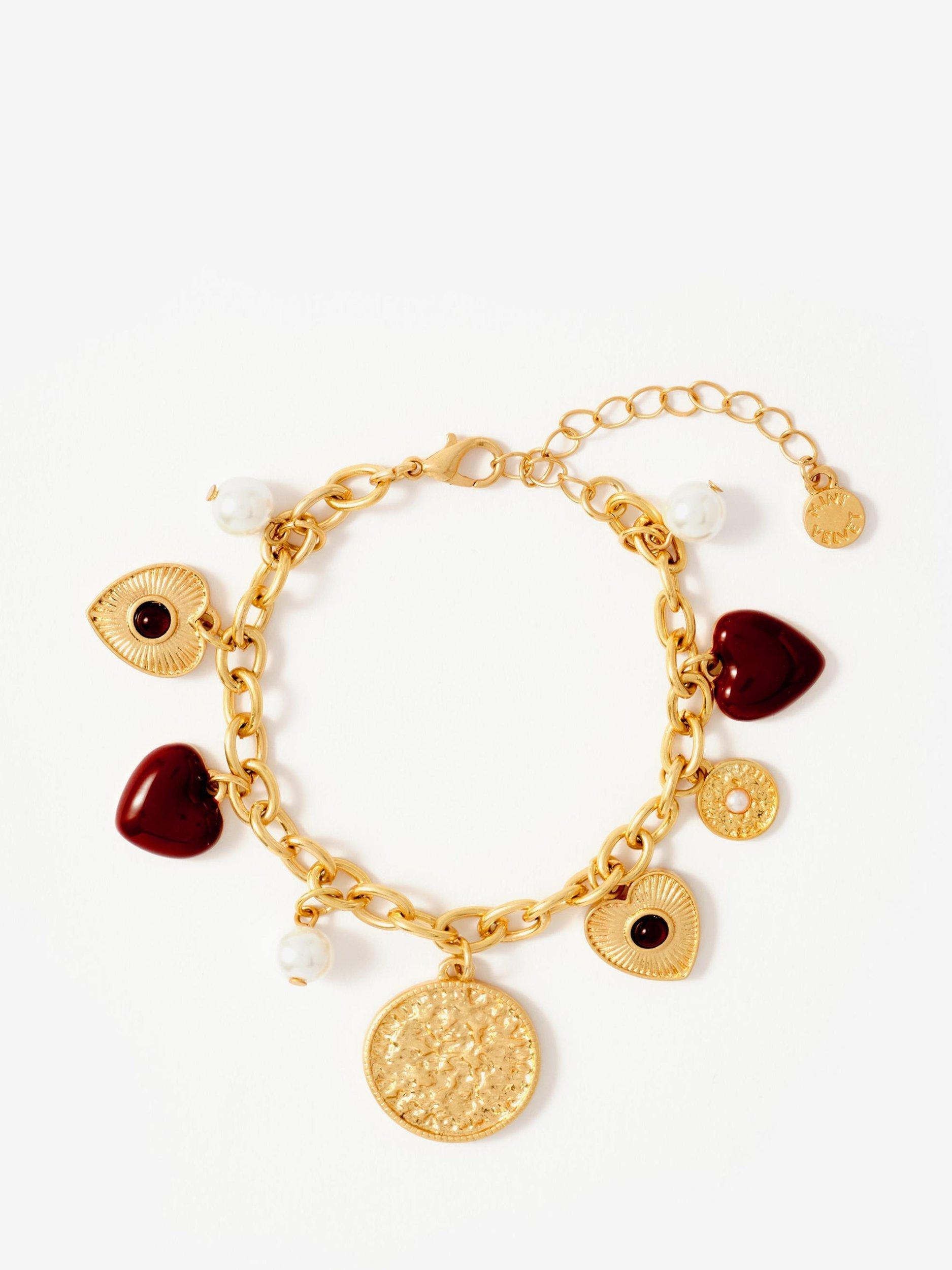 A gold-toned multi-charm bracelet by Mint Velvet, featuring playful heart and coin accents. Secured with an adjustable lobster claw clasp with an extender.