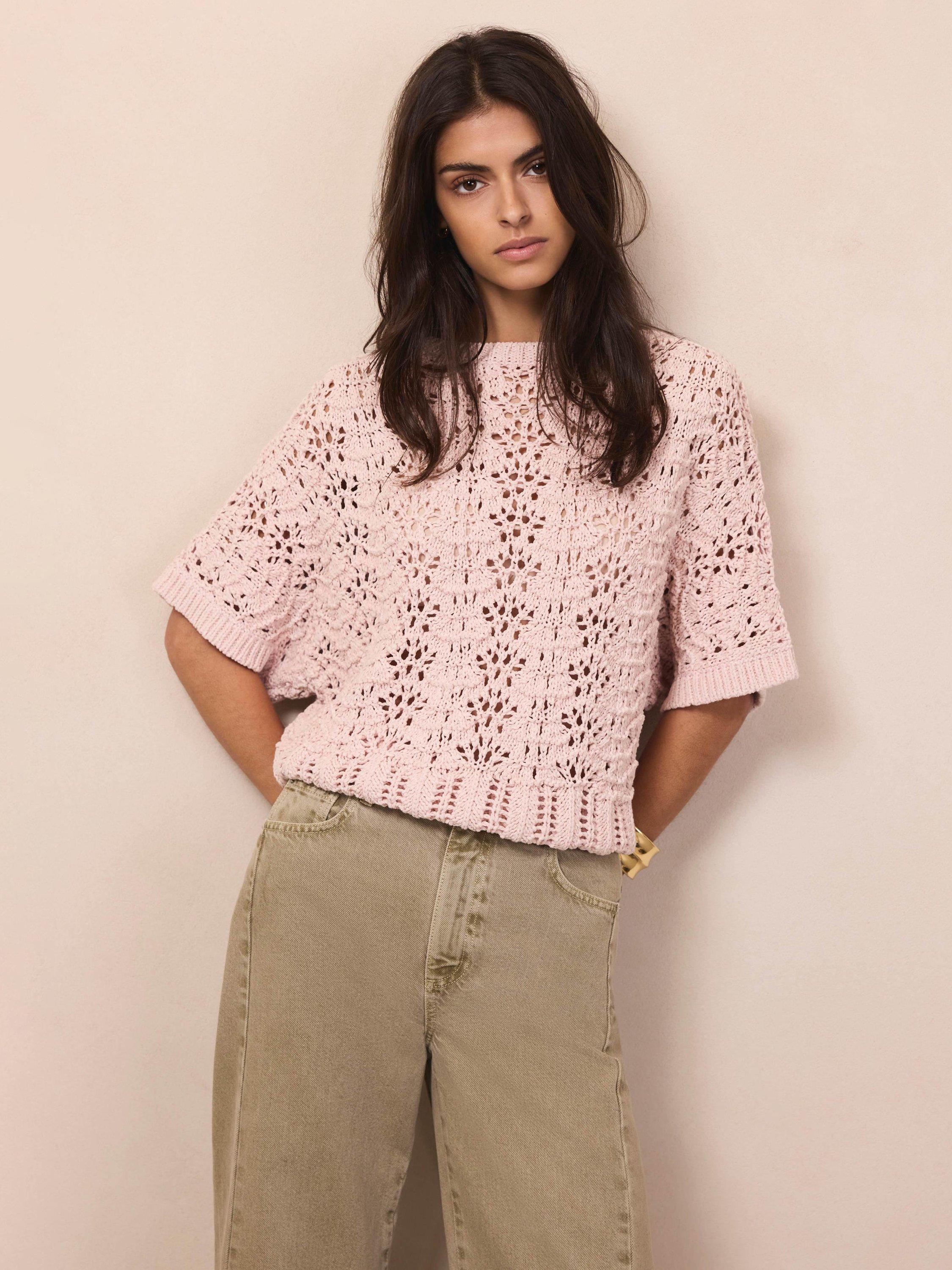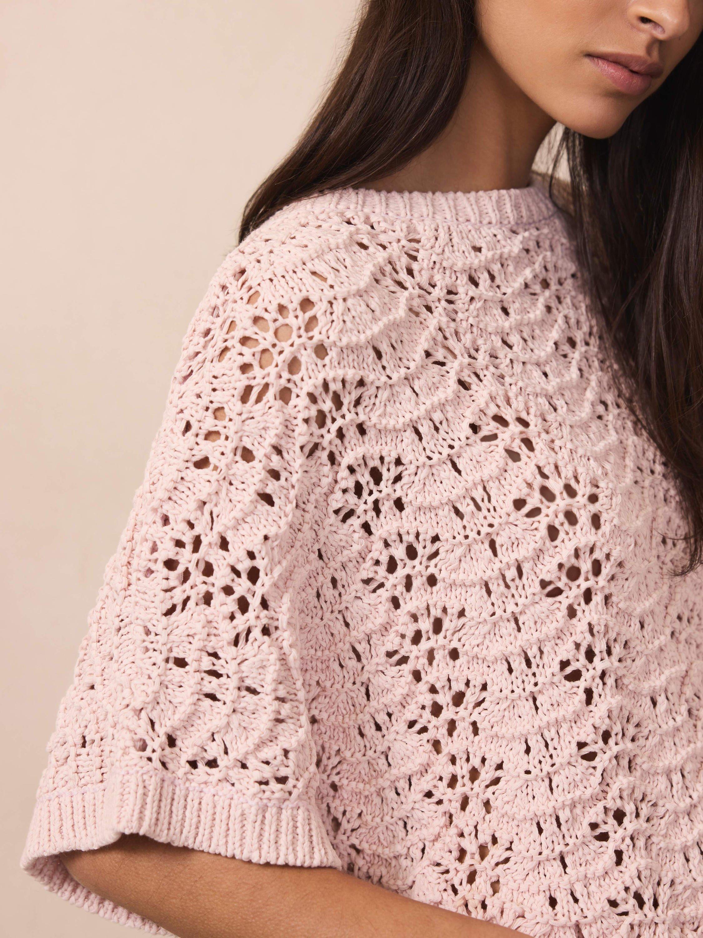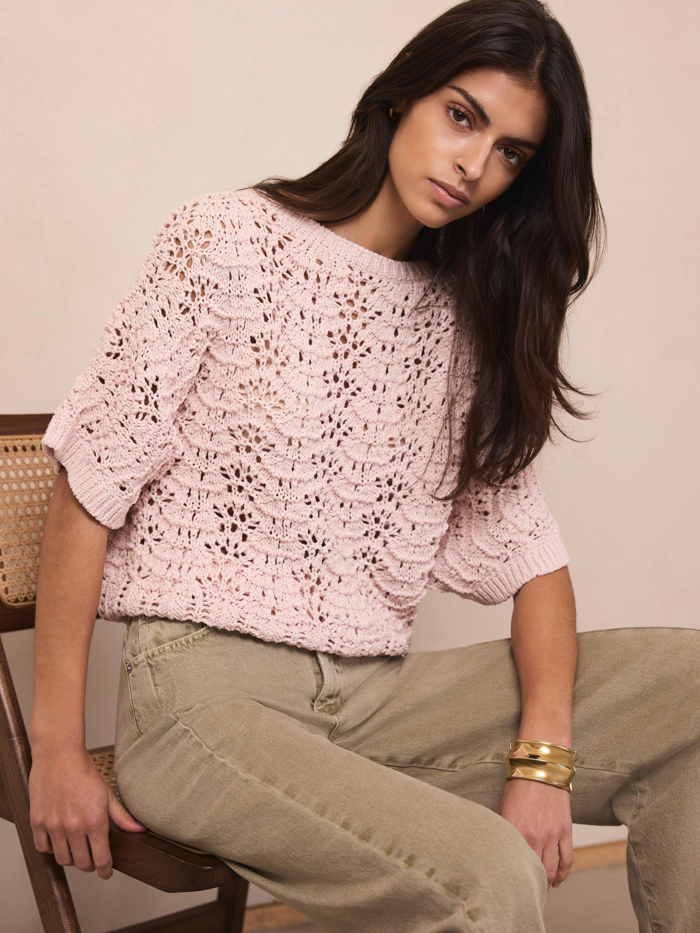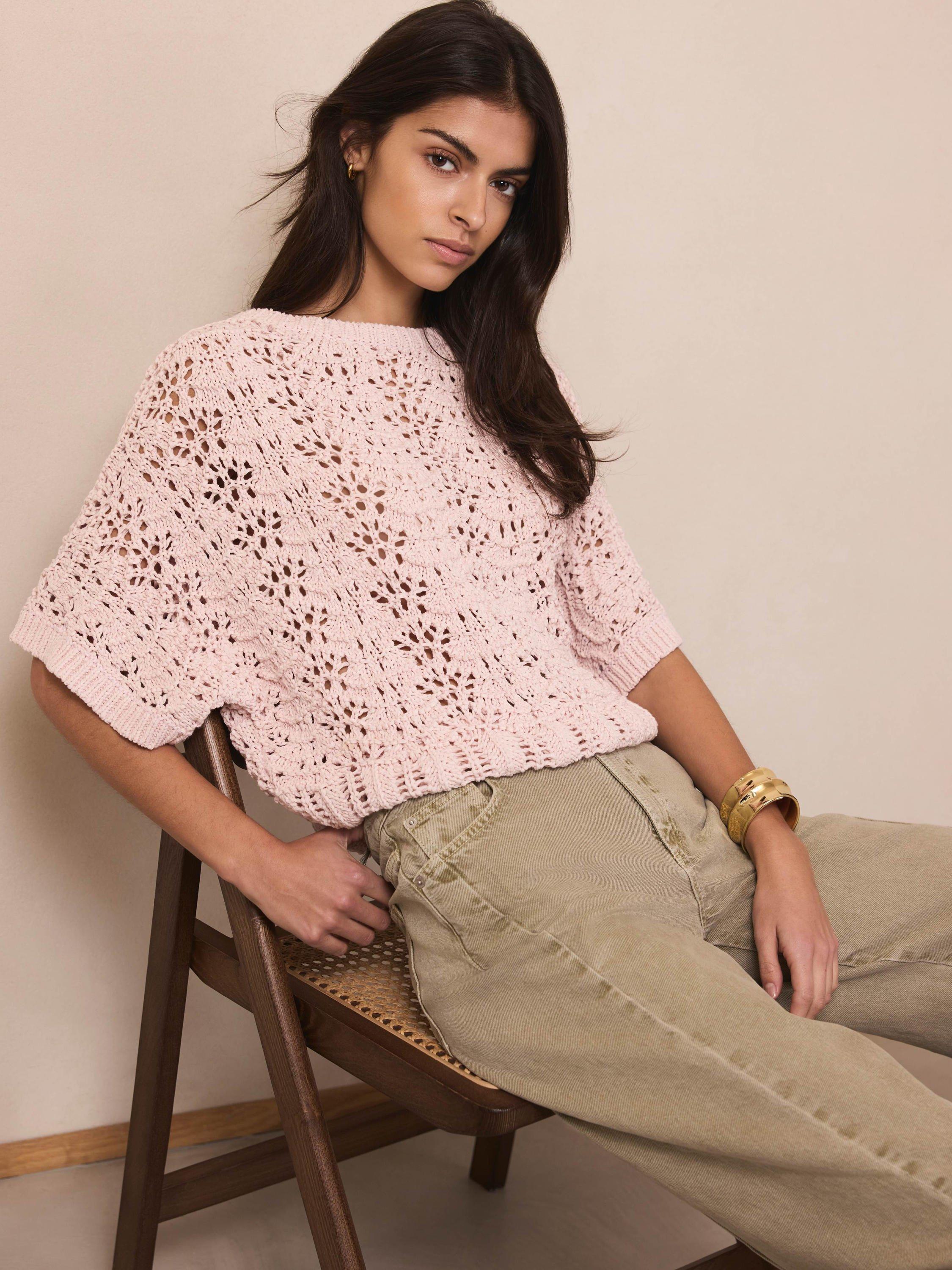 An open stitch top featuring a crew neckline, short sleeves and ribbed trim.