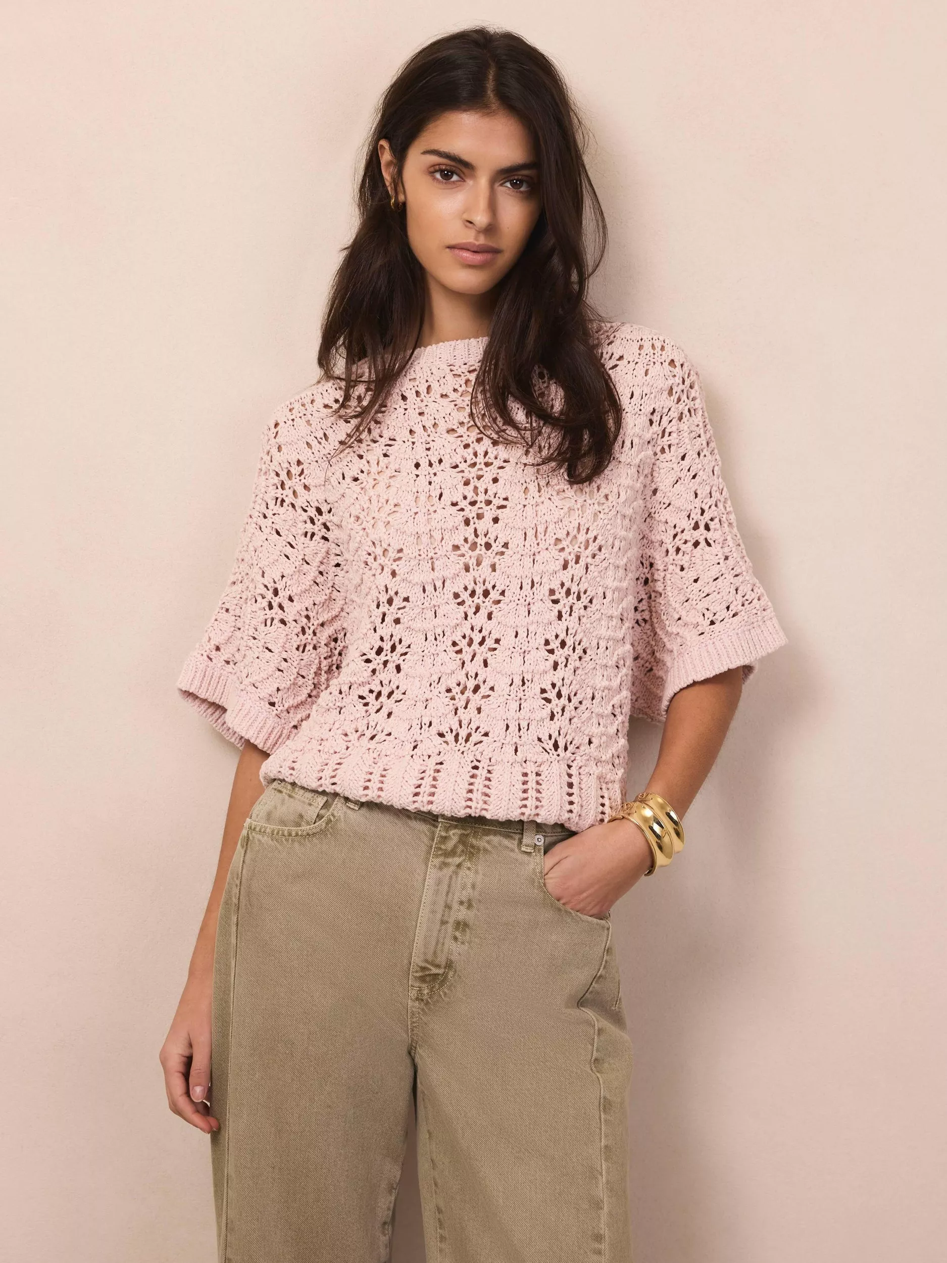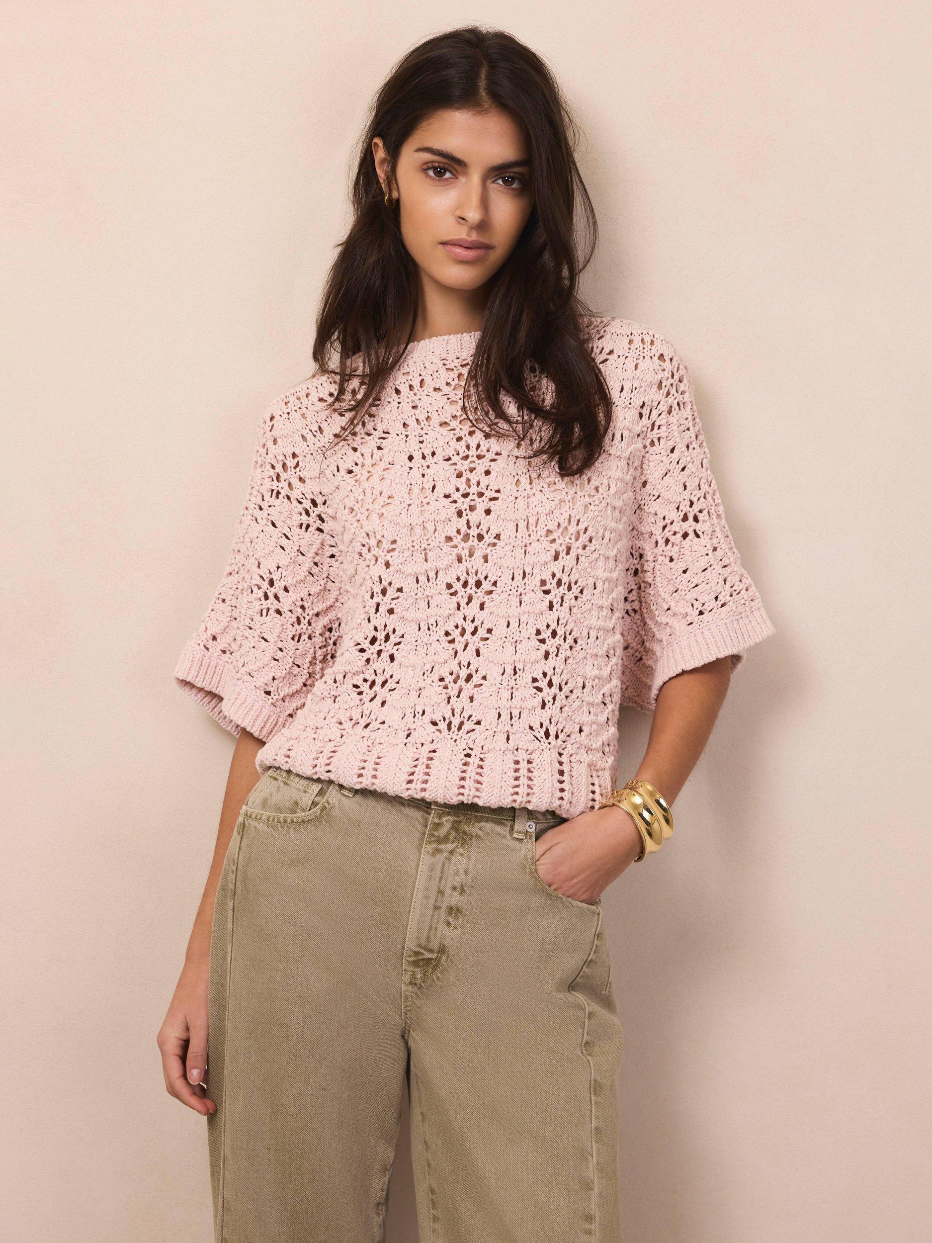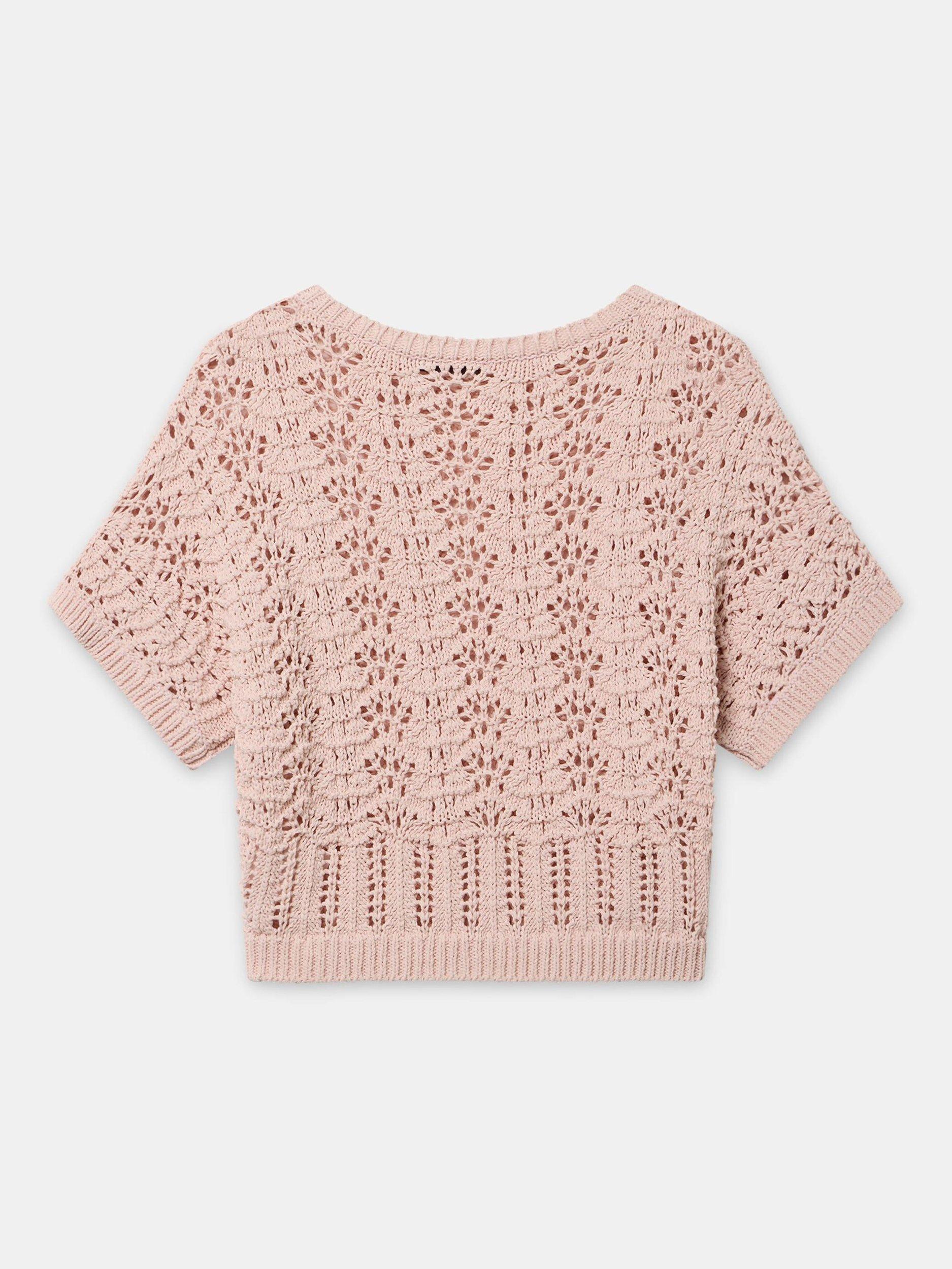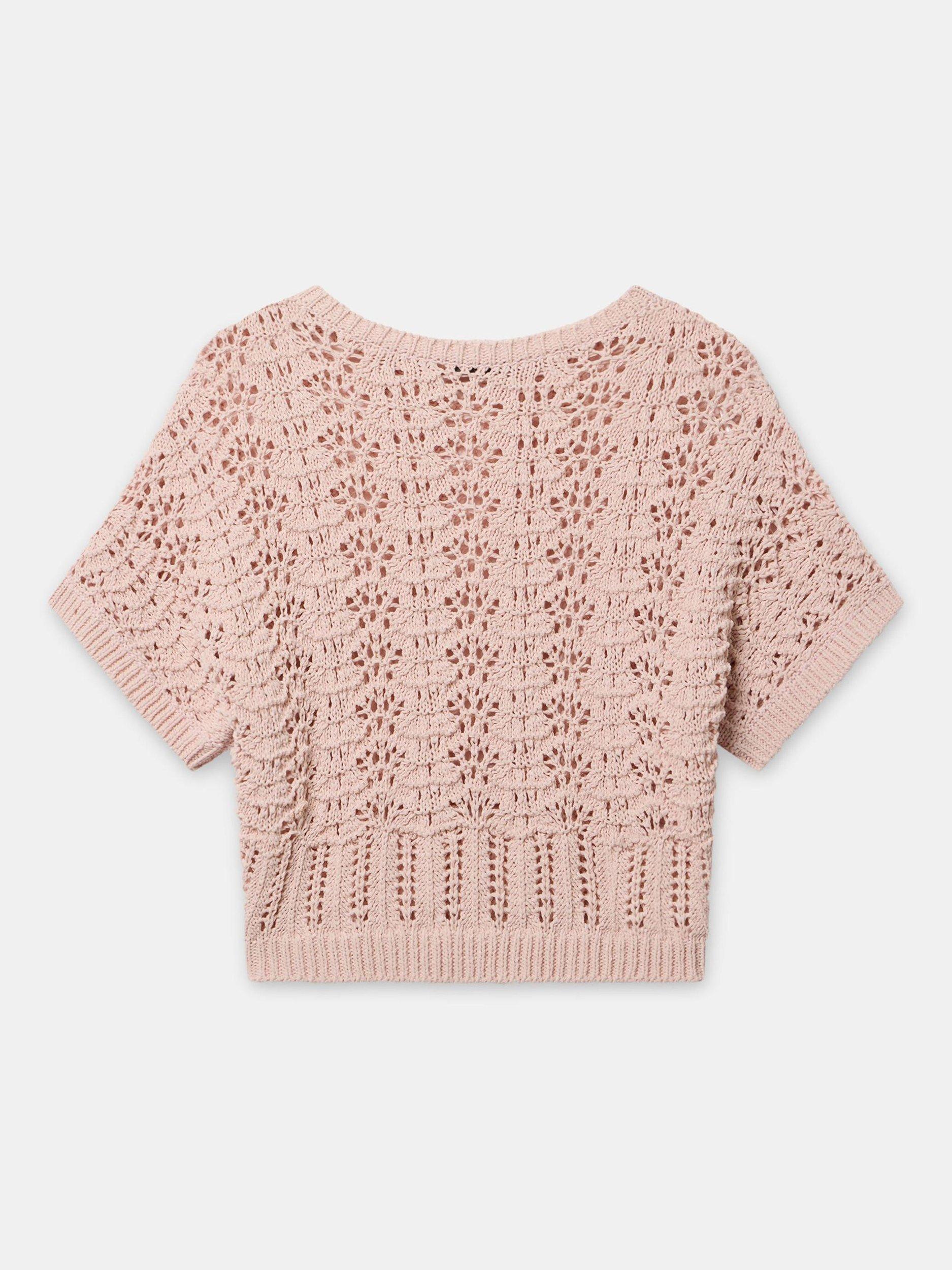 An open stitch top featuring a crew neckline, short sleeves and ribbed trim.