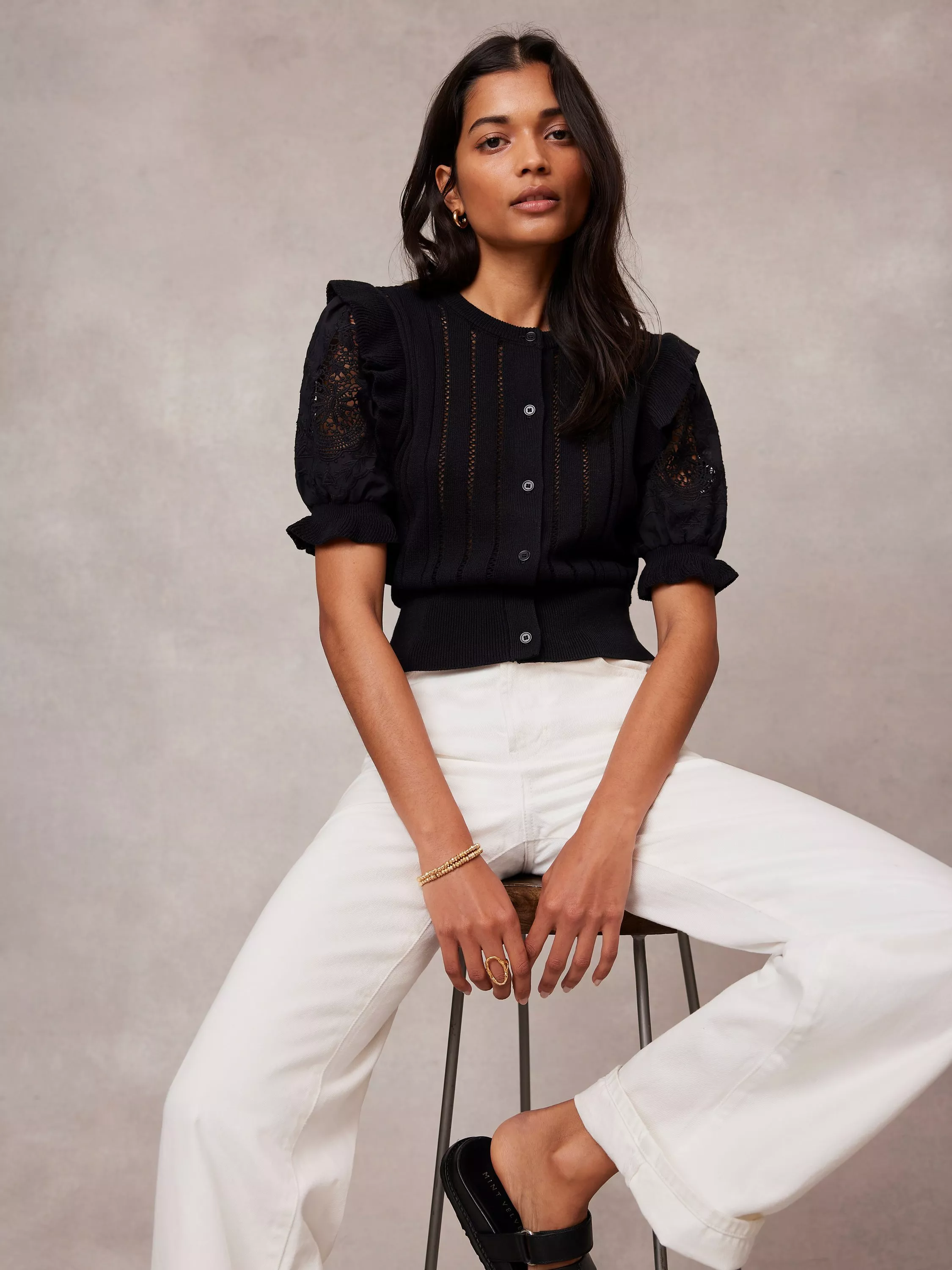 An open stitch top featuring a crew neckline, ruffle shoulders, short crochet detail sleeves with a button fastening through the front.