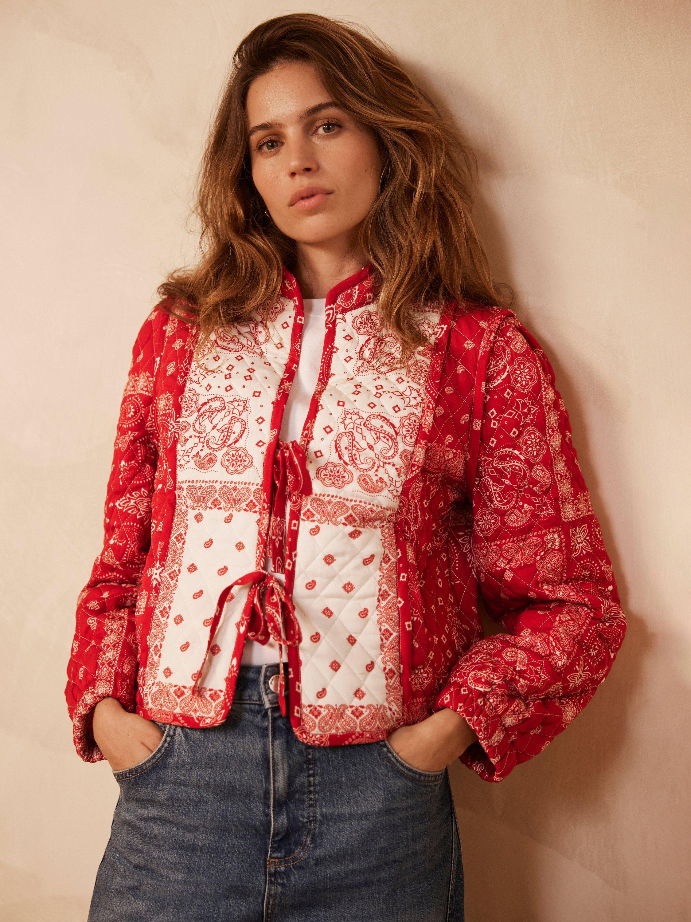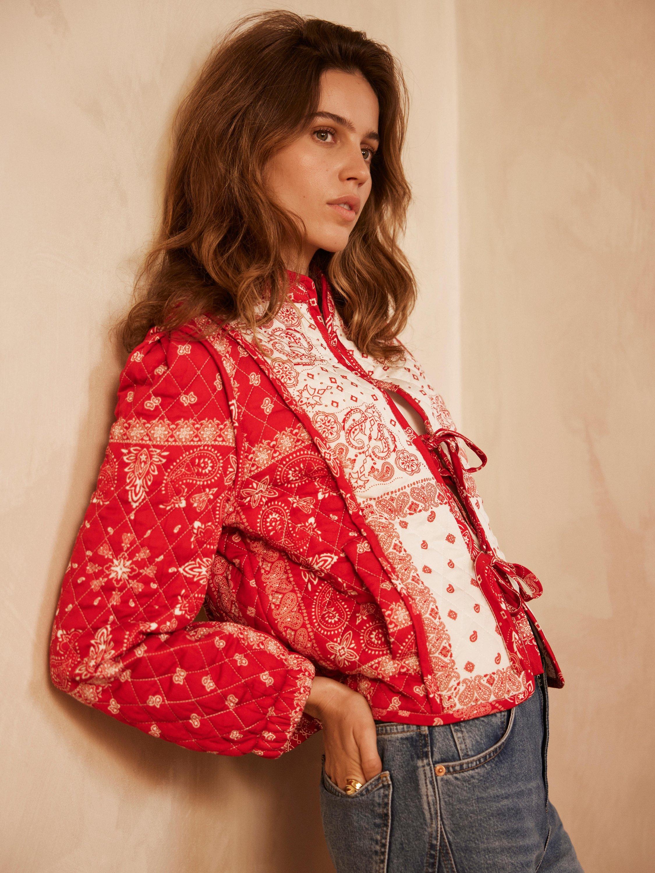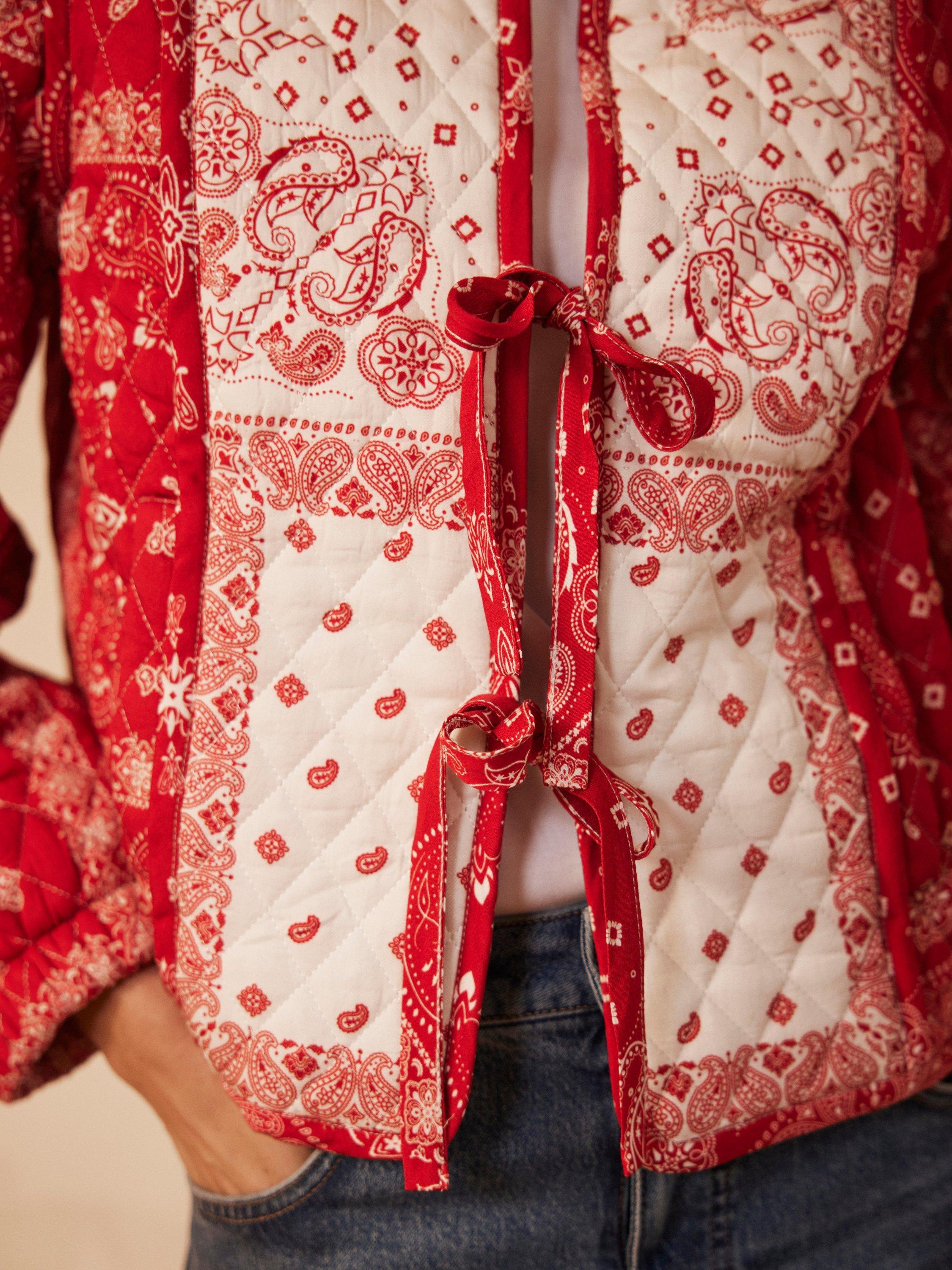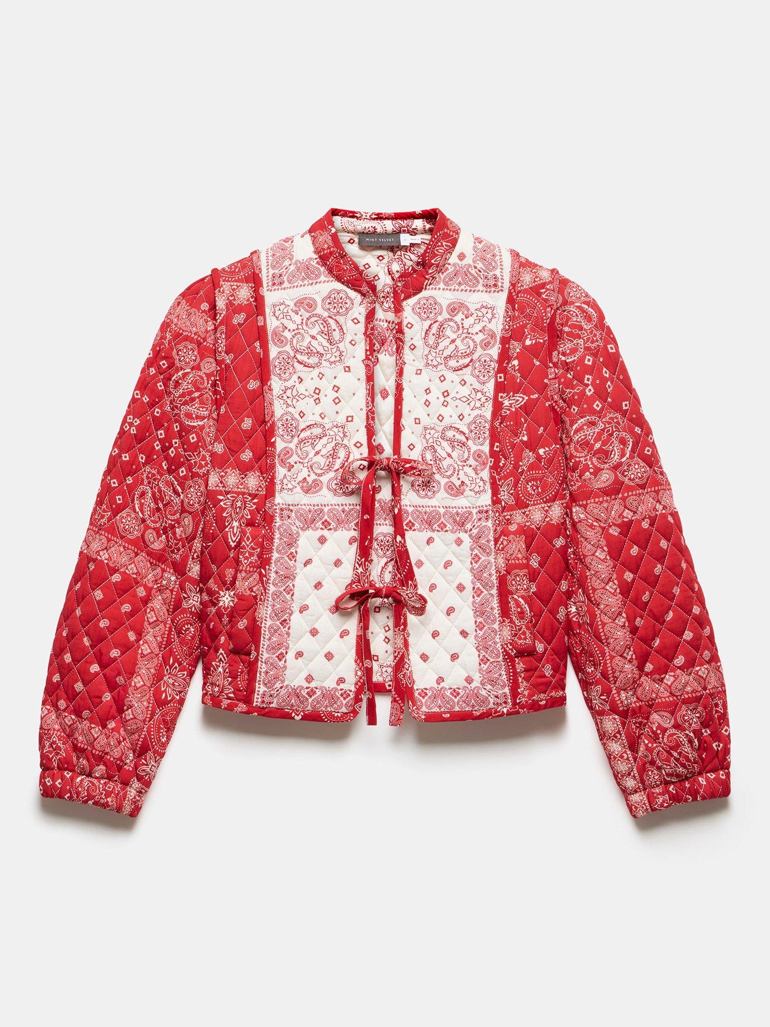 A printed jacket with a high neckline, long sleeves, welt pockets and tie fastenings through the front.