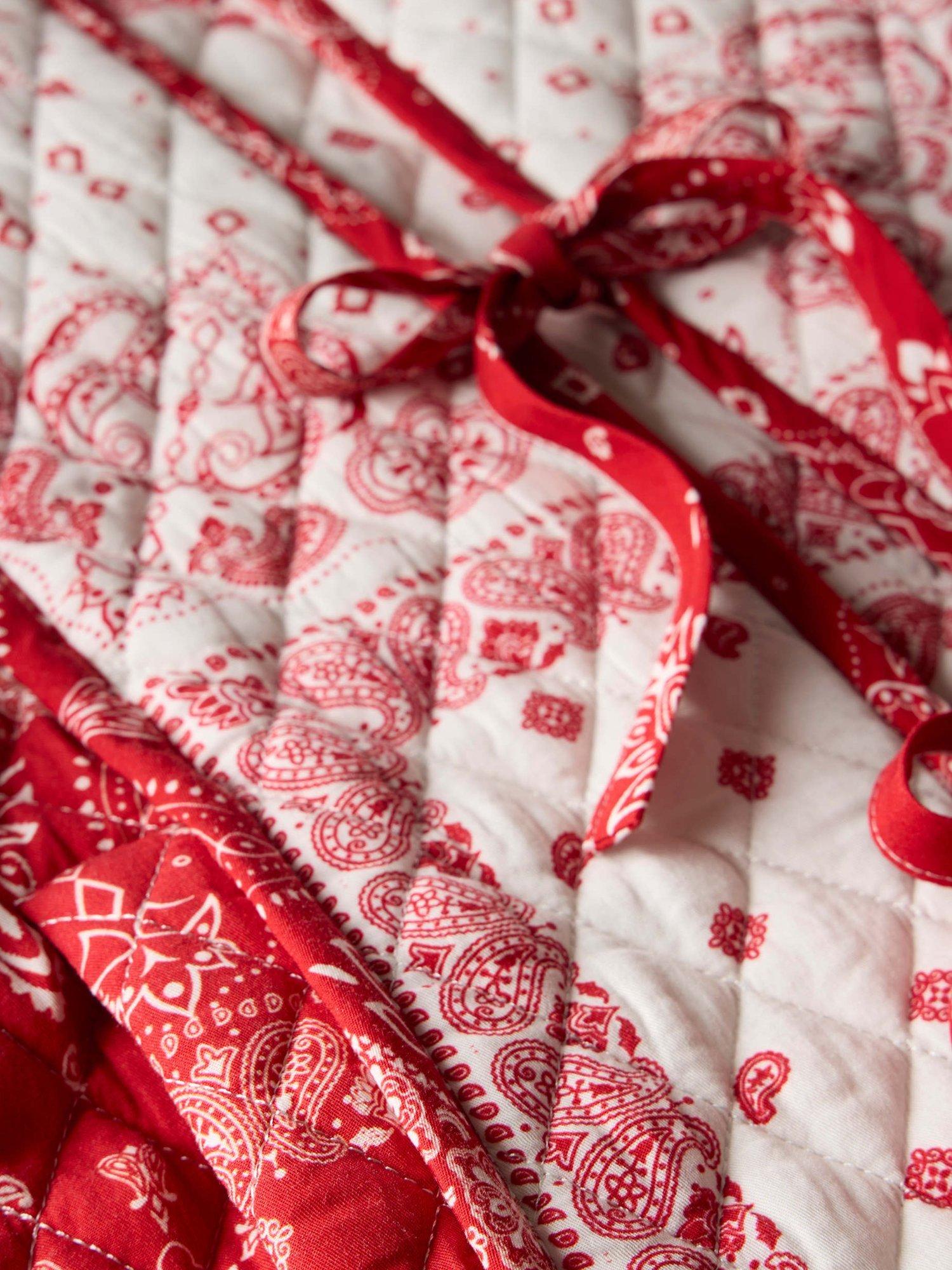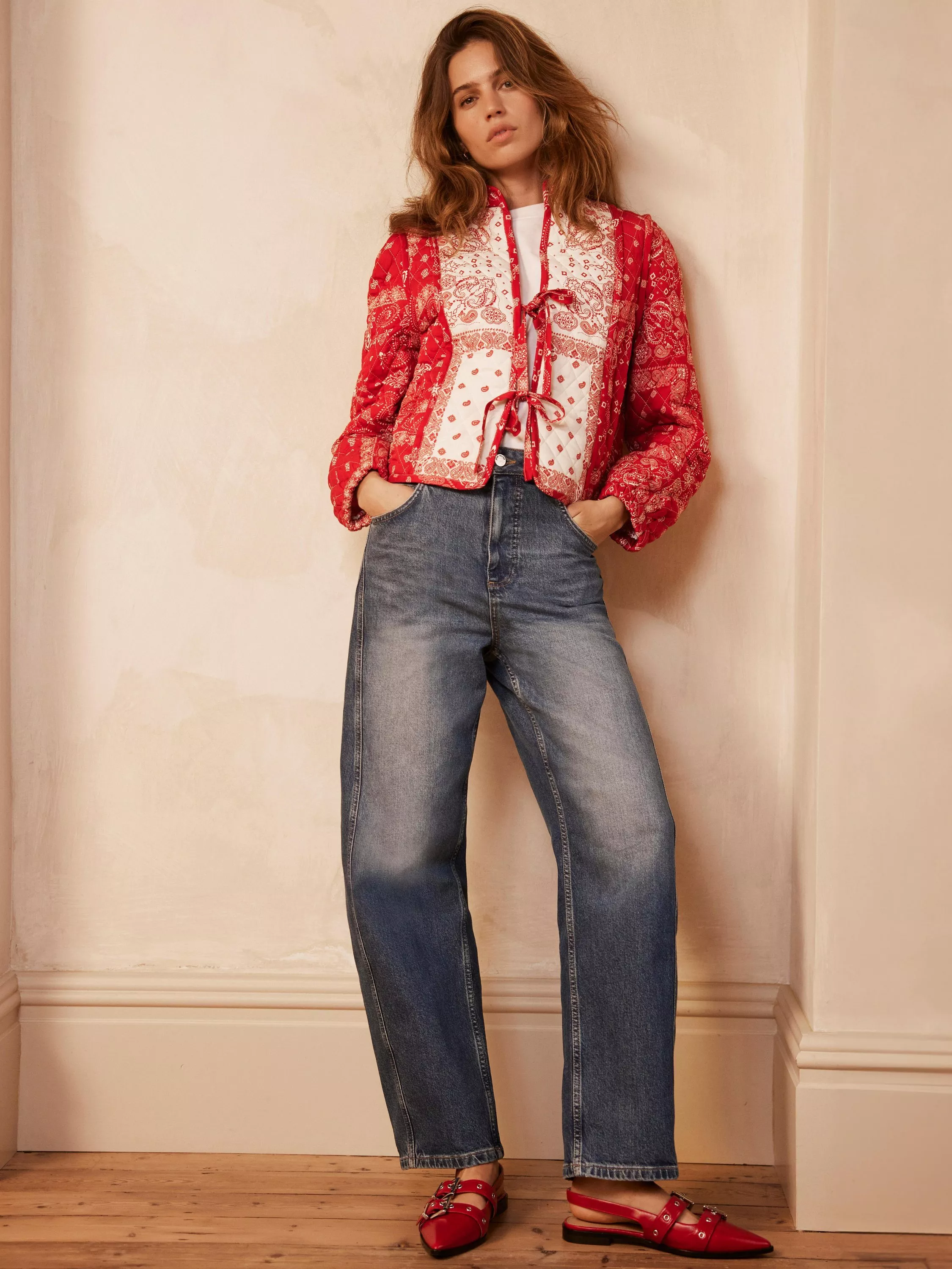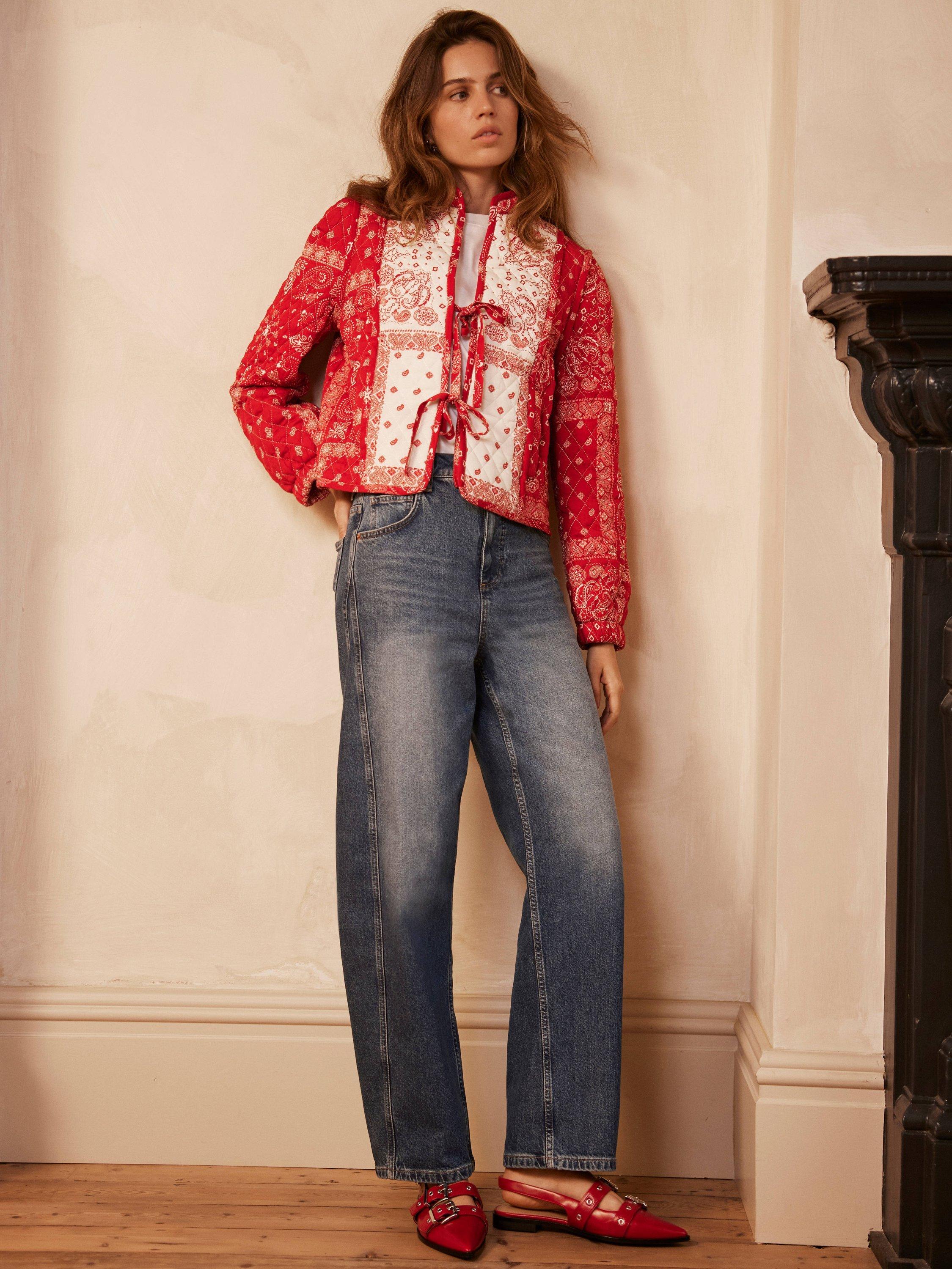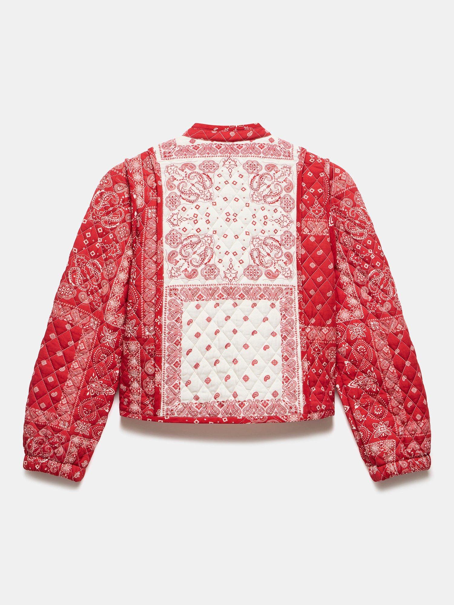 A printed jacket with a high neckline, long sleeves, welt pockets and tie fastenings through the front.