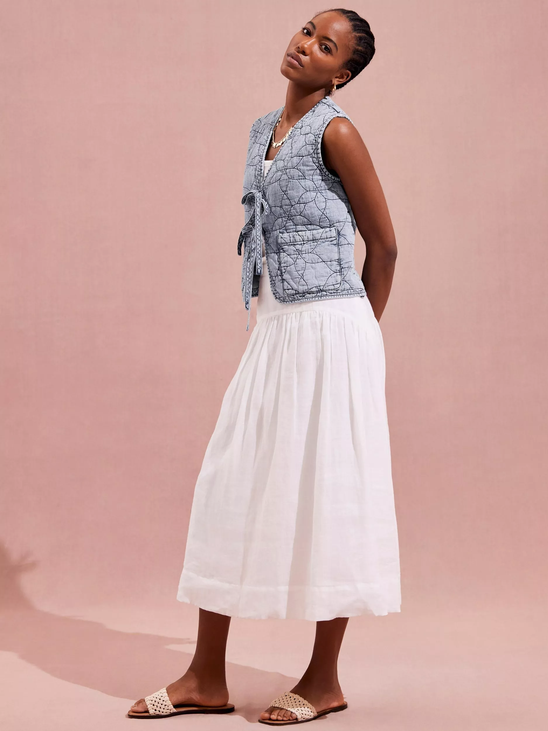 A pure cotton quilted gilet with a V-neckline, square pockets with a double tie fastening through the front.