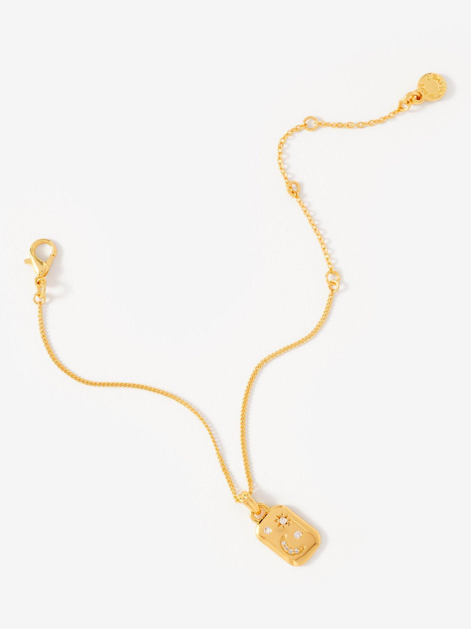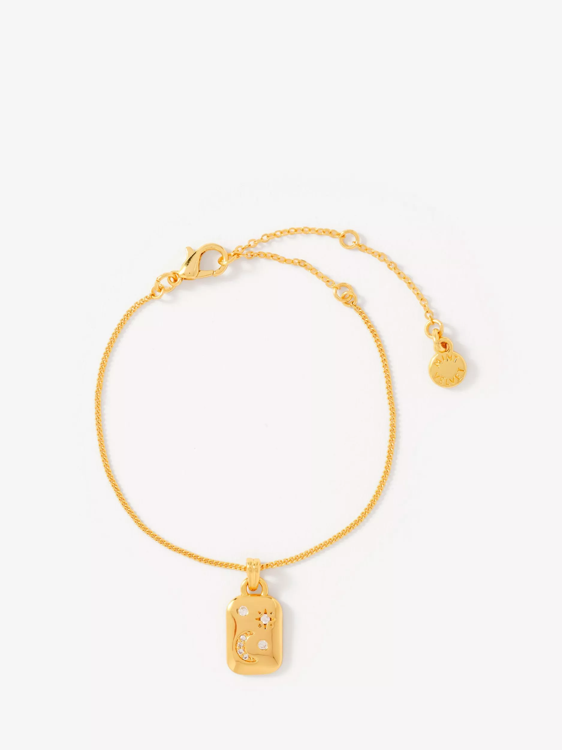 This Mint Velvet gold-plated chain bracelet features a rectangular pendant with pave moon and star detailing with sparkling cubic zirconia for a refined accent. Secures easily with a lobster claw fastening, making your everyday style effortless and polished.