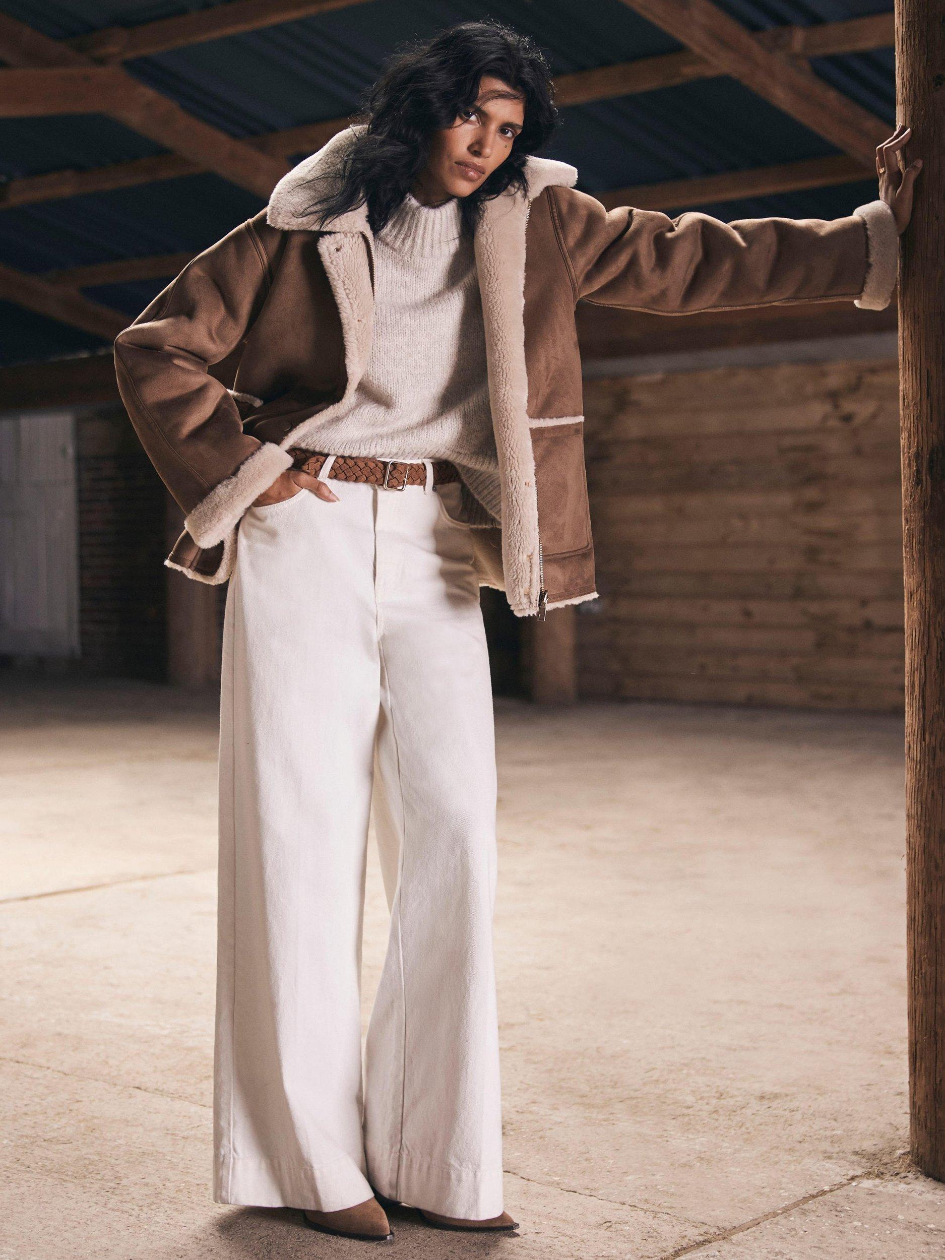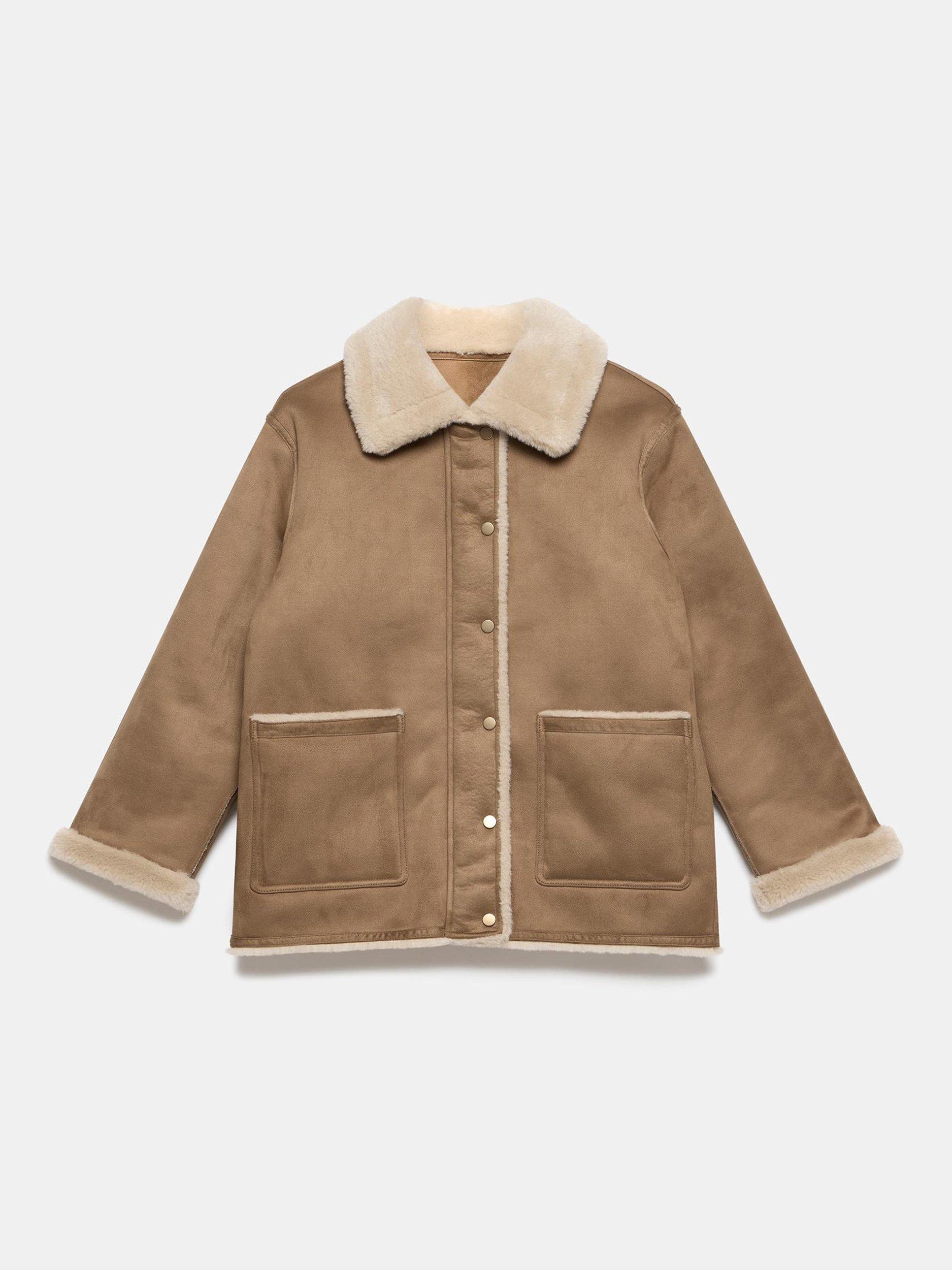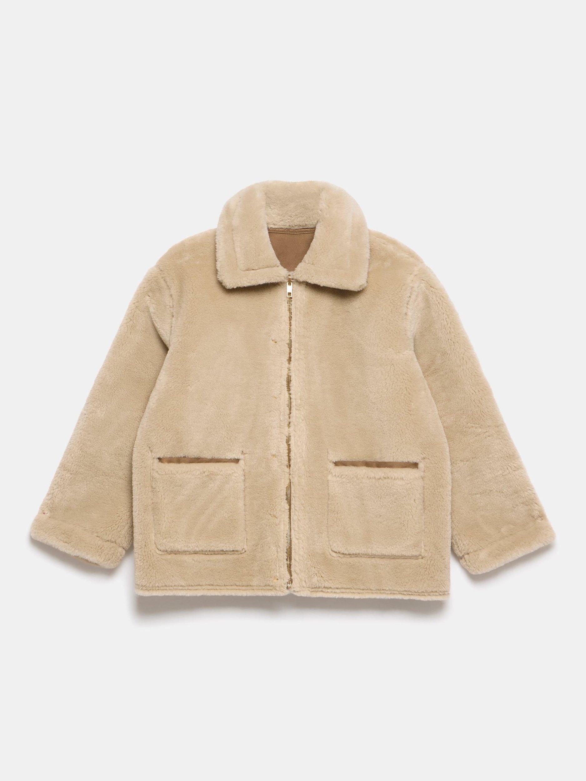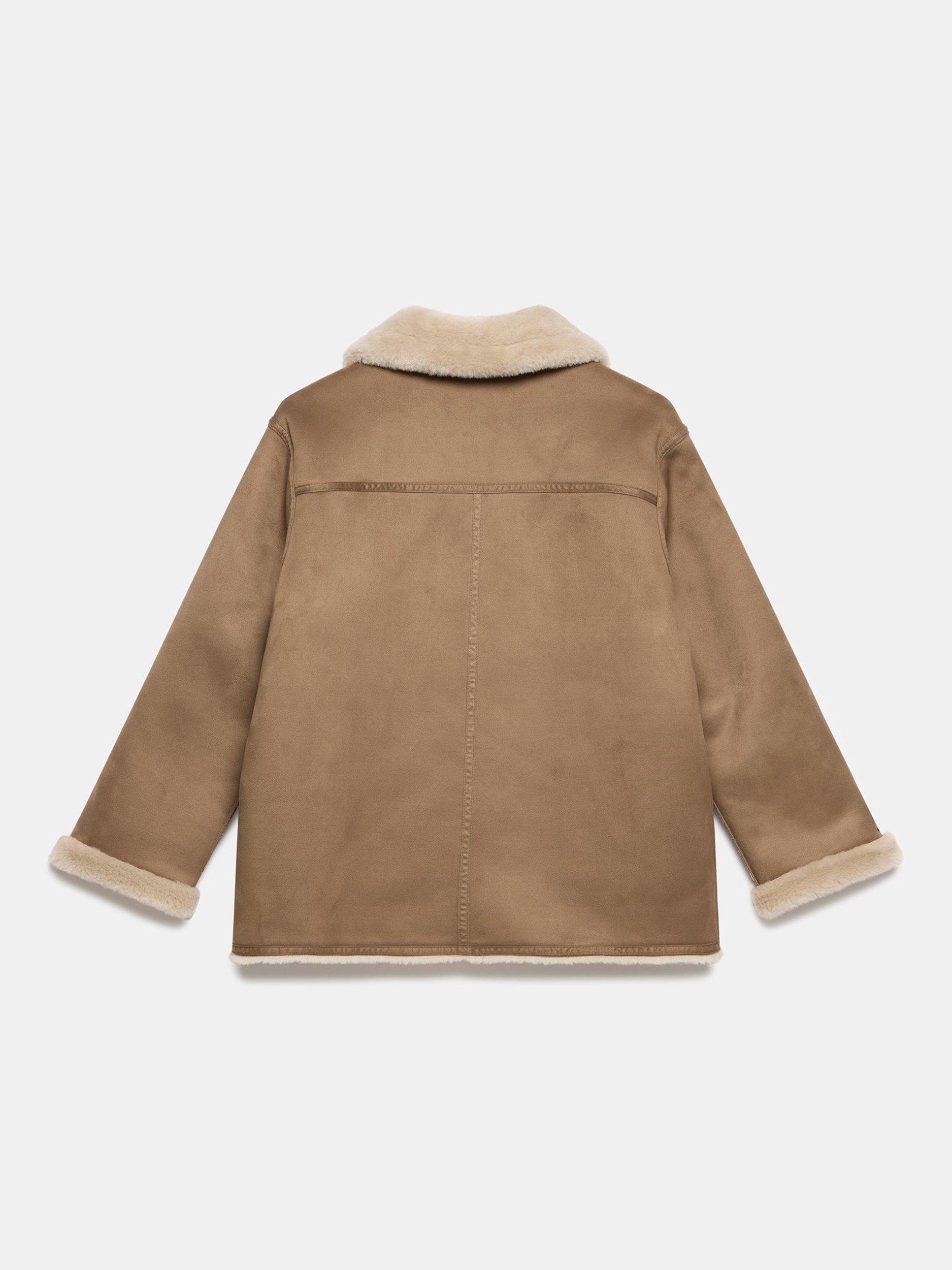 A reversible aviator style jacket featuring a wide collar, long sleeves, square pockets, contrast lining with a zip and popper fastening through the front.